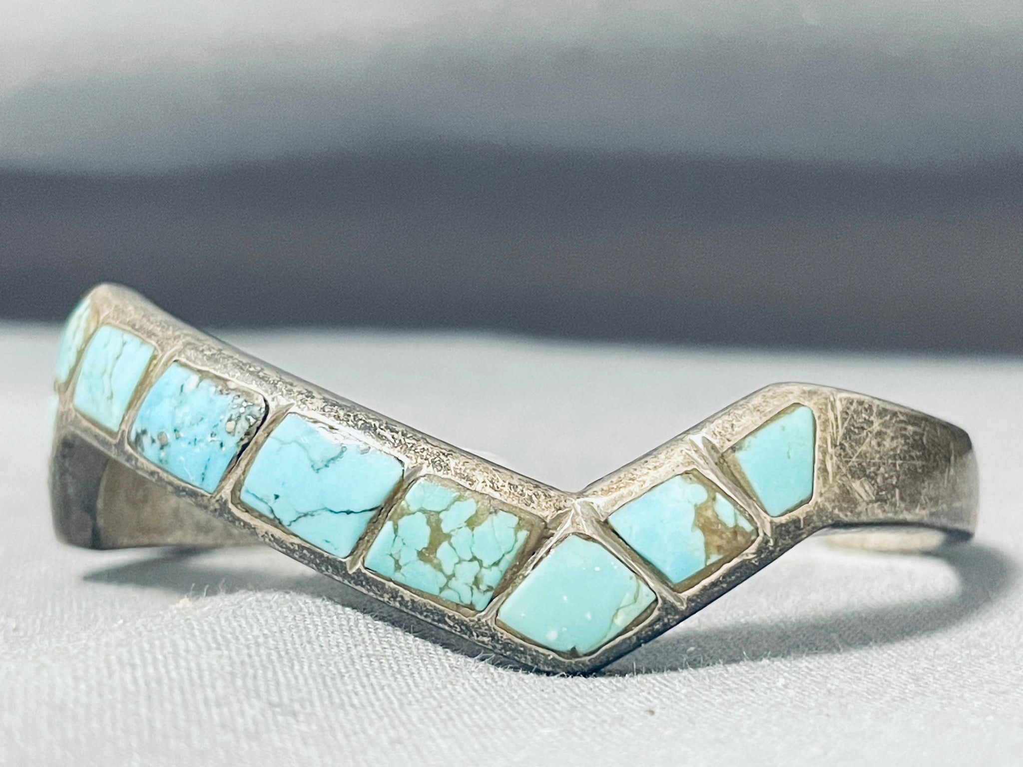 Breathtaking Vintage Native American Navajo Inlay Turquoise Sterling Silver Zigzag Bracelet