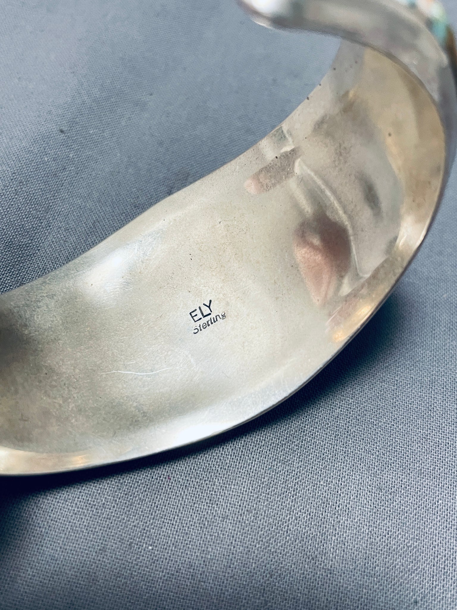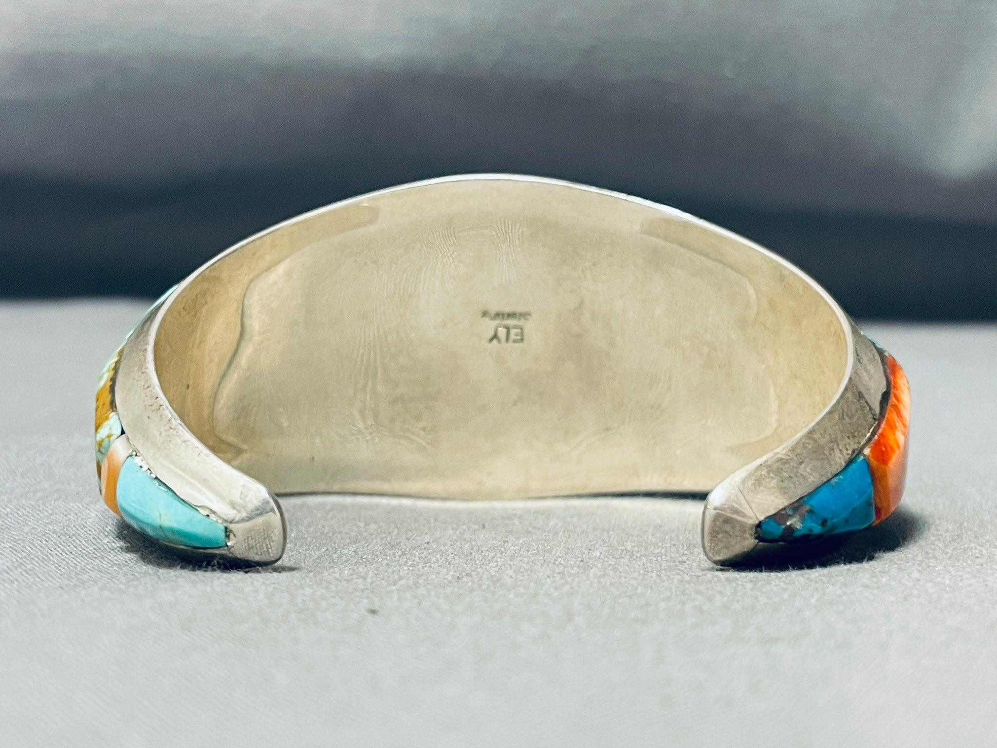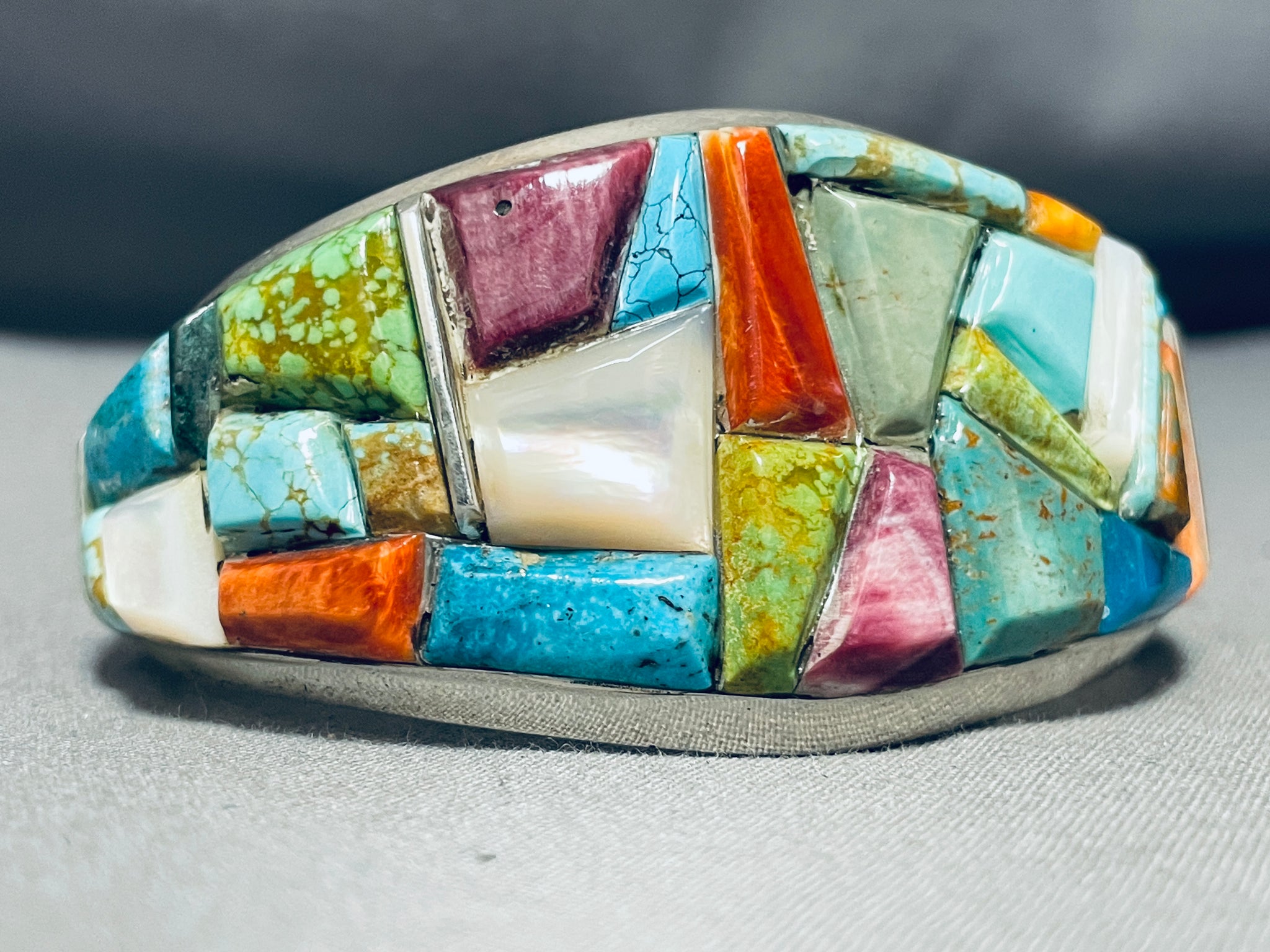 This is an exceptional Navajo inlaid graduating silver cuff bracelet. This phenomenal bracelet contains a beautiful plethora of inlaid stones and shells that wrap completely from one end of the cuff to the other. The stones and shells include purple spiny oyster, red spiny oyster, orange spiny oyster, Royston turquoise, Ovil Jack turquoise, Number 8 turquoise, and mother of pearl shells. I absolutely love how thick and sturdy this bracelet is and how it beautifully graduates in width towards the center. The width of the bracelet measures around 1-1/2". Signed by Navajo artist, Emery Yazzie . Sterling silver, marked. Cir. 1980's+. The inside end to end measures around 5-1/2" with an additional 1" gap. Sturdy 50 grams.