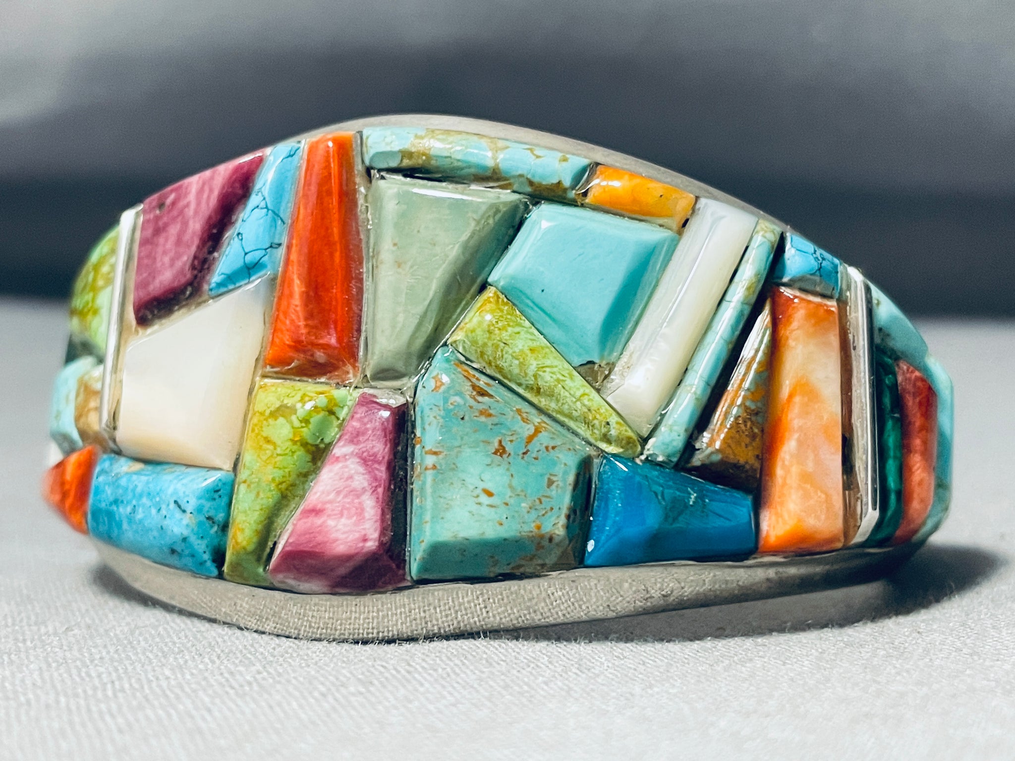 Bright Life Native American Navajo Turquoise Mosaic Inlay Sterling Silver Bracelet