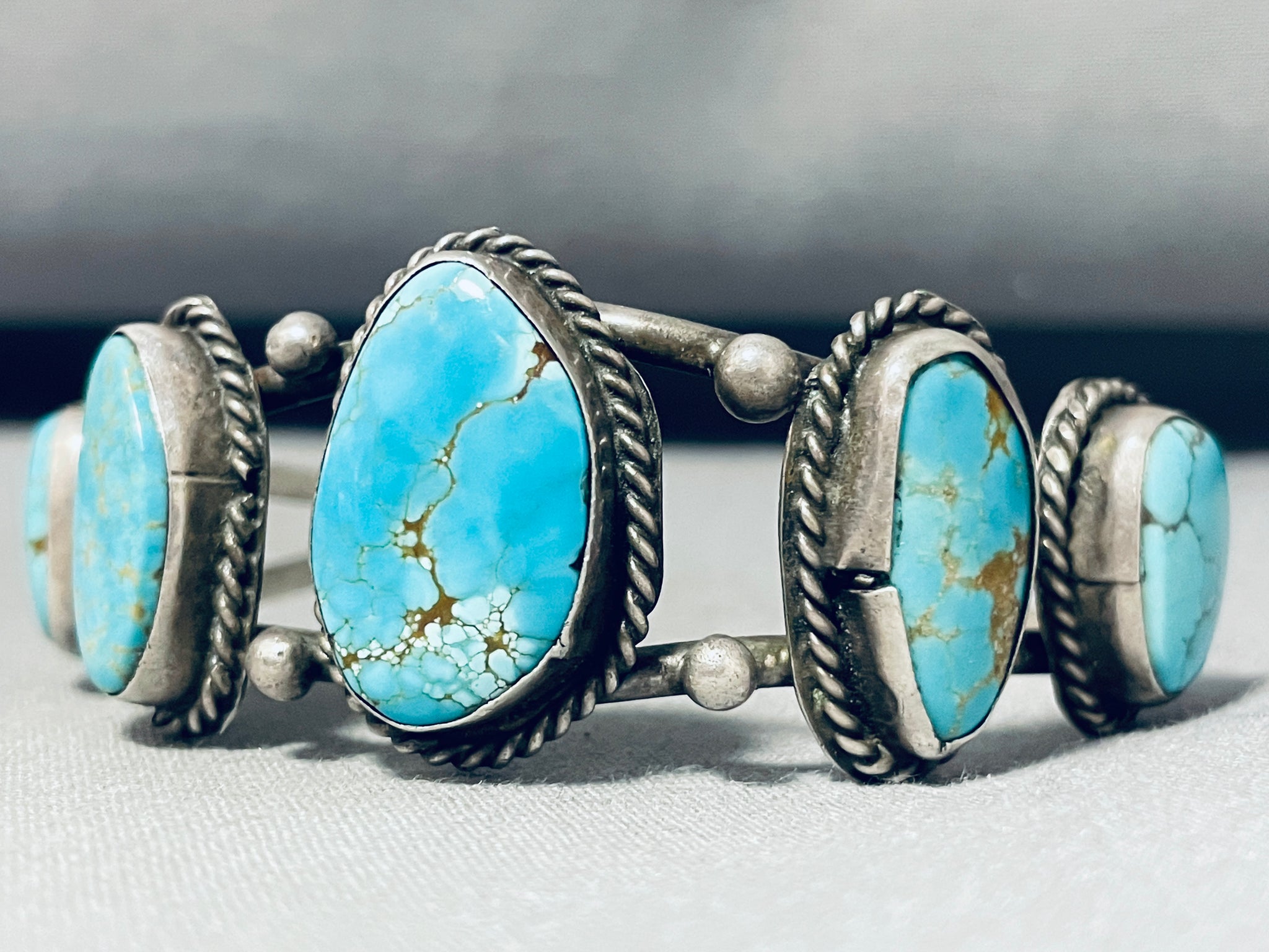 Brilliant Blue Vintage Native American Navajo 5 Blue Gem Turquoise Sterling Silver Bracelet
