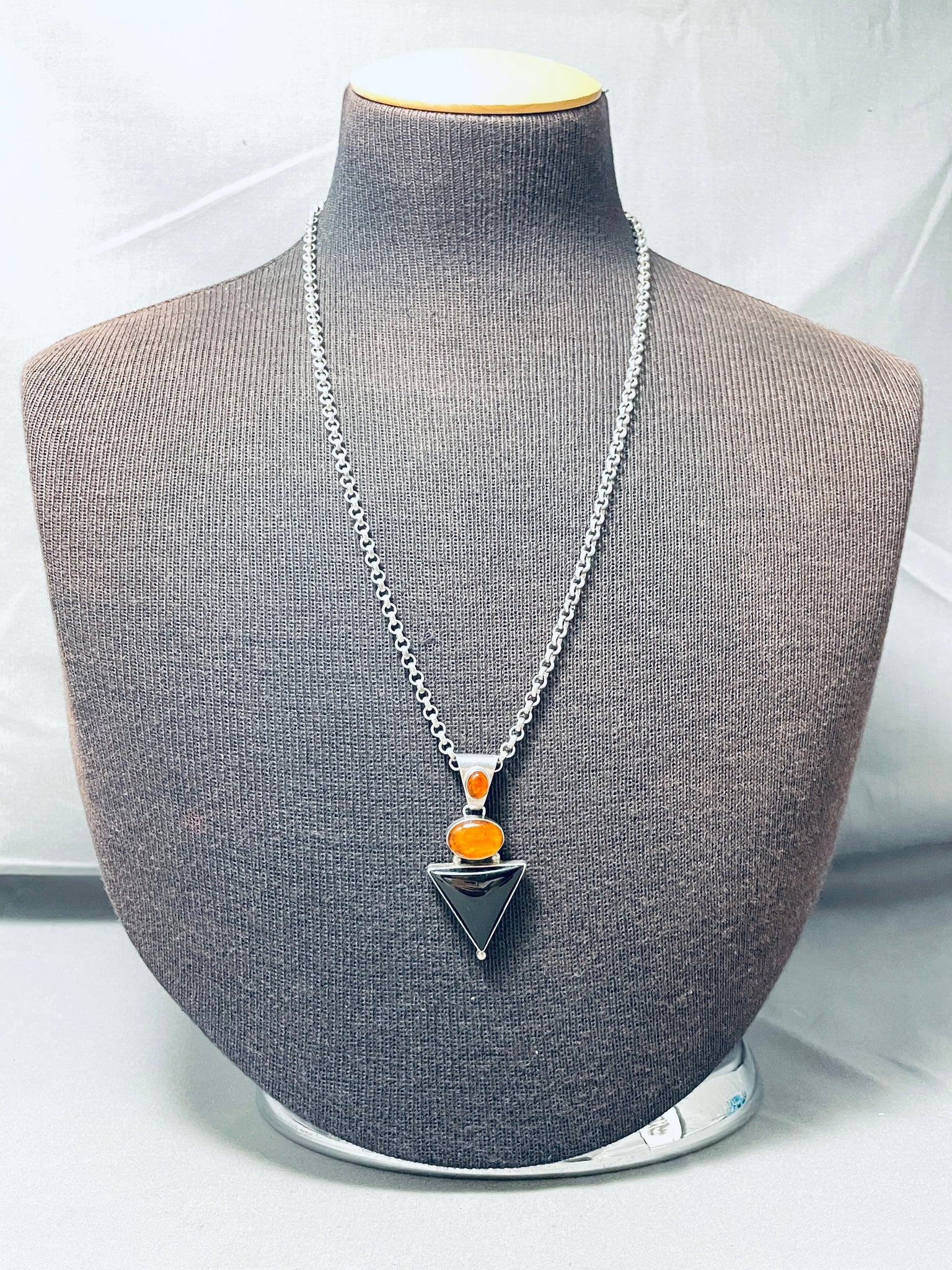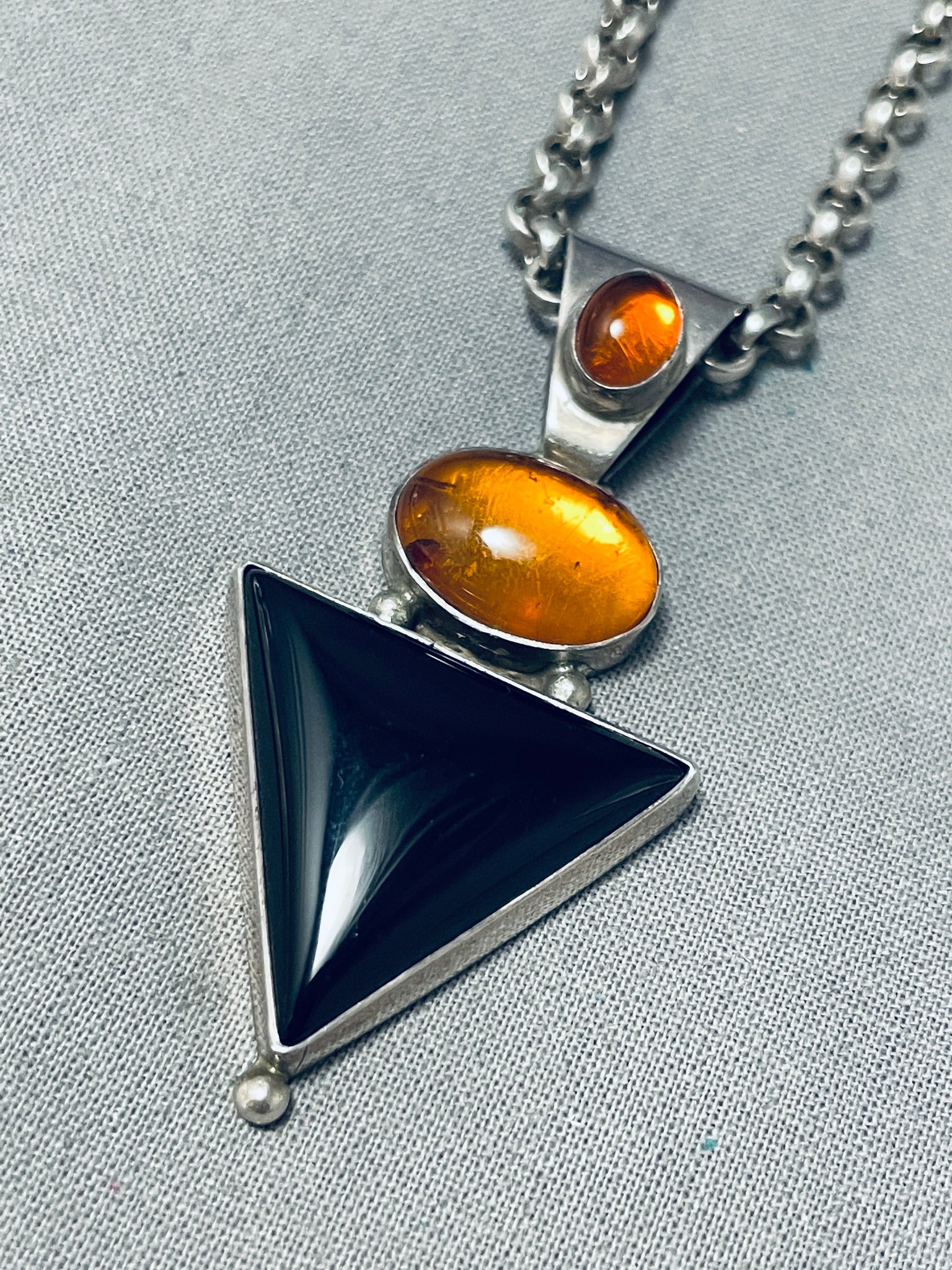 Brilliant Native American Navajo Black Onyx Triangle Amber Sterling Silver Necklace