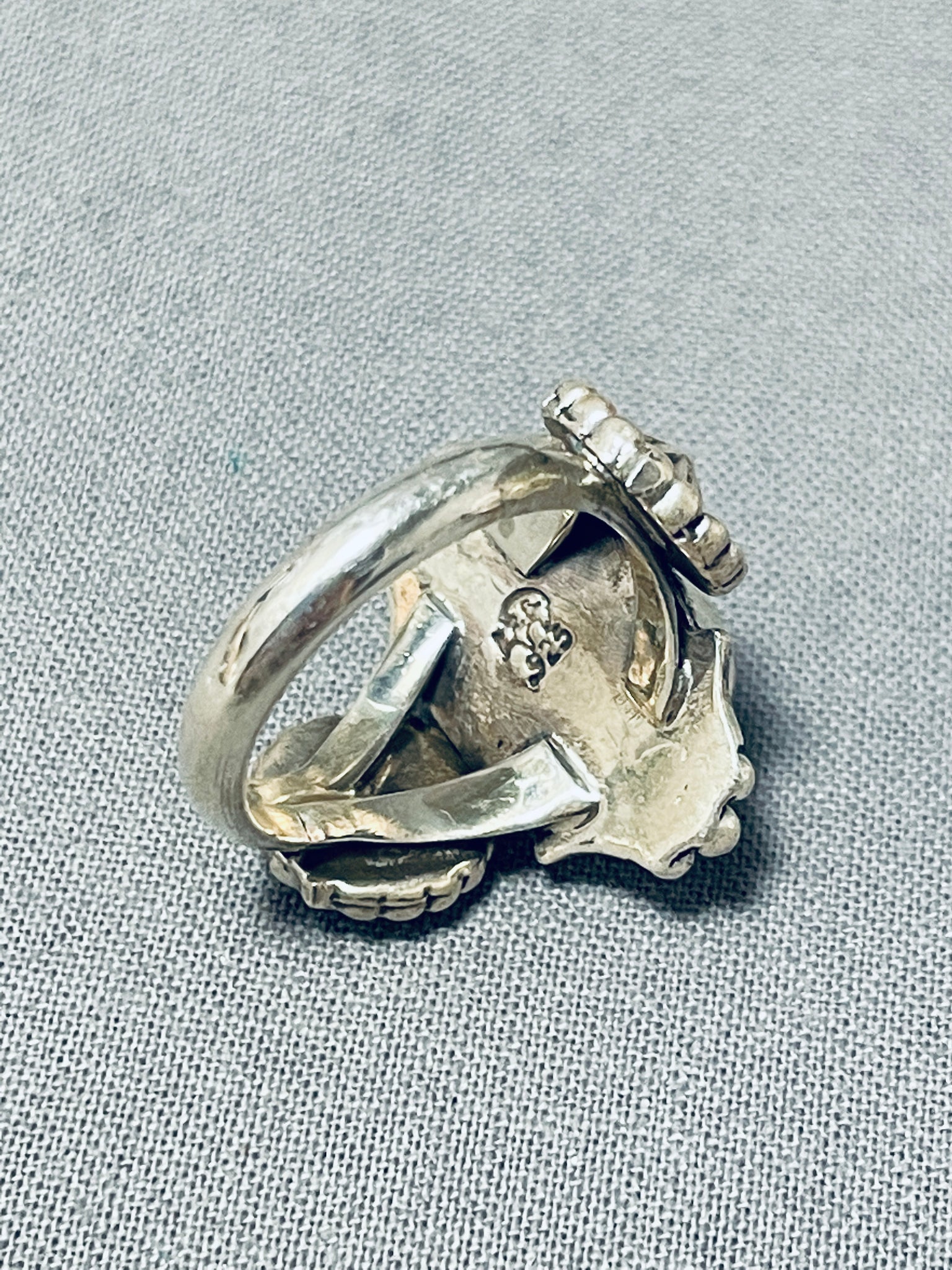 Here we have an exceptional Navajo silver ring having a large green turquoise center surrounded by handcarved silver rope, silver beads and large handcarved silver star flanks on a graduated double silver rail band! Absolutely Extraordinary! The center stone measures around 3/8" x 3/8". The ring face measures around 1" x 7/8". The ring size is around 6. Sterling silver. Sturdy 8 grams.