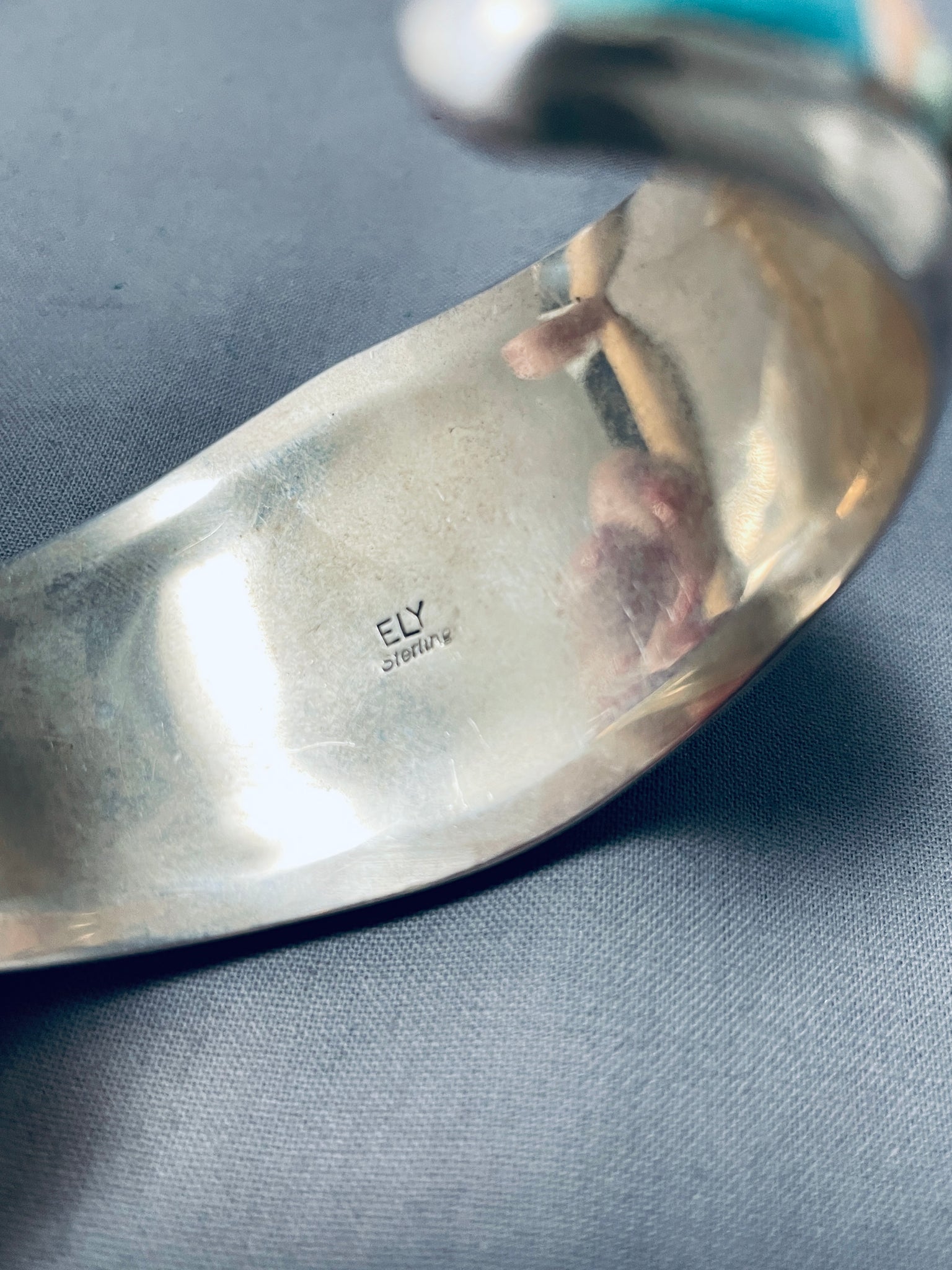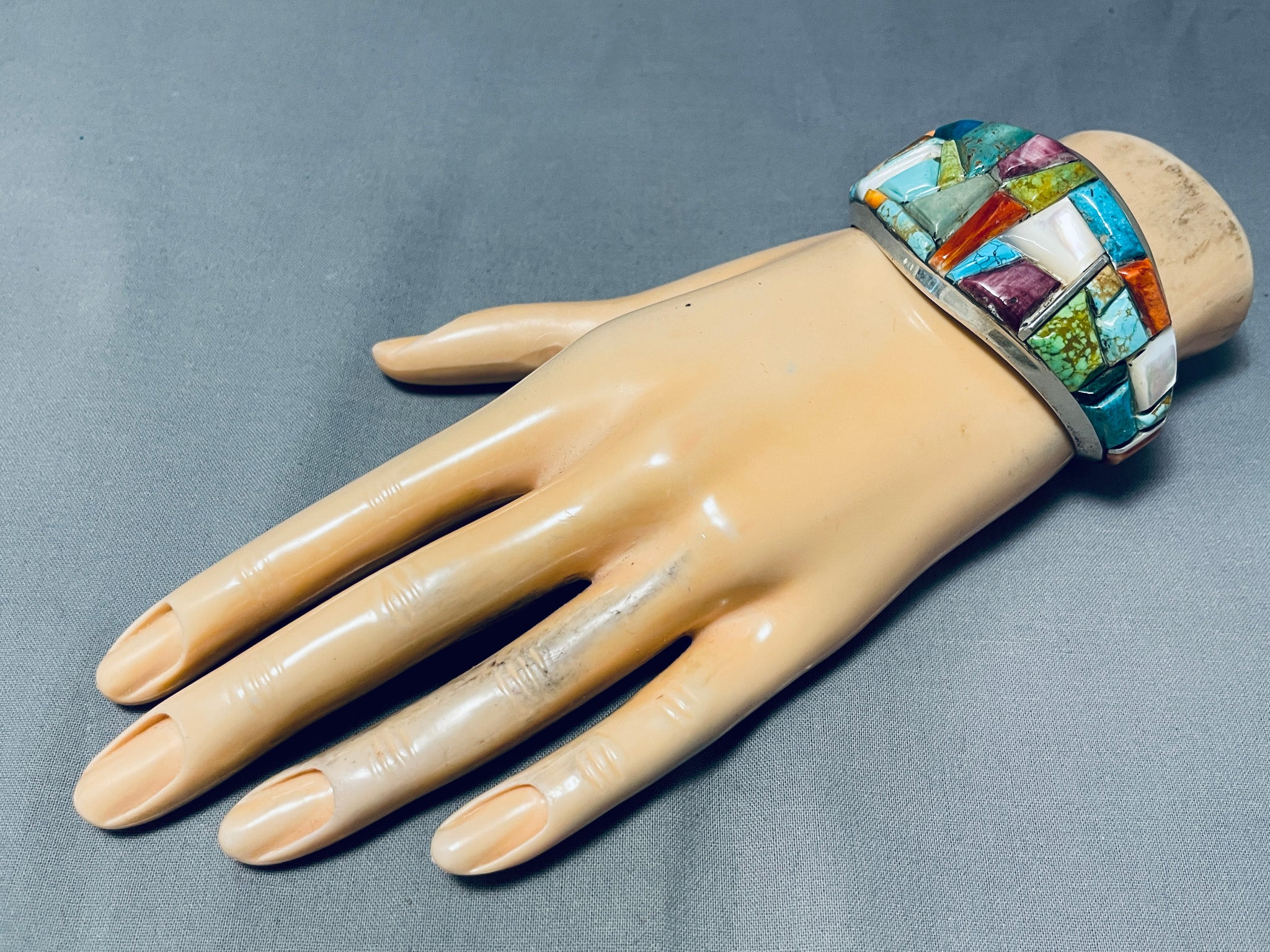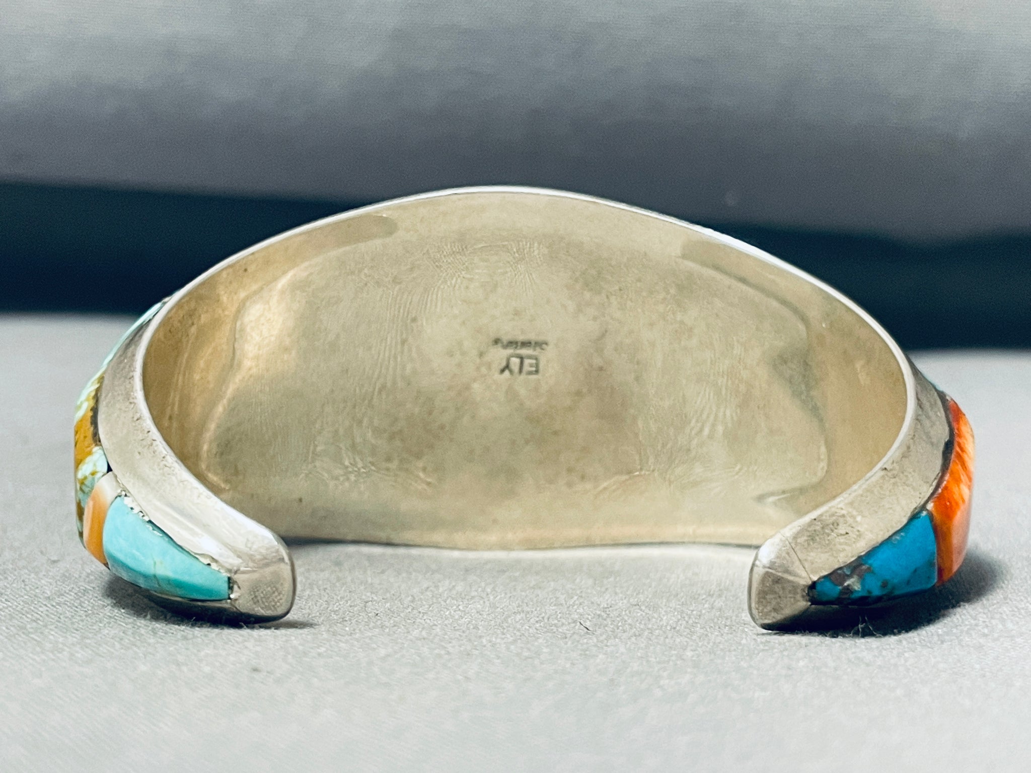 Up for sale is this fascinating Navajo silver bracelet having a mosaic inlay of beautiful stones including turquoise, gaspeite, purple and orange spiny, mother of pearl and more! surrounded by handcarved silver borders on a handcarved solid silver cuff! Absolutely Gorgeous! The largest stone measures around 1/2" x 5/8". The width of the bracelet measures around 1-3/8". Signed by Navajo artist, ELY. Sterling silver, marked. The inside end to end measures around 5-3/8" with an additional 1-1/4" gap. Sturdy 51 grams.