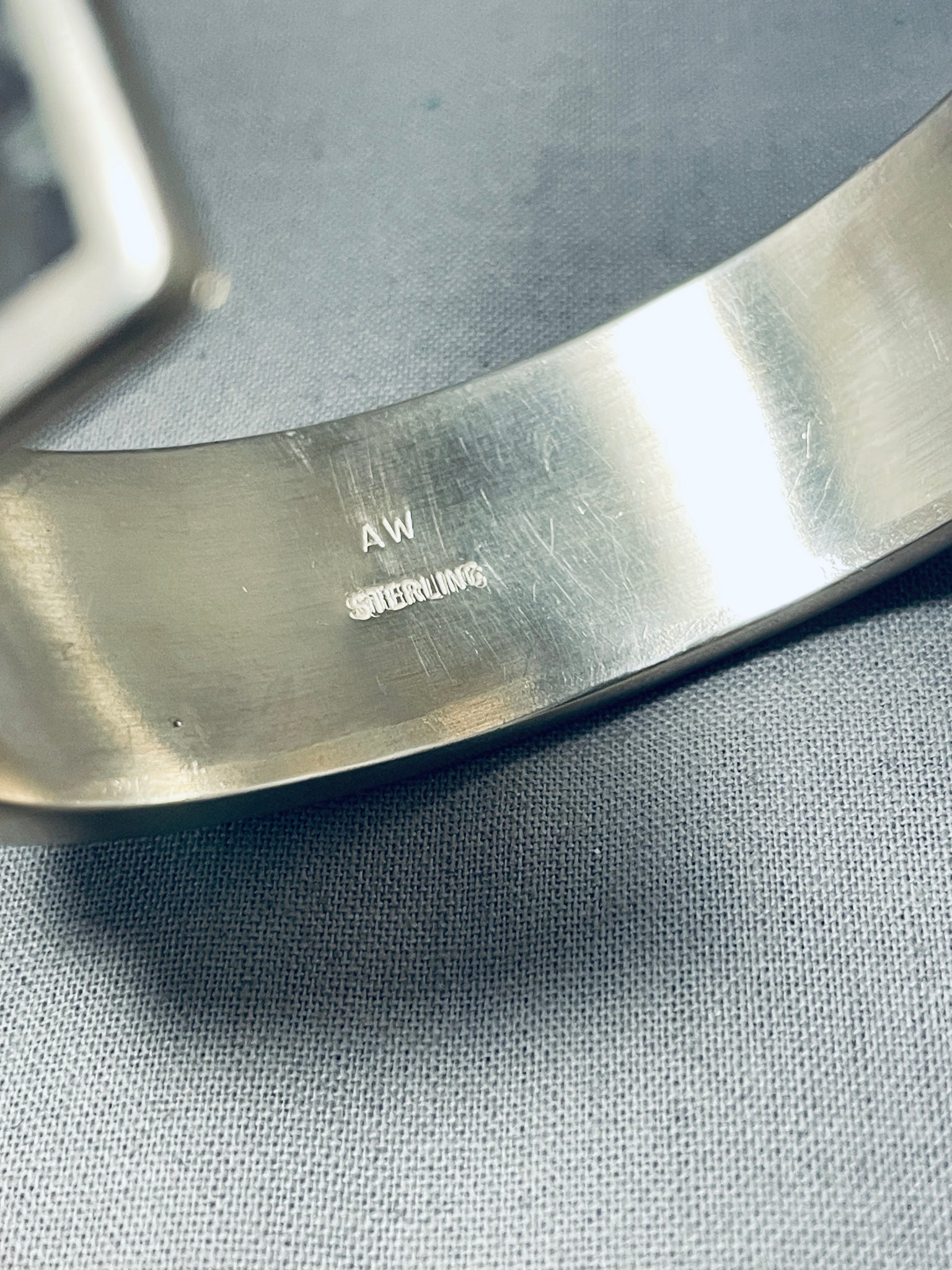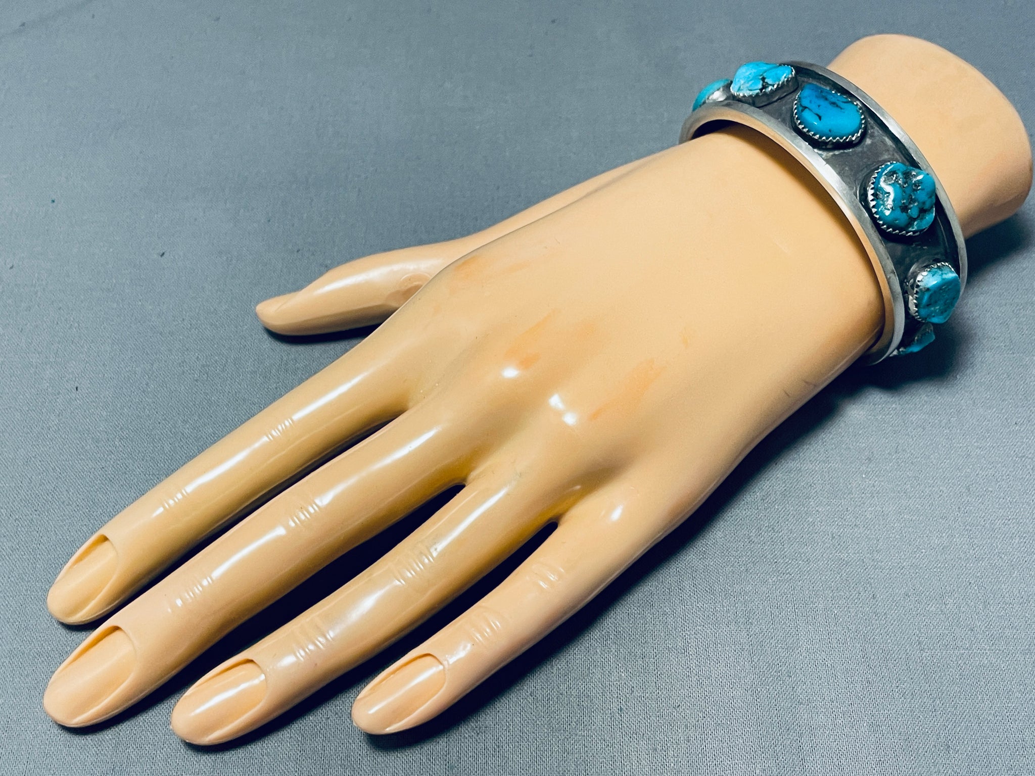 This is an impressive Navajo silver bracelet having 7 Morenci turquoise stones deepset across a handcarved solid silver cuff with thick silver borders! Absolutely Breathtaking Showpiece! The center stone measures around 1/2" x 3/8". The width of the bracelet measures around 3/4". Signed by Navajo artist, Anita Whitegoat. Sterling silver, marked. The inside end to end measures around 5-5/8" with an additional 1-1/8" gap. Sturdy 55 grams.