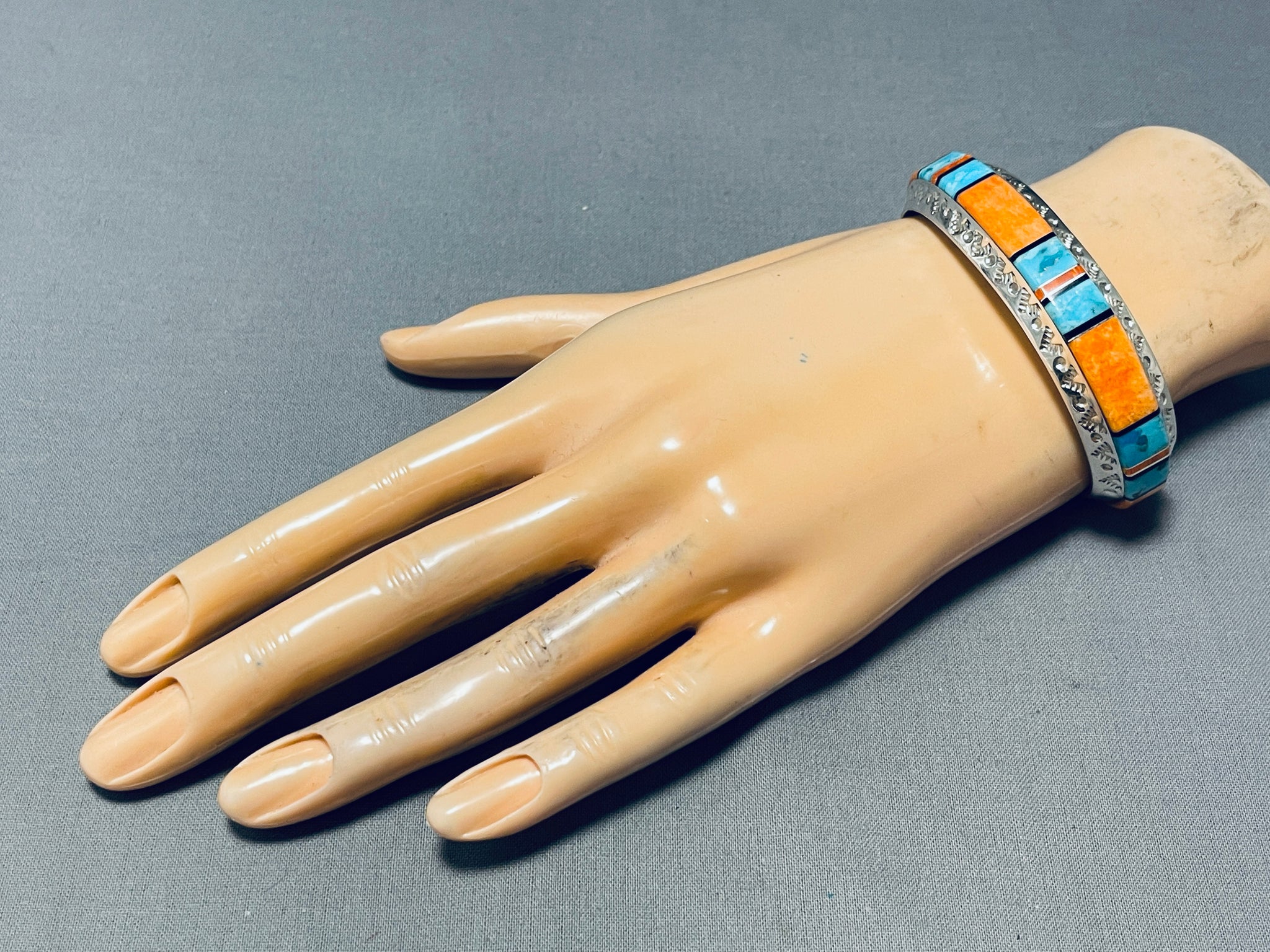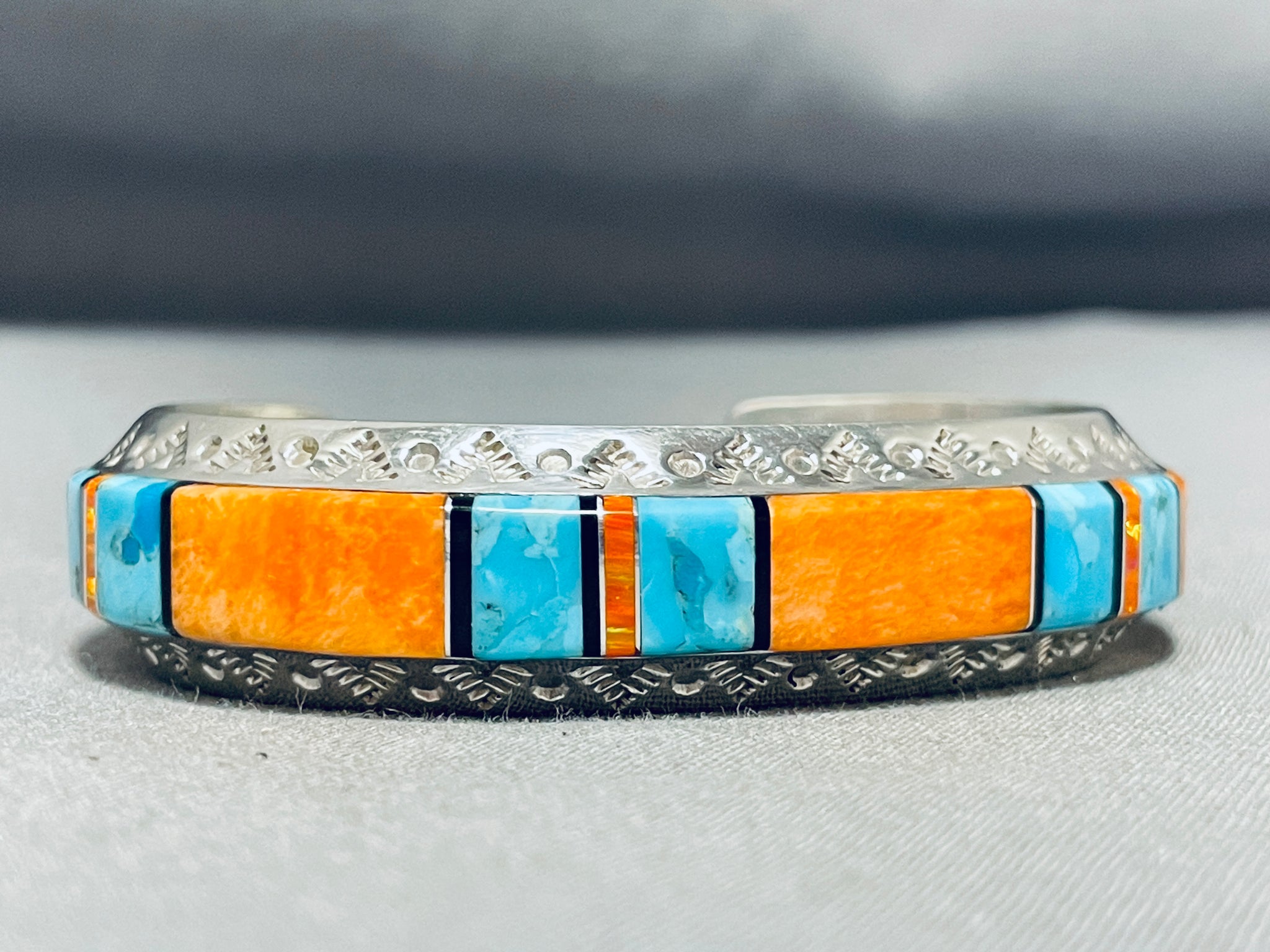 Brilliant Native American Navajo Turquoise Spiny Oyster Inlay Sterling Silver Bracelet