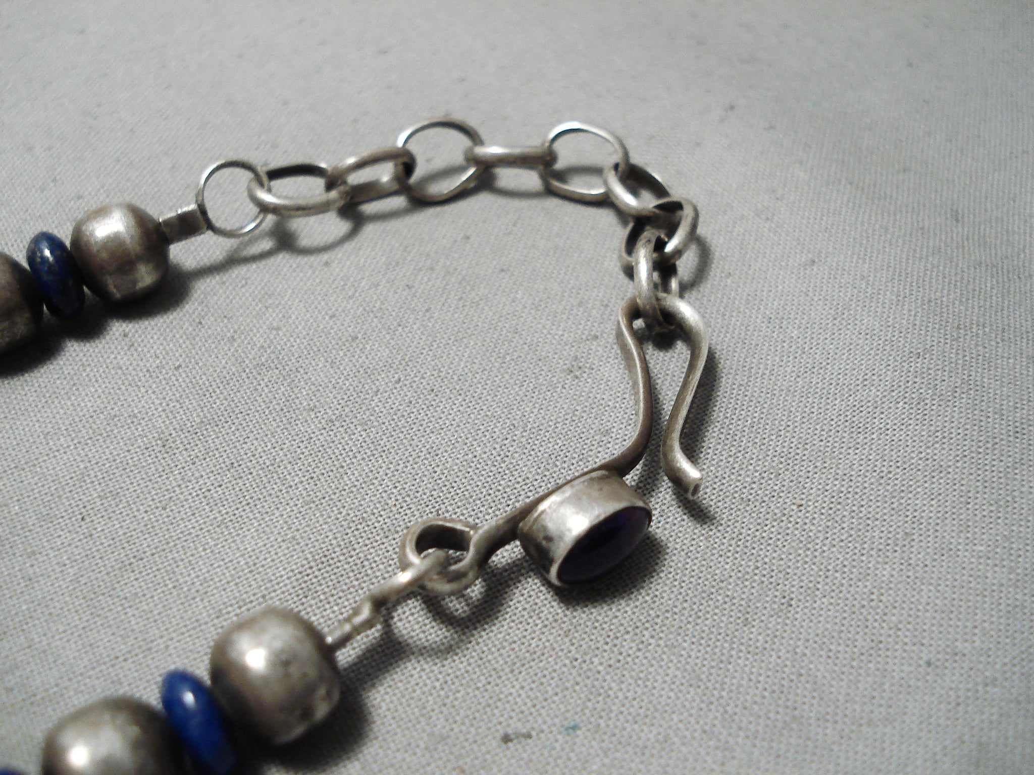 An exquisite vintage Navajo silver necklace. What a colorful combination of stones that include turquoise chunks and lapis among thick silver beads we have here in this choker style necklace! And it has 2” of additional loops for length adjustability. Check out the gorgeous stone on the clasp! The largest of turquoise is about ¾” x ½”. Sterling silver. The length of the necklace measures around 17". Sturdy 68 grams. Cir Mid to late Century.