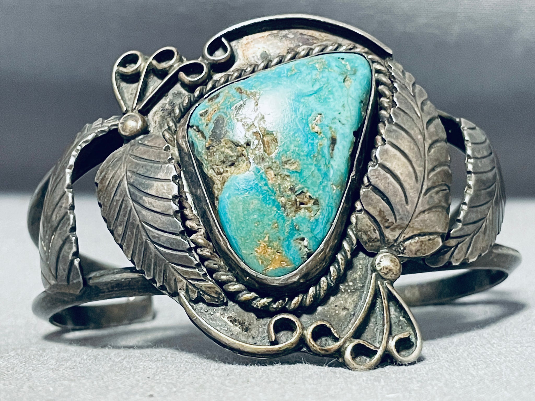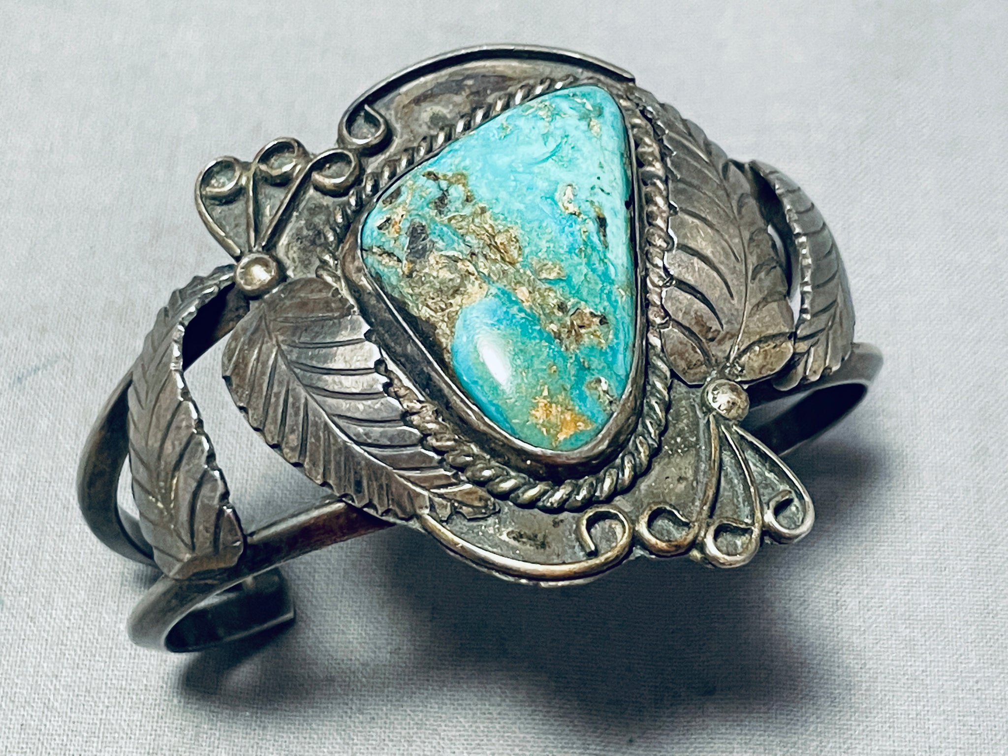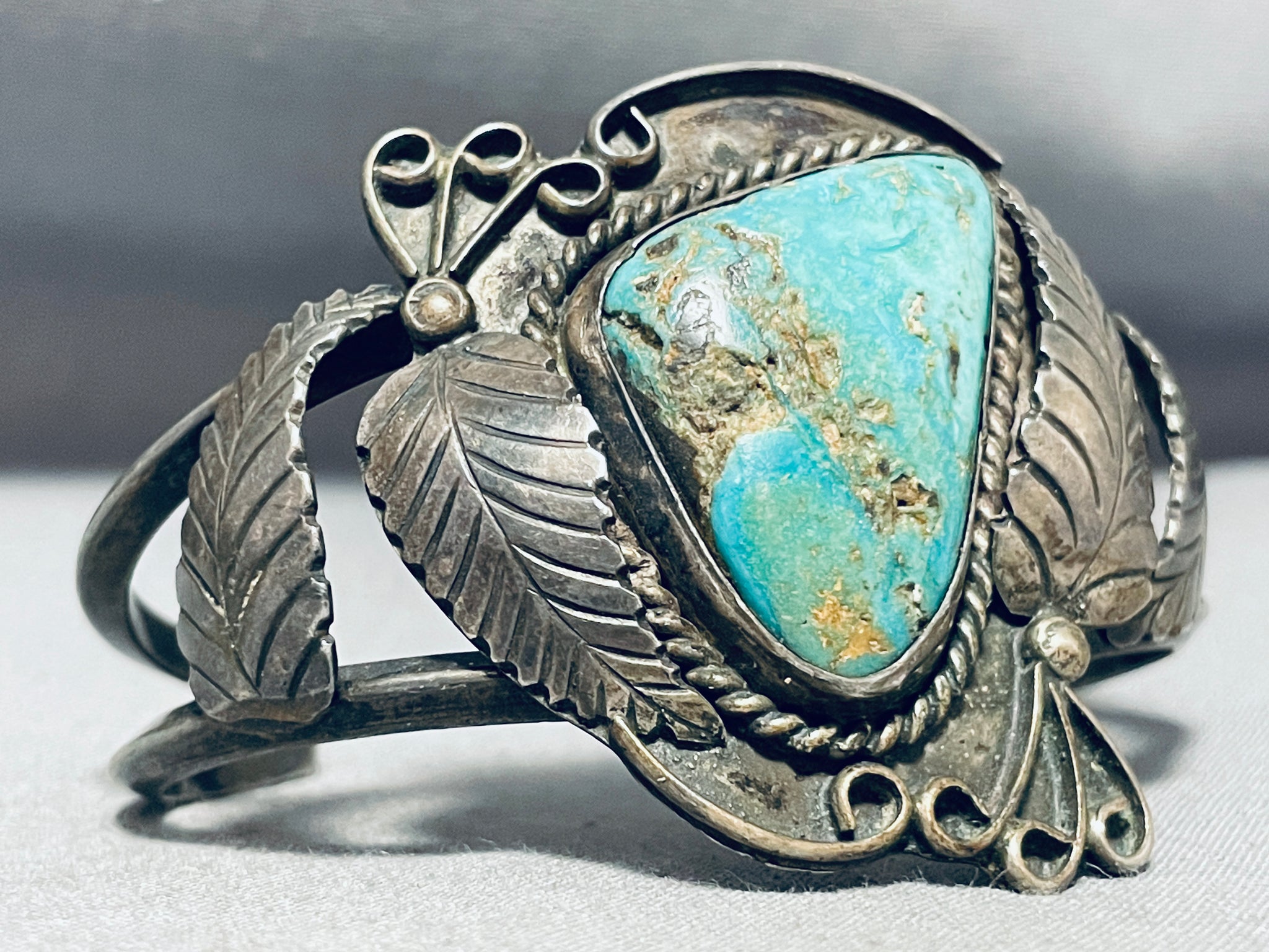 Here we have a classic vintage Navajo bracelet! It features a triangular Royston turquoise stone surrounded by handcarved silver rope, 4 detailed silver leaves, silver stems, and silver beads! Absolutely Lovely! The center stone measures around 1-1/4" x 3/4". The width of the bracelet measures around 1-3/4". Sterling silver. The inside end to end measures around 5-1/4" with an additional 1-1/4" gap. Sturdy 46 grams. Cir Mid Century