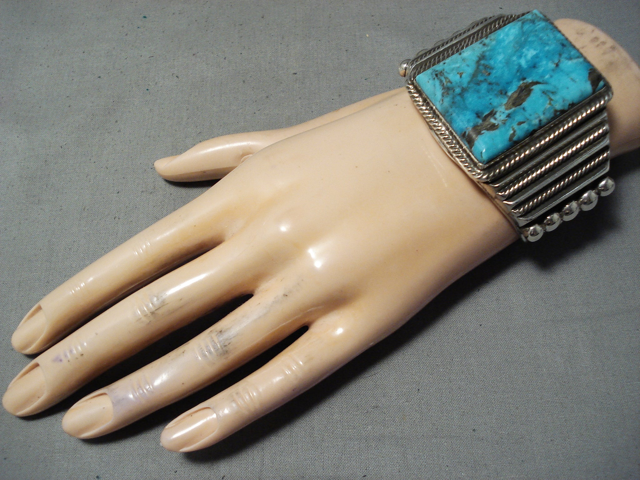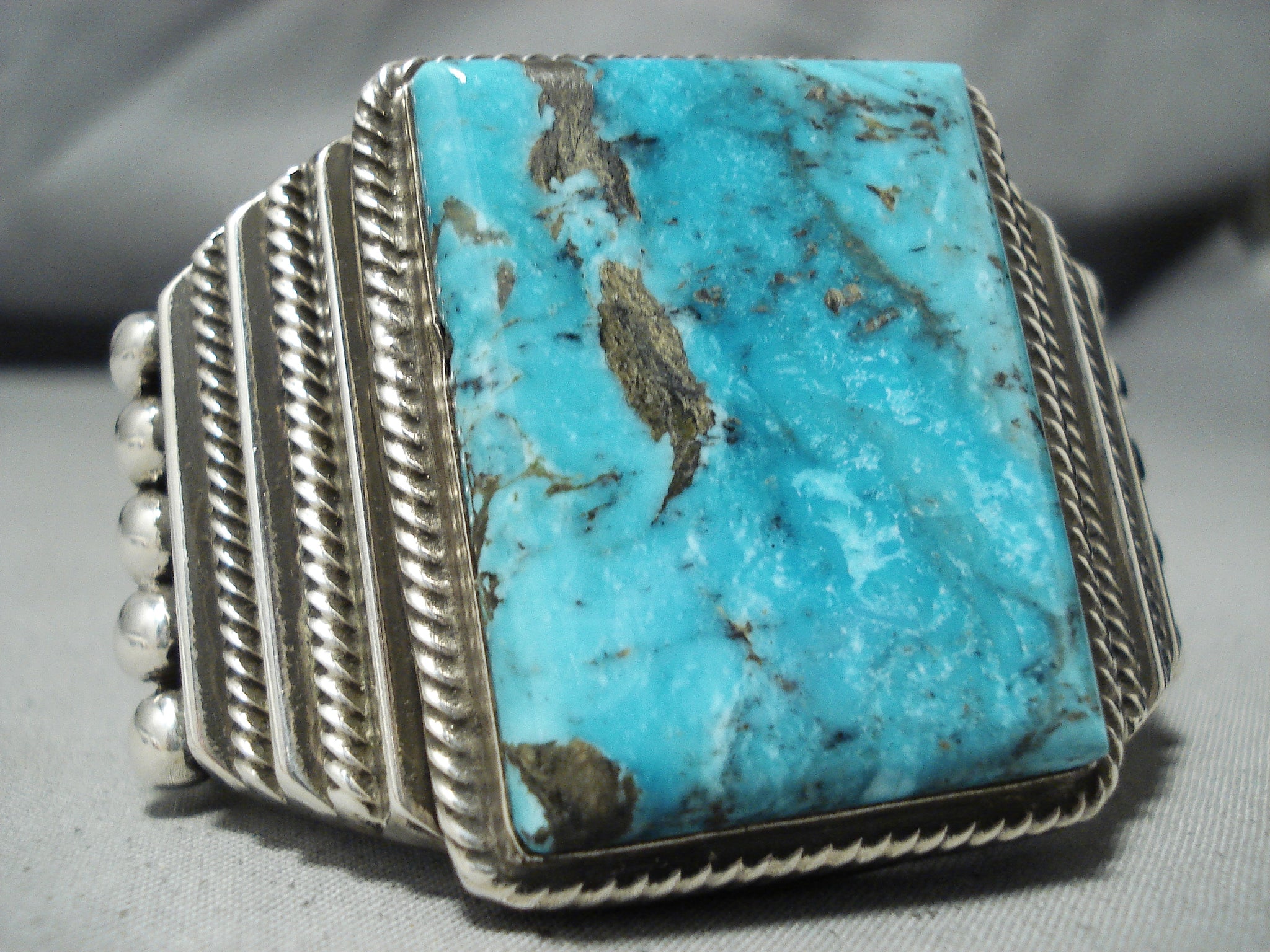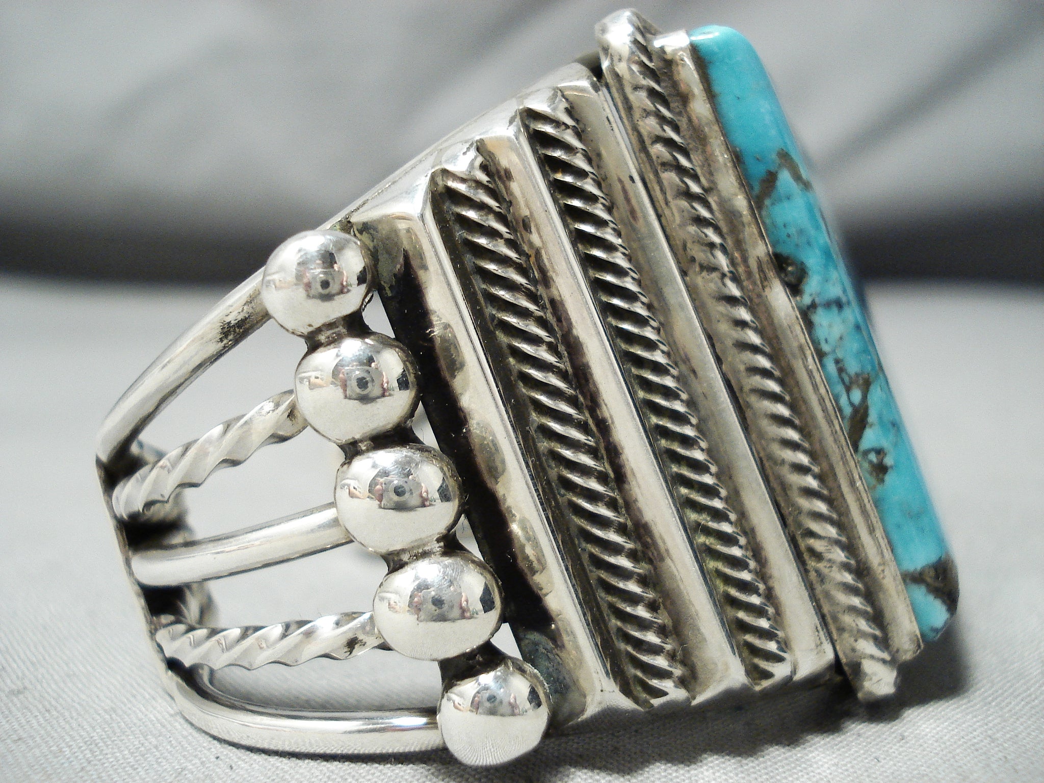 Bulky Native American Navajo Squared Turquoise Rick Martinez Sterling Silver Bracelet
