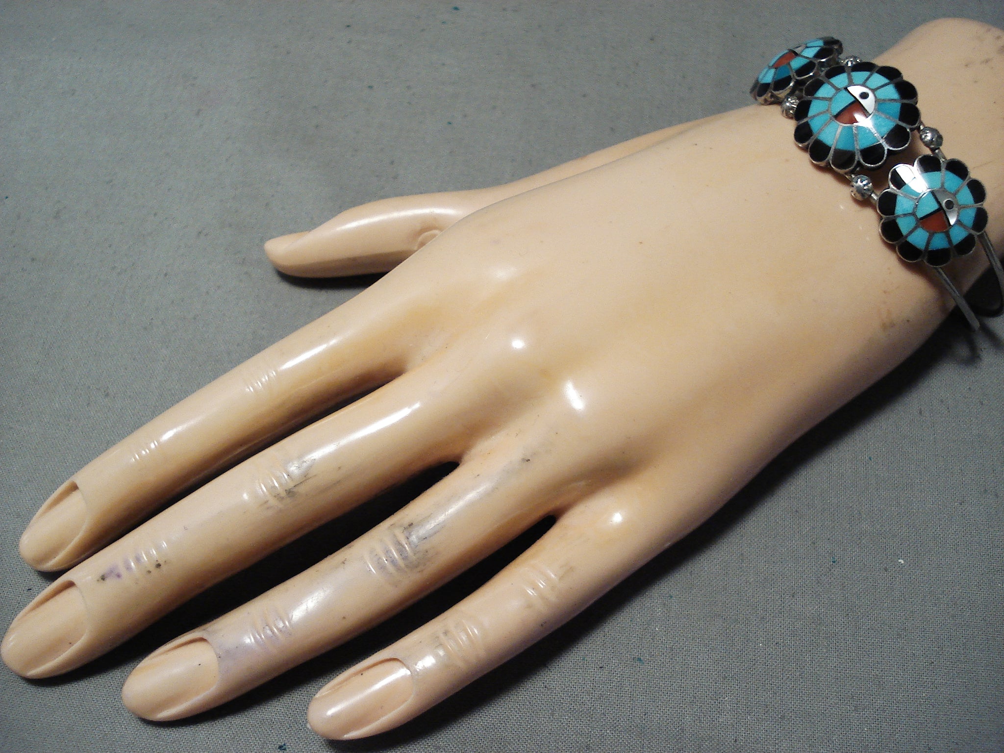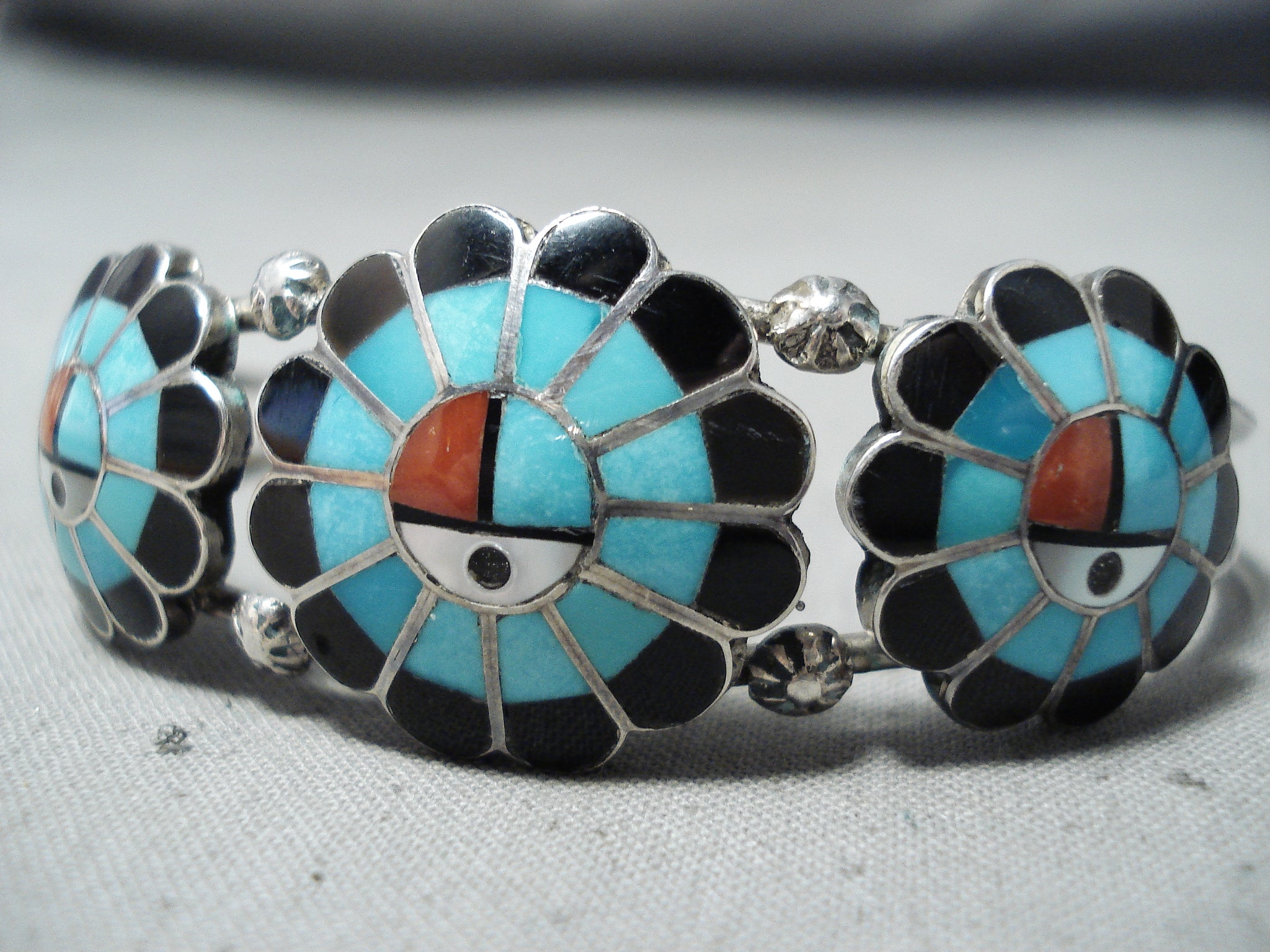Burdian Sosseah Vintage Native American Zuni Inlay Turquoise Sunfaces Sterling Silver Bracelet