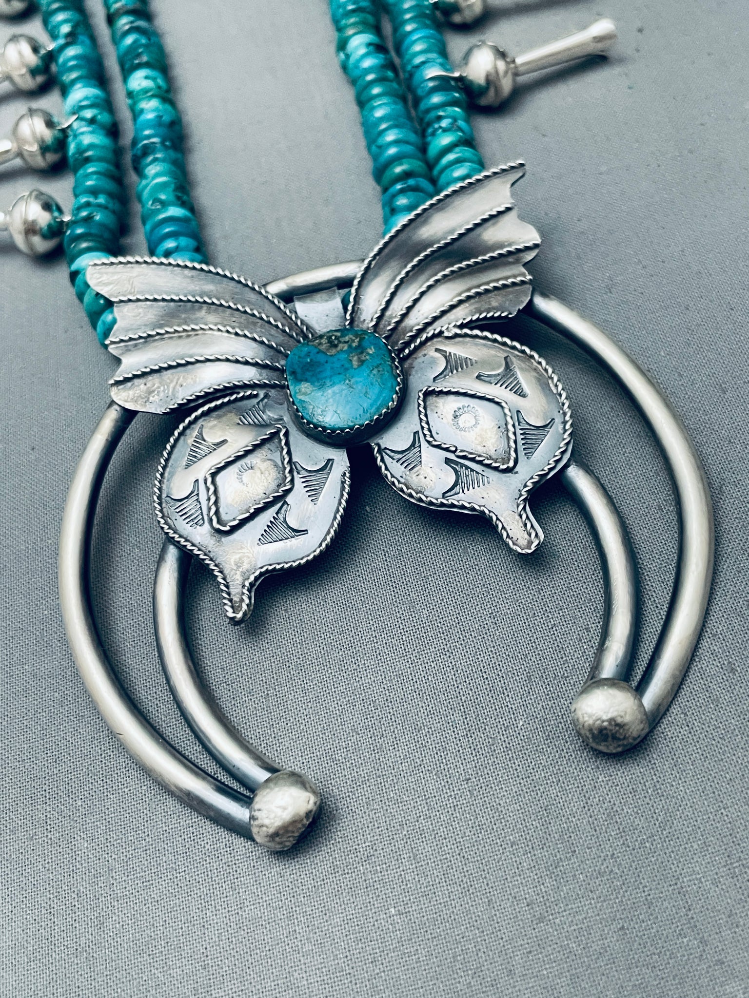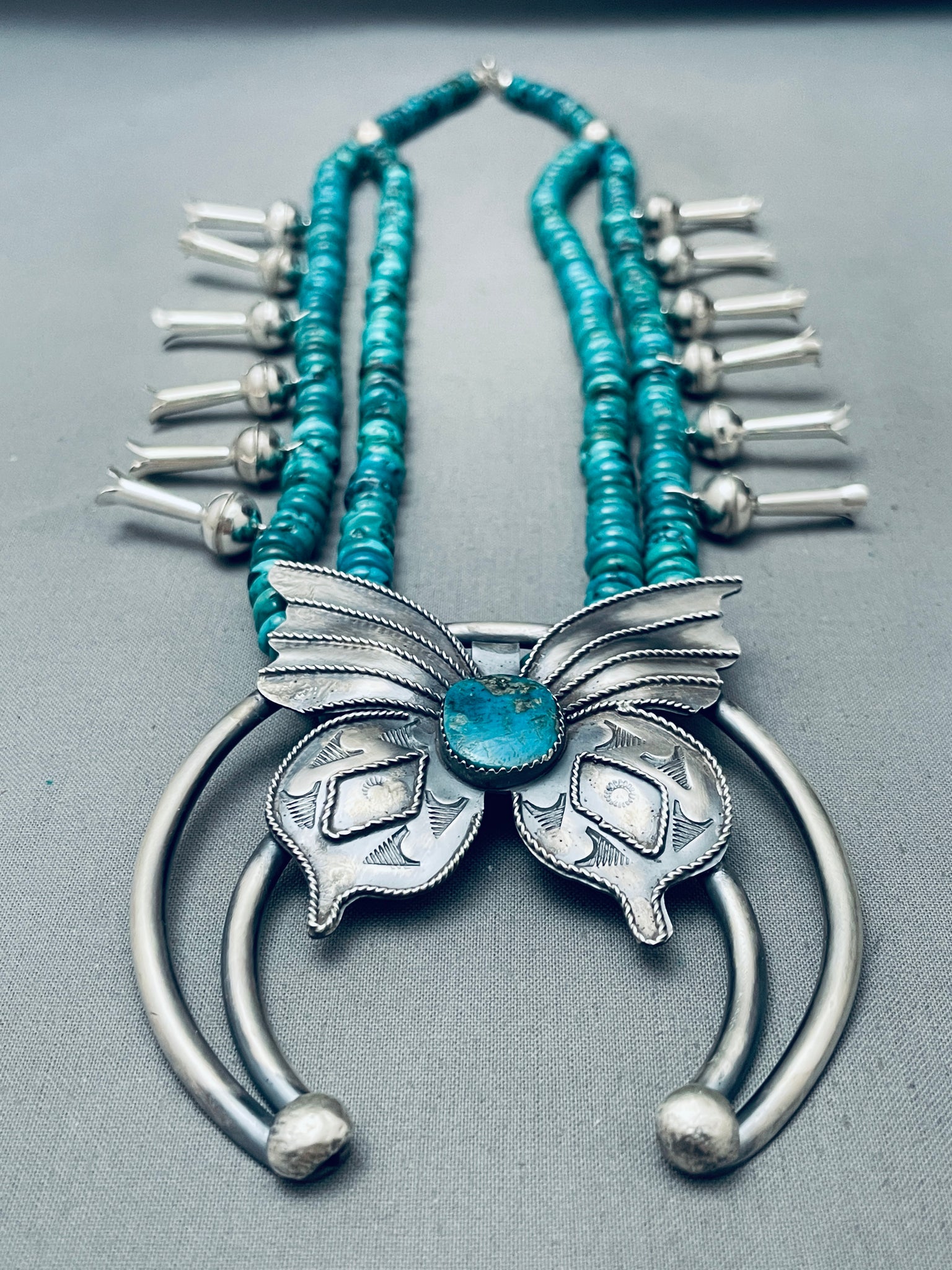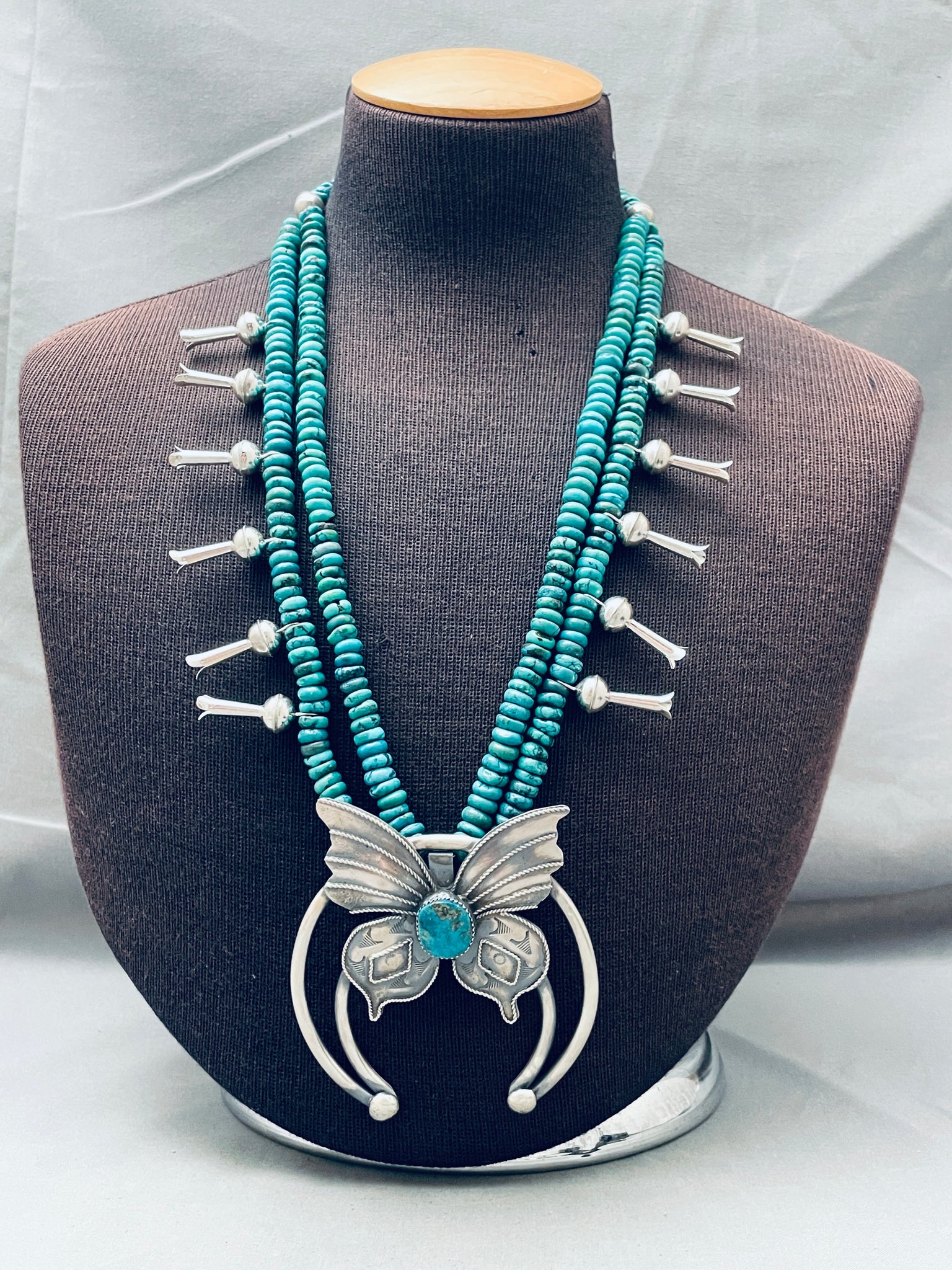 Butterfly Turquoise Naavjo Sterling Silver Squash Blossom Necklace