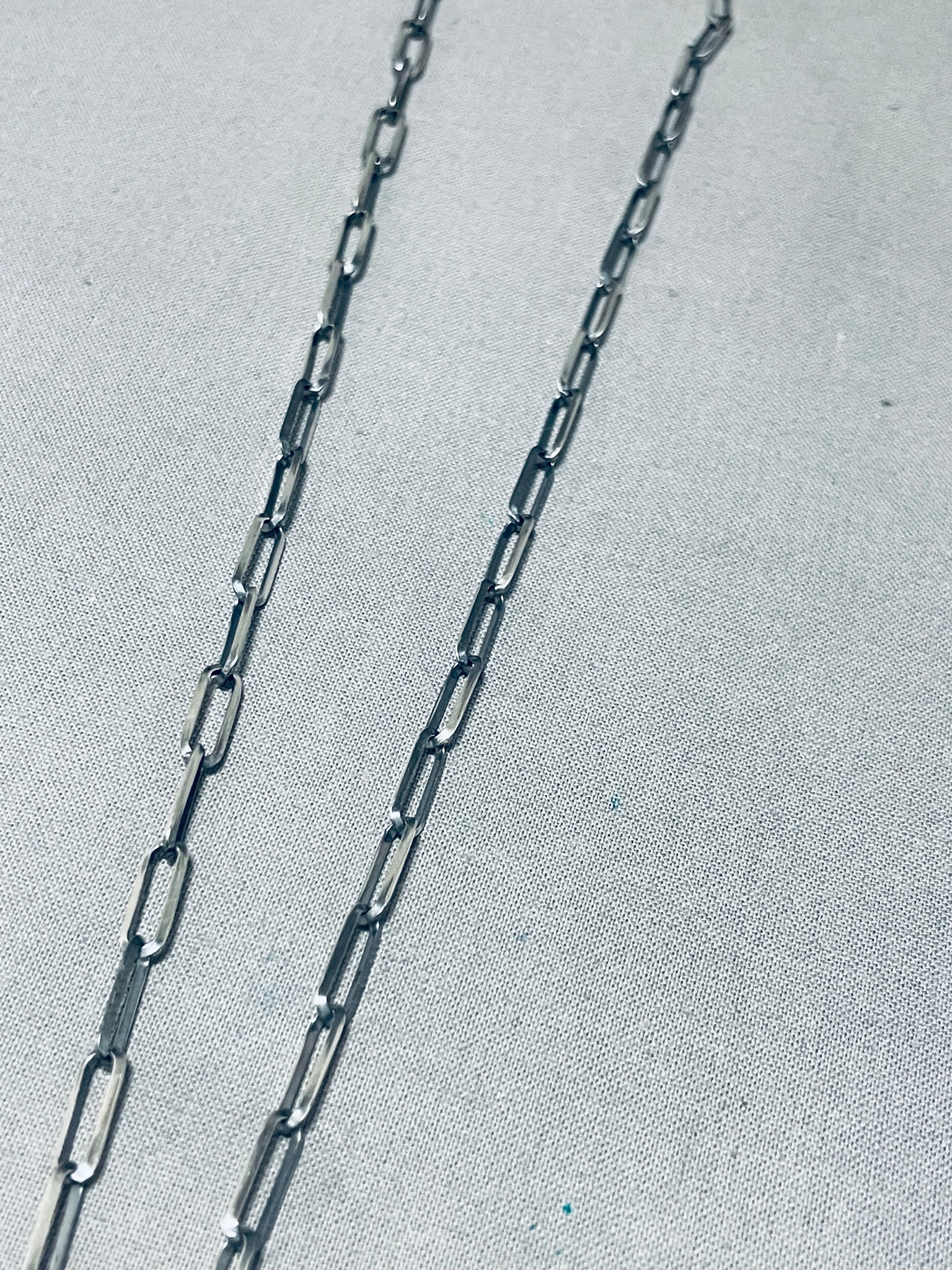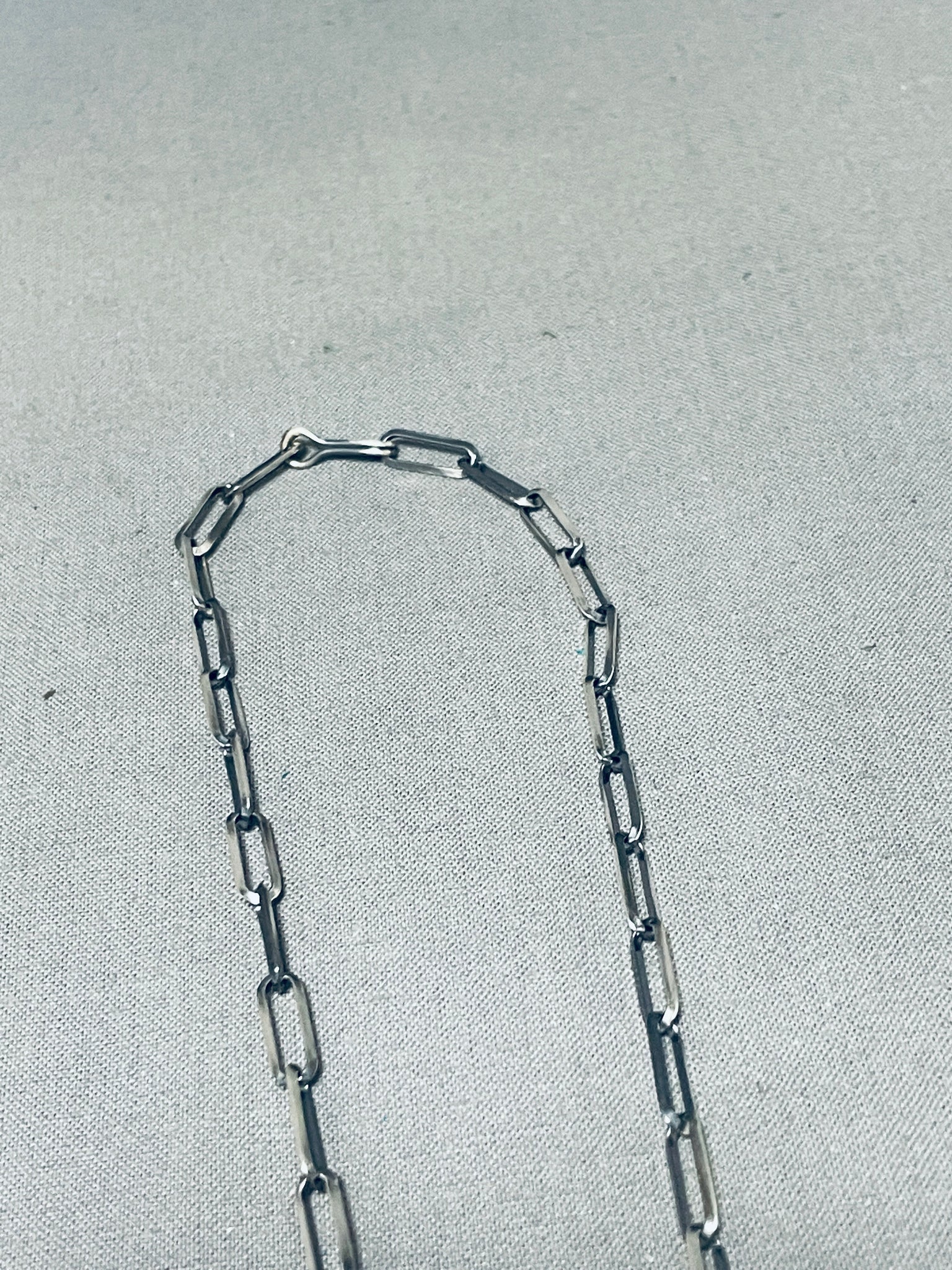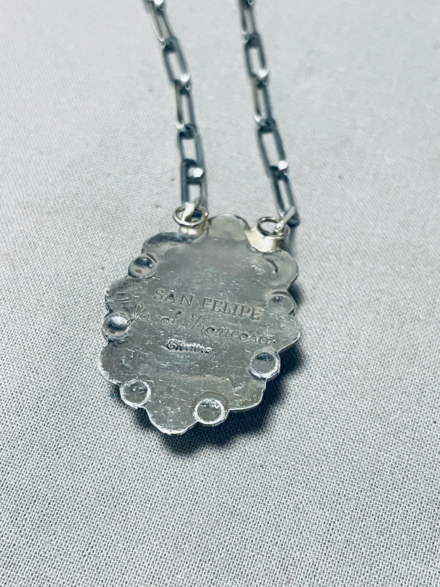 We are proud to offer this remarkable San Felipe necklace featuring a Pilot Mountain turquoise pendant with handstamped silver borders, a silver chain, and a silver hook and eye clasp! Absolutely One of a Kind! Sterling silver, marked. Signed by San Felipe artist, Jake Francosa. The length of the necklace measures around 20-1/2". Sturdy 17 grams.