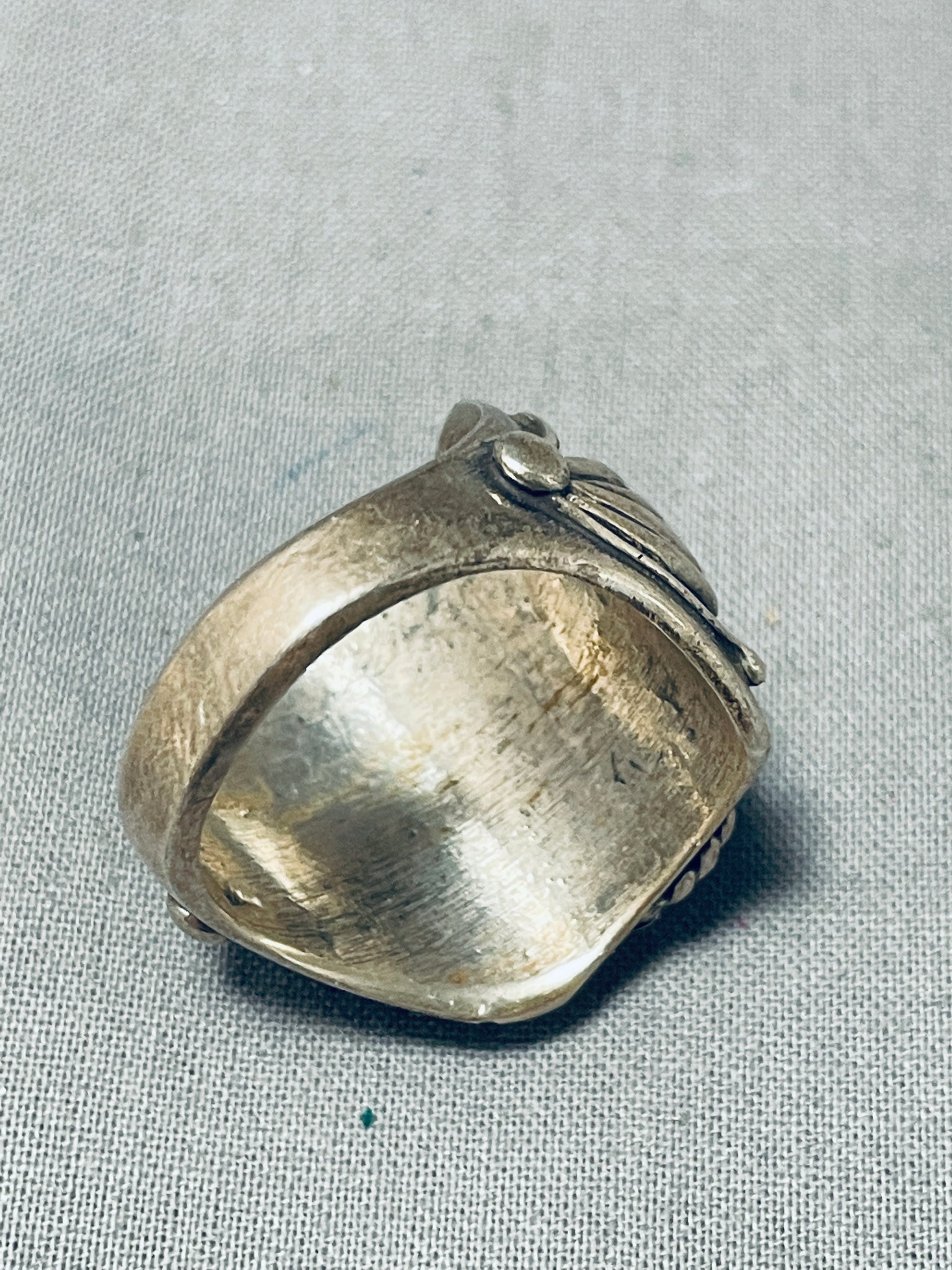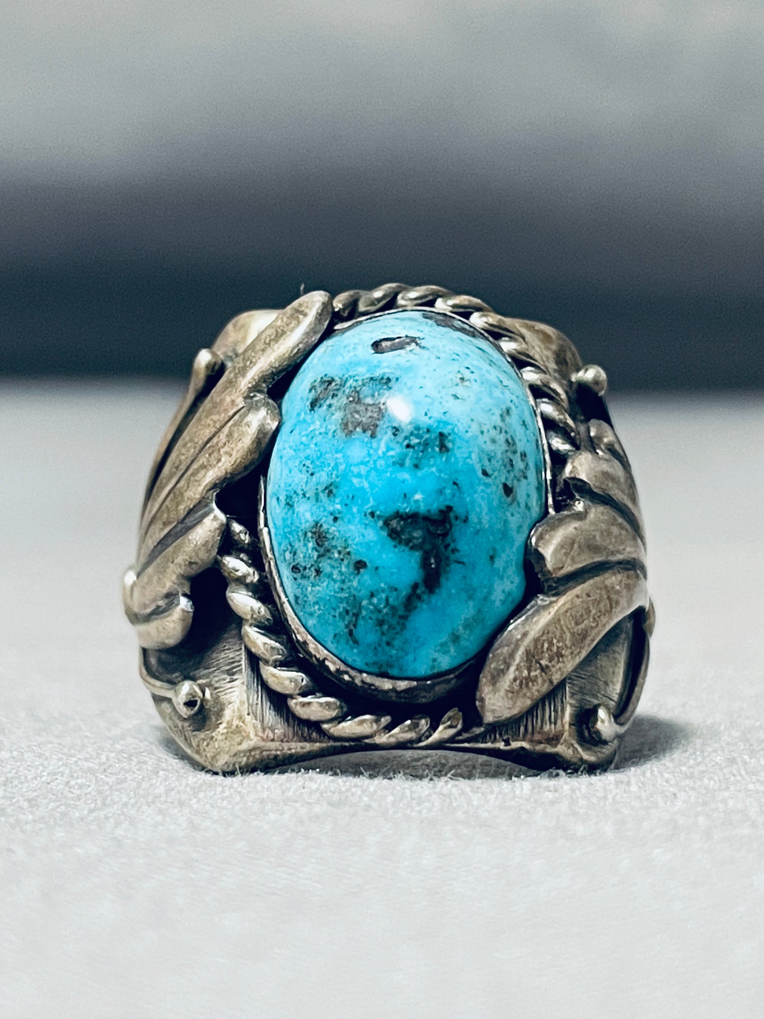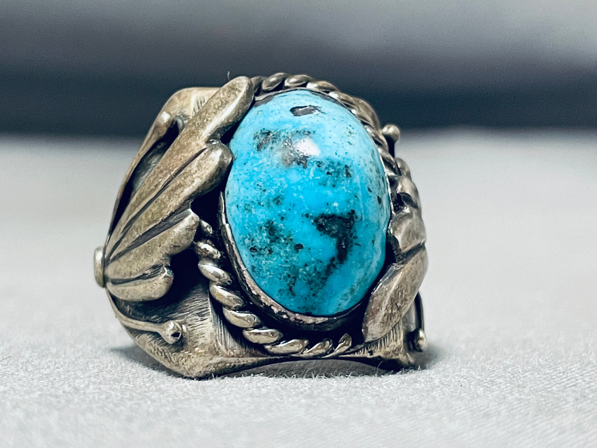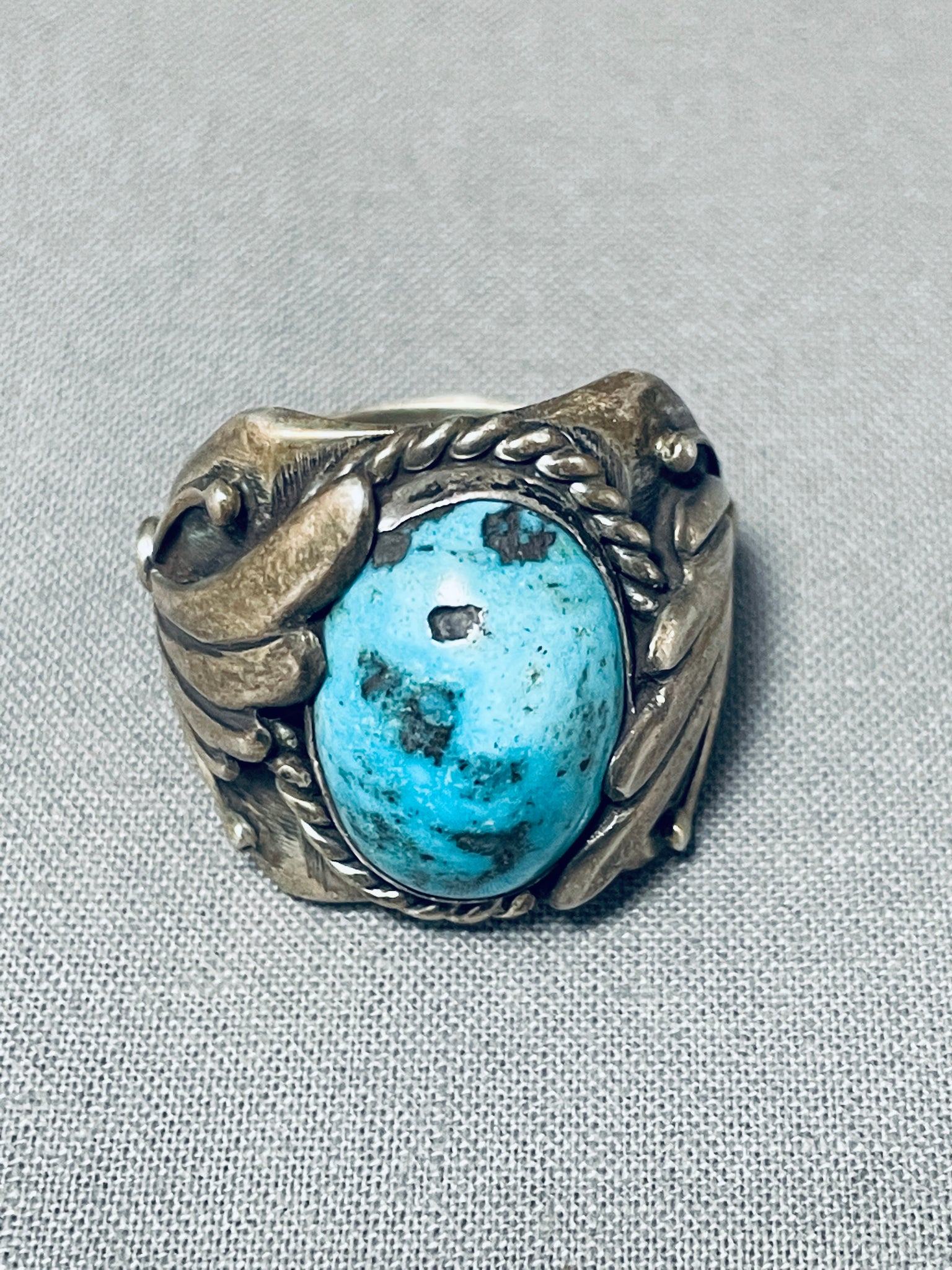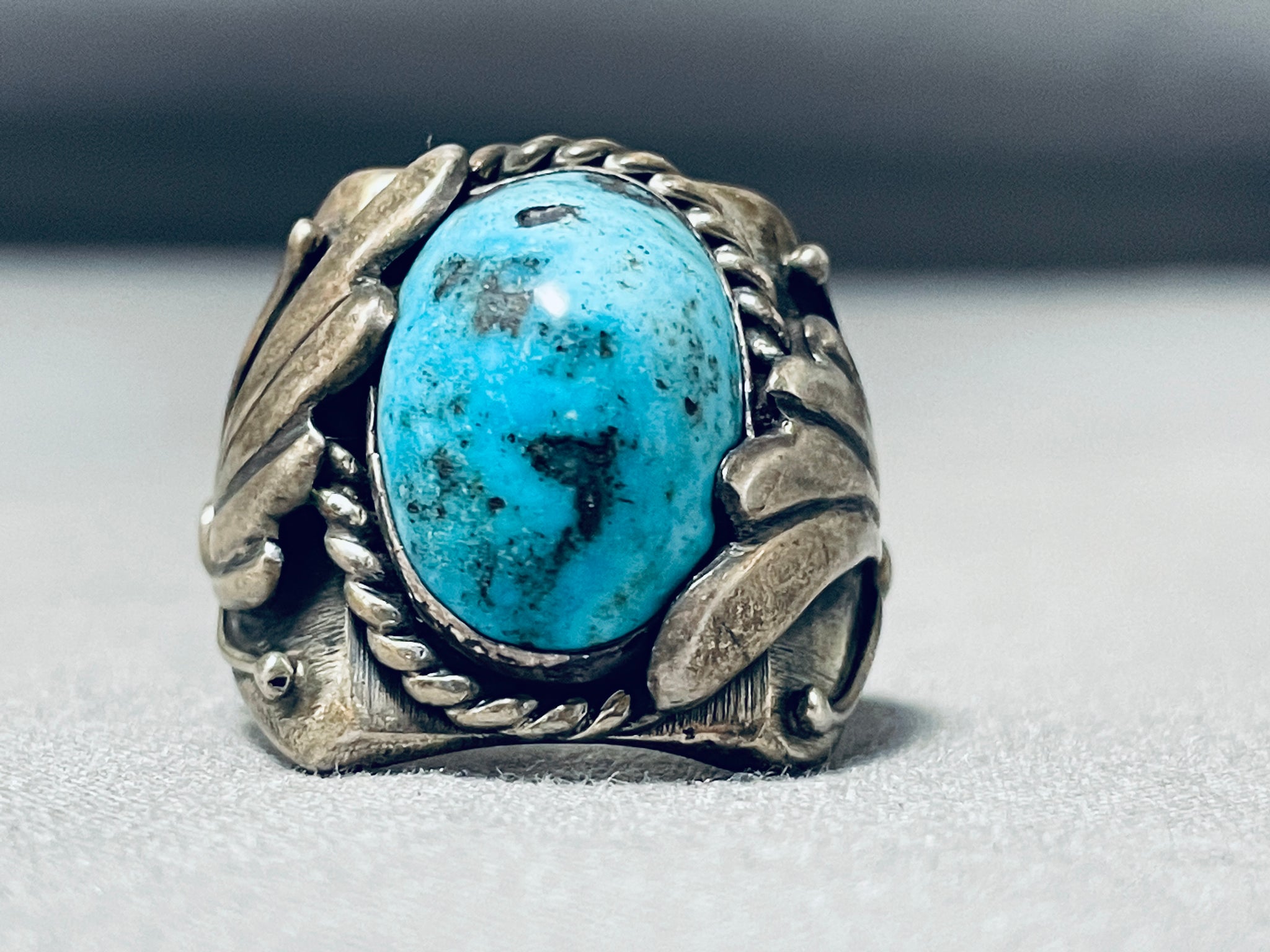 We are proud to offer this superior vintage Navajo silver ring having a large Blue Diamond turquoise dome center surrounded by handcarved silver rope with handcarved silver fan flanks and silver beads on the sides of the graduated solid silver band! Absolutely Awesome! The center stone measures around 3/4" x 1/2". The ring face measures around 1" x 7/8". The ring size is around 11. Sterling silver. Sturdy 18 grams. Cir Mid Century