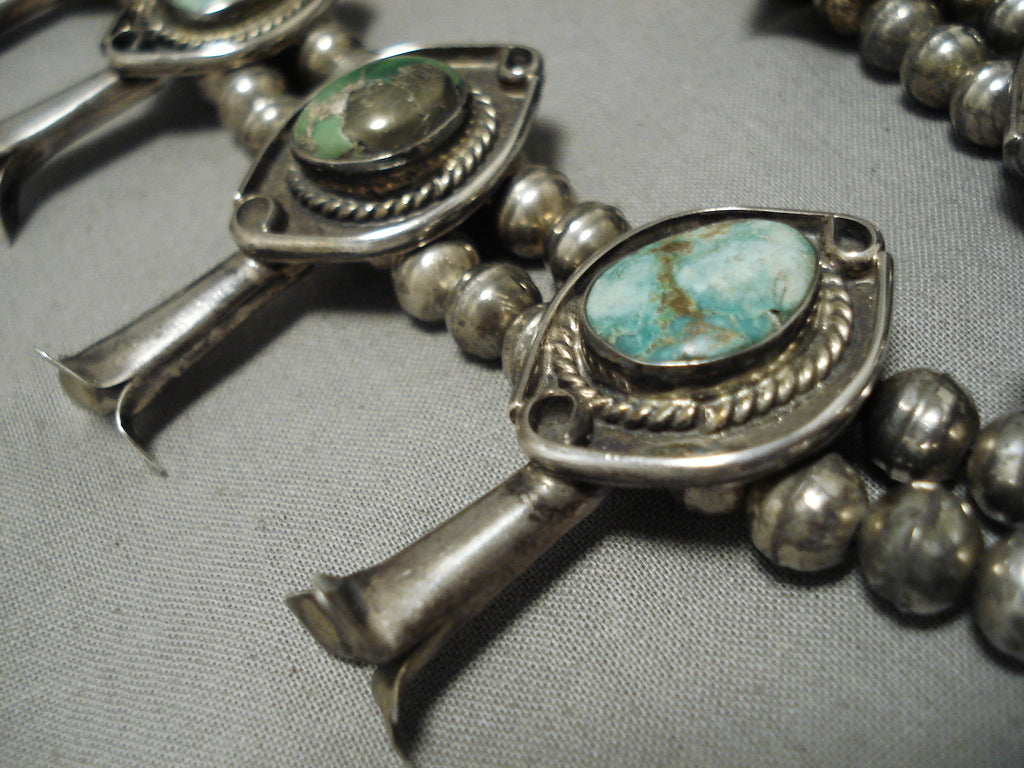 Carico Lake Turquoise Vintage Native American Navajo Sterling Silver Squash Blossom Necklace