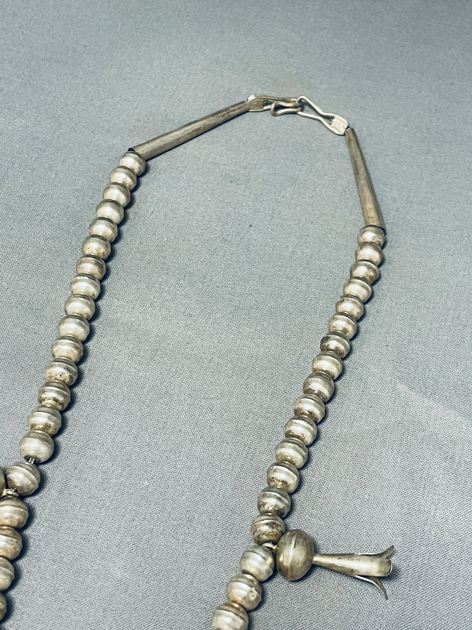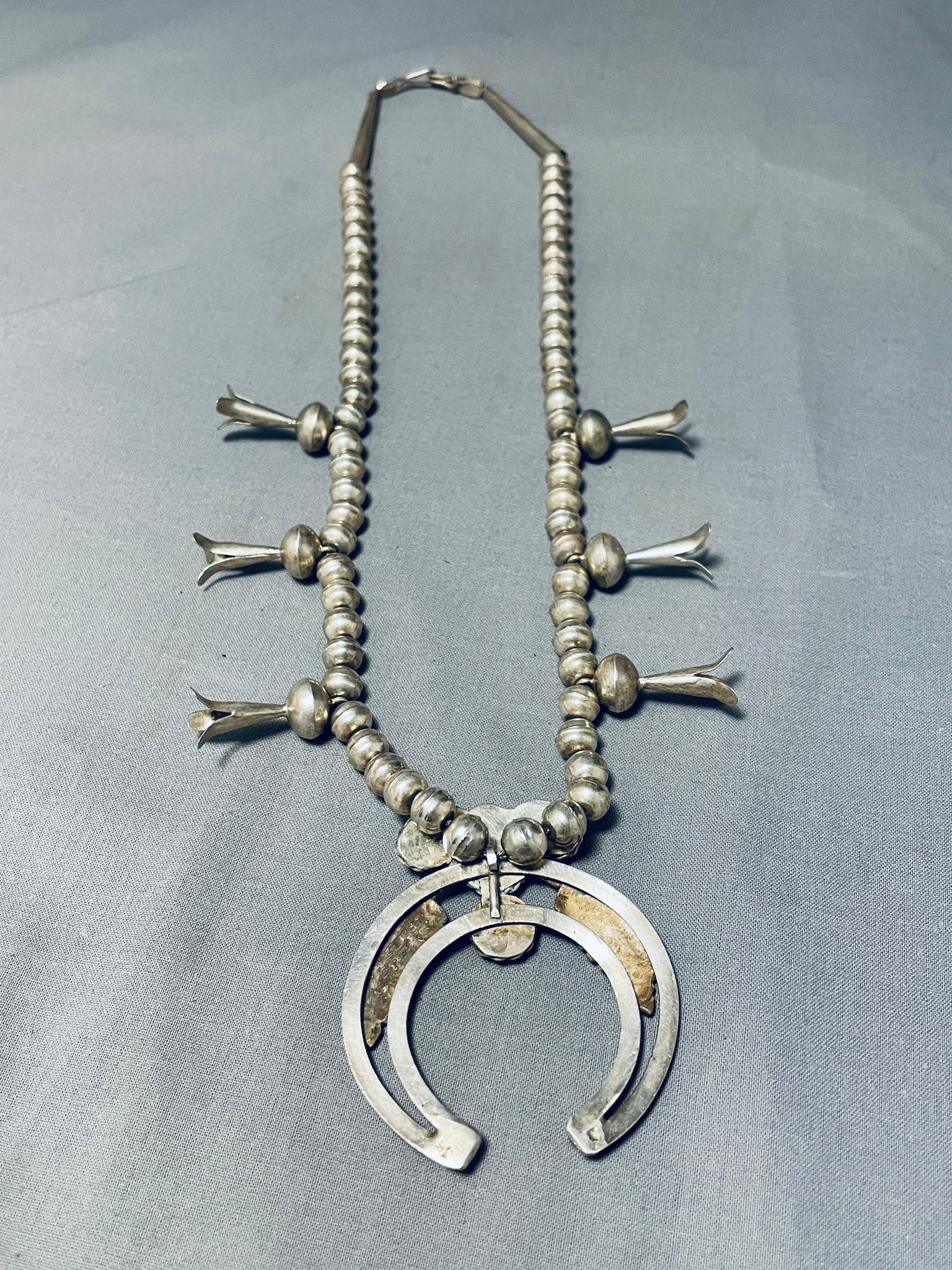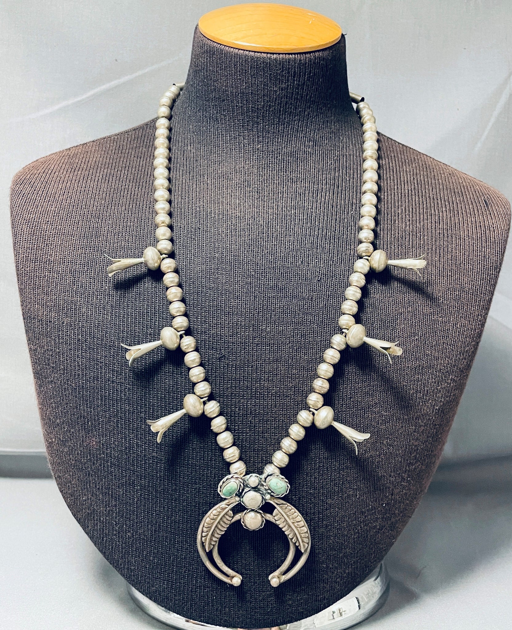 Carico Lake Turquoise Vintage Native American Navajo Sterling Silver Squash Blossom Necklace