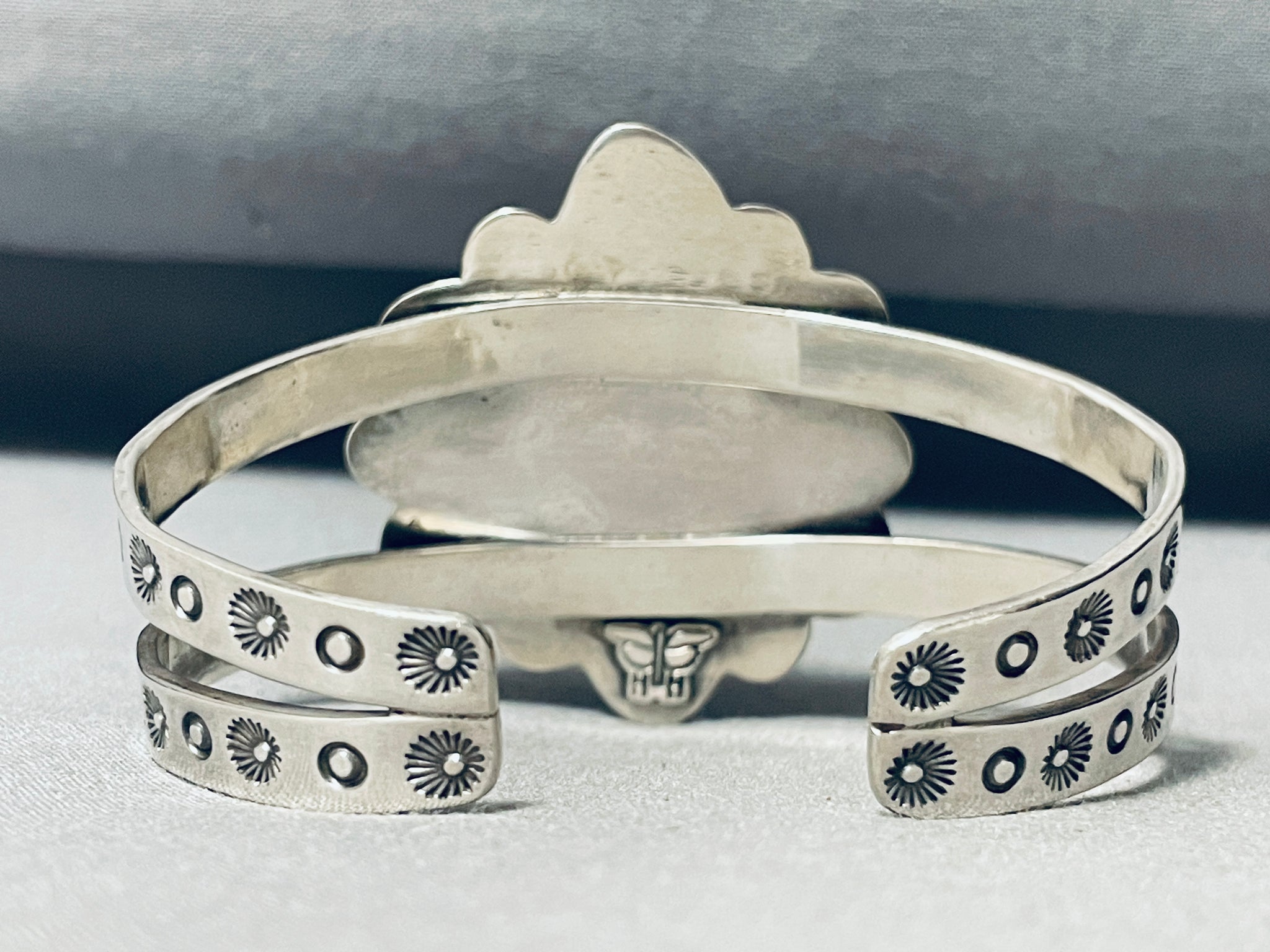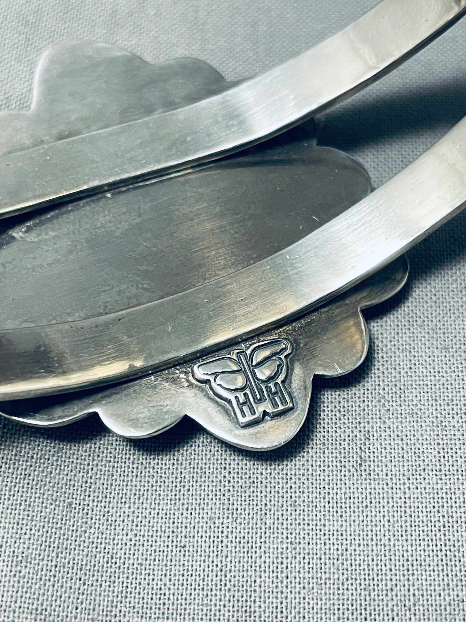 This is a striking turquoise cluster silver bracelet. This outstanding bracelet contains a beautiful cluster of large chunky Morenci turquoise stones. Situated throughout the stones are impeccable silver shells that are large. The silver plate the stones rest upon is beautiful and so amazing. This bracelet includes a marvelous double silver shank cuff that is large and thick. The shank cuff wonderfully graduates in width towards the center. Running down both ends of the cuff are superior silver star patterns and dotted works. I absolutely love the vibrant blue color of these stones. The center stone measures around 1/2" x 1/2". The width of the bracelet measures around 1-7/8". Signed by artist, HH with a dragonfly. Sterling silver. The inside end to end measures around 6" with an additional 1" gap. Sturdy 49 grams.