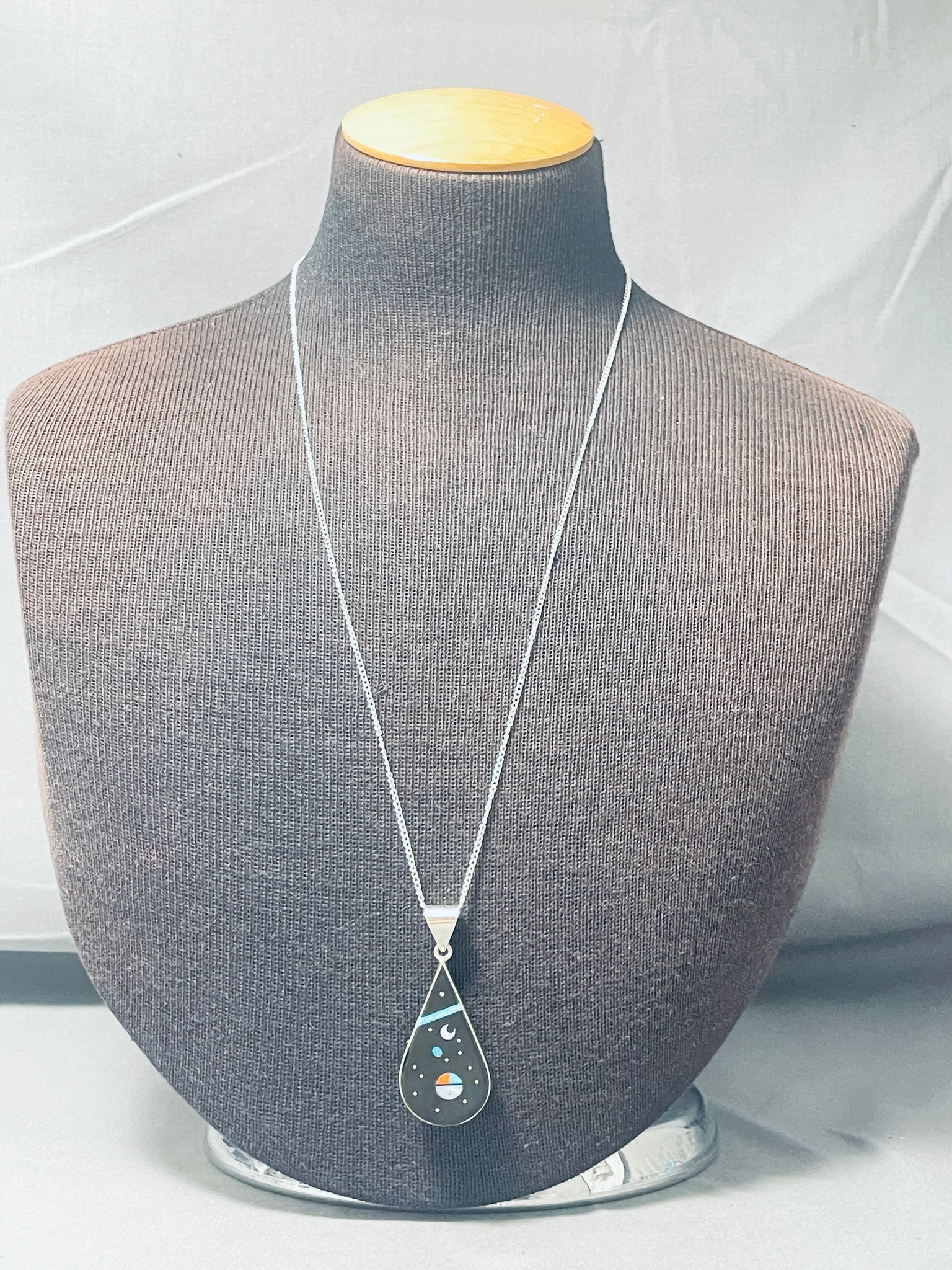 We are proud to offer this wonderful Navajo silver necklace having a teardrop pendant with inlay jet, turquoise, coral and mother of pearl cosmic designs and floating sunface! This extraordinary piece has a handcarved silver bail, silver chain and silver clasp! Absolutely Breathtaking! The teardrop pendant measures about 2-1/4" x 1". Sterling silver, marked. Signed by Navajo artist, H. Smith. The length of the necklace measures around 27". Sturdy 9 grams.
