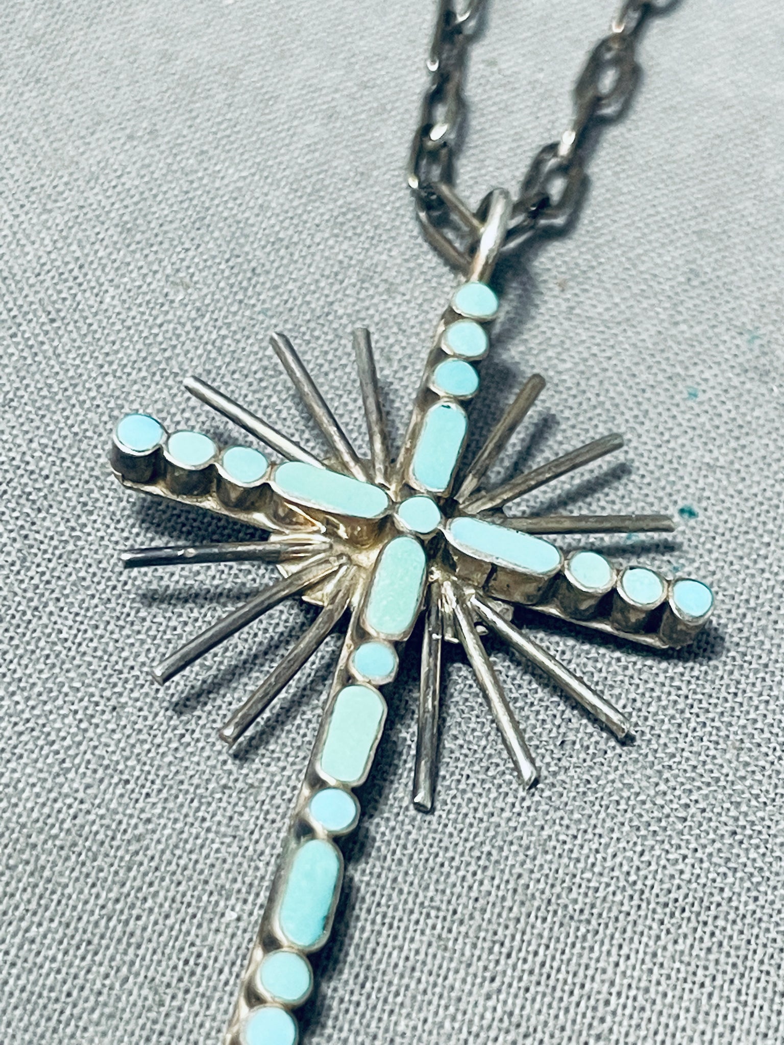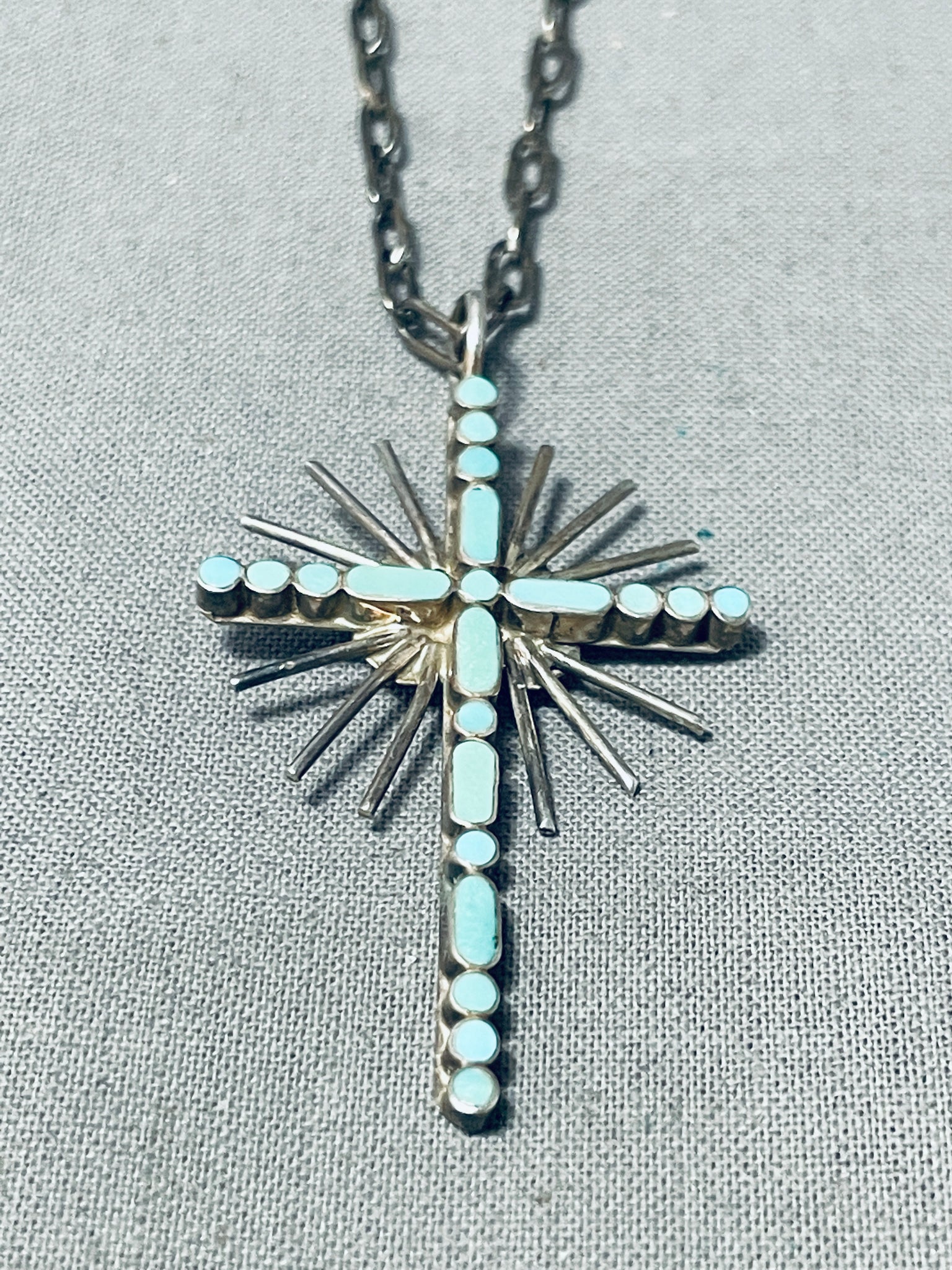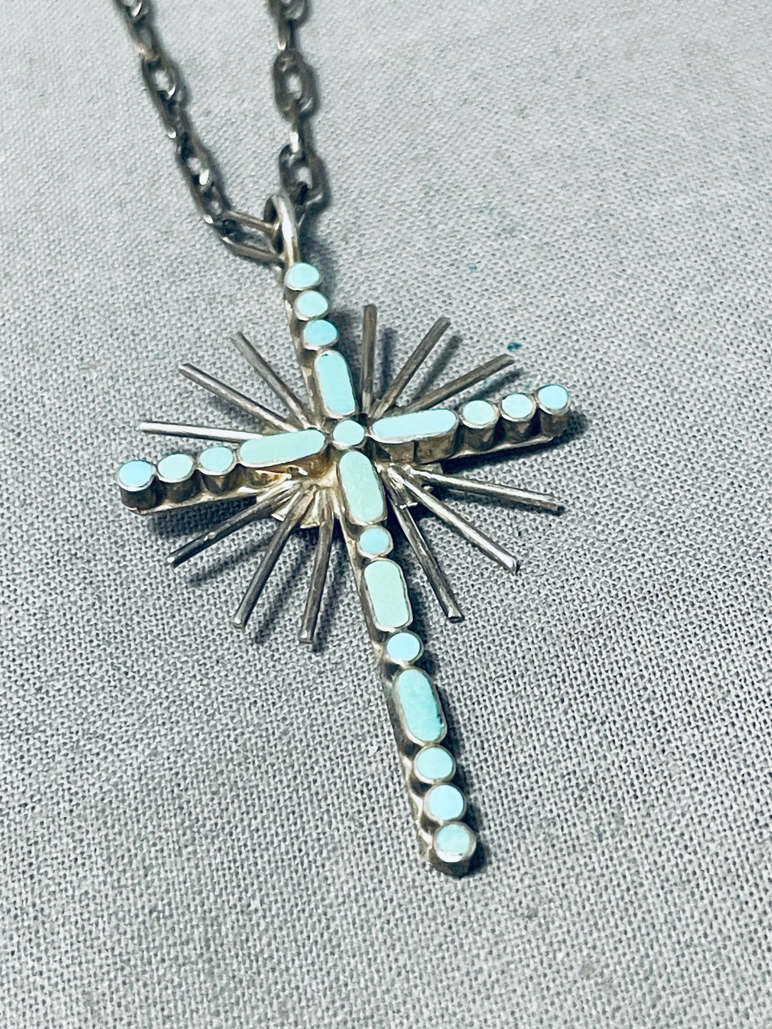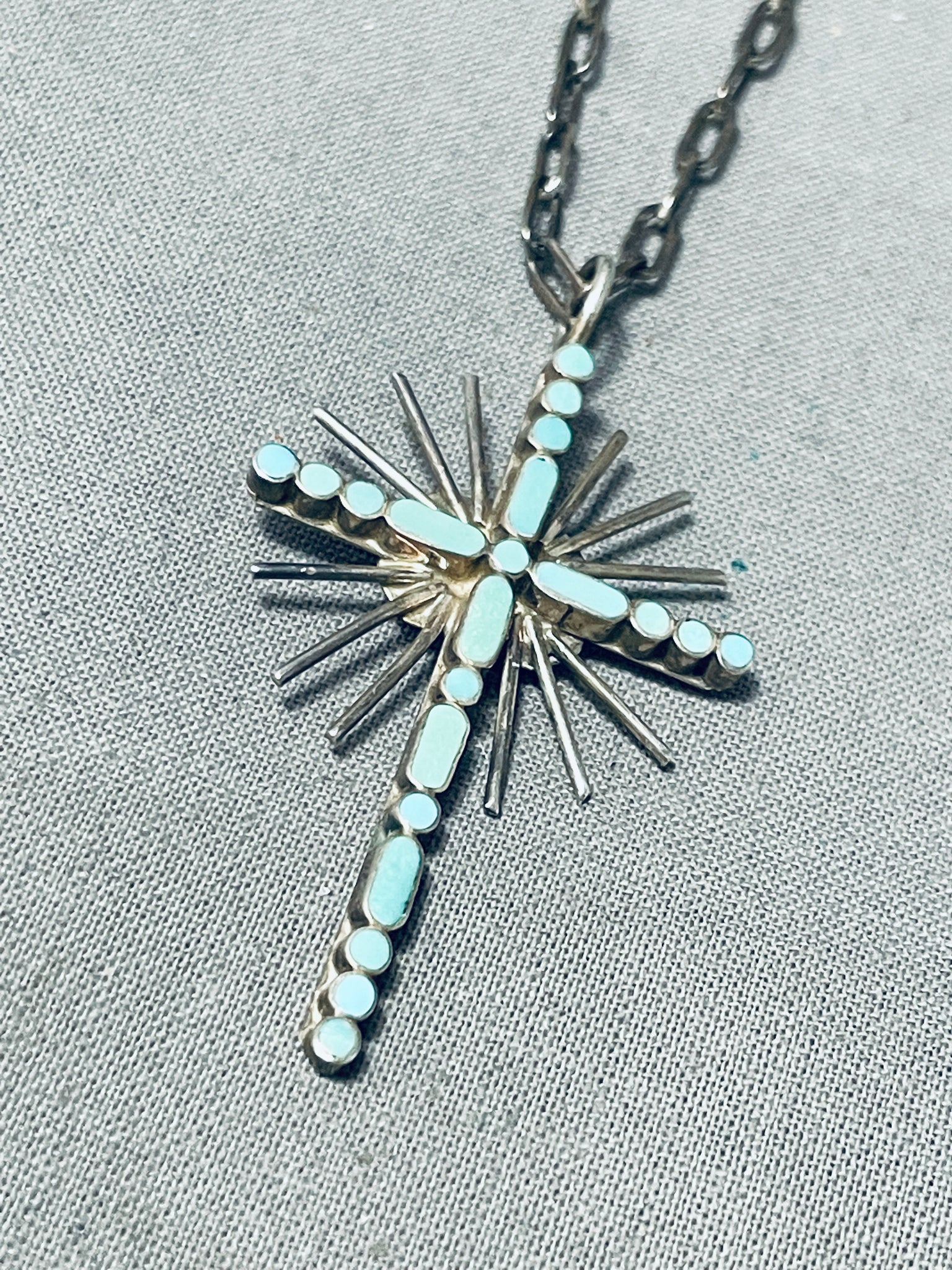 Celestial Vintage Native American Zuni Inlay Blue Gem Turquoise Sterling Silver Cross Necklace