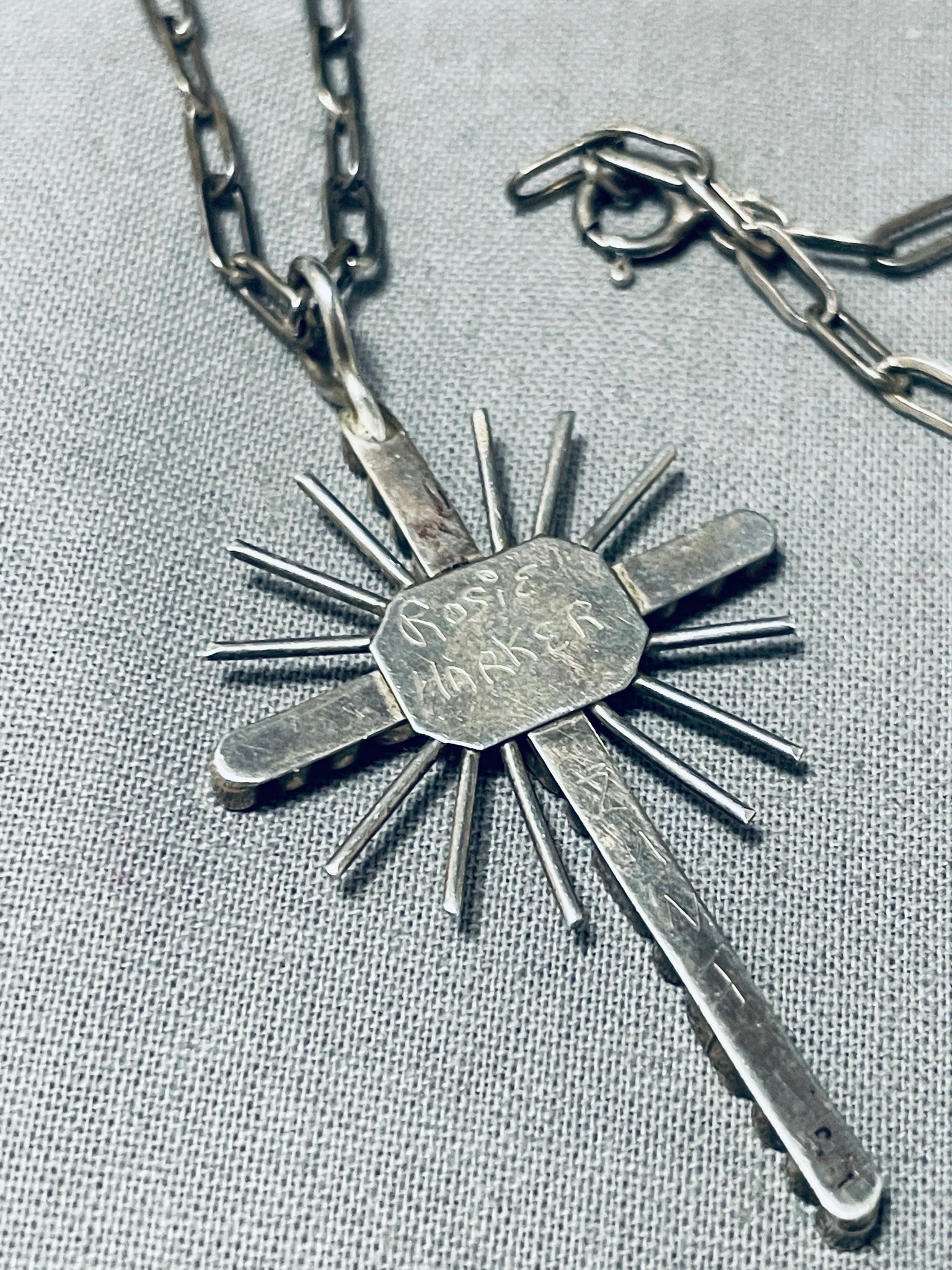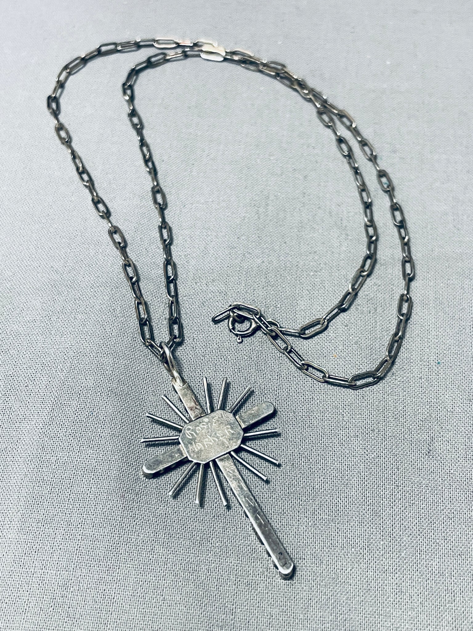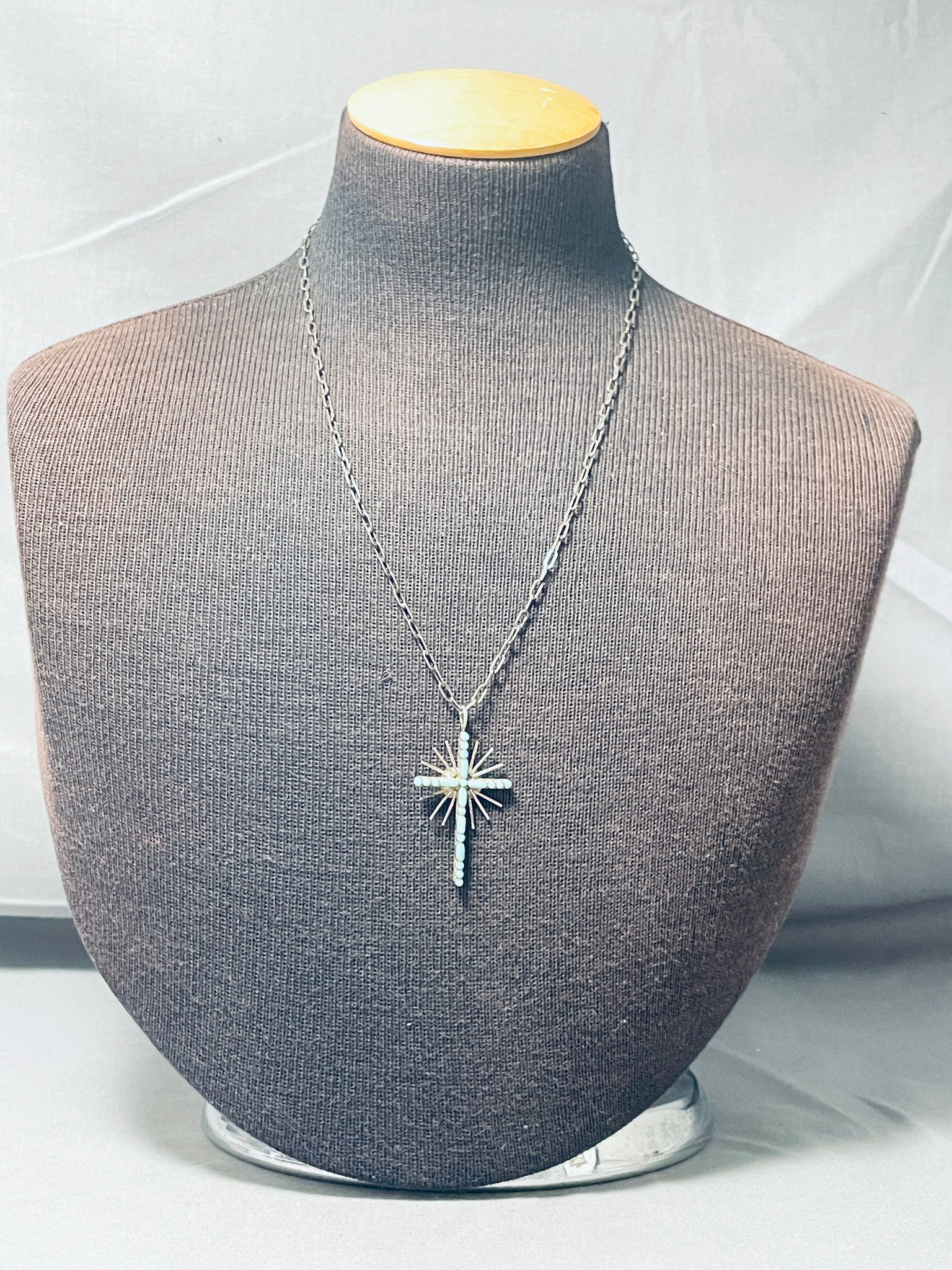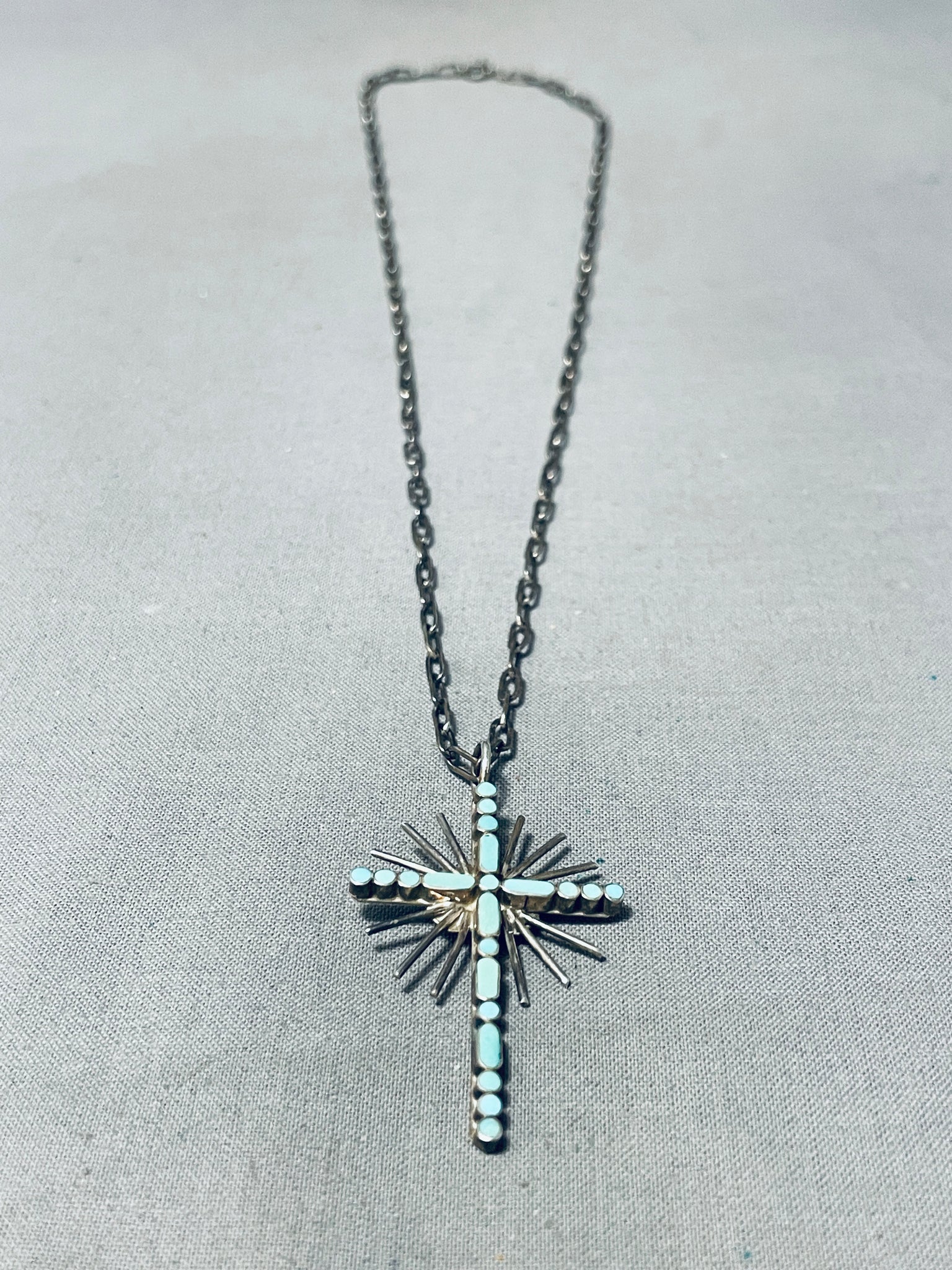 Celestial Vintage Native American Zuni Inlay Blue Gem Turquoise Sterling Silver Cross Necklace