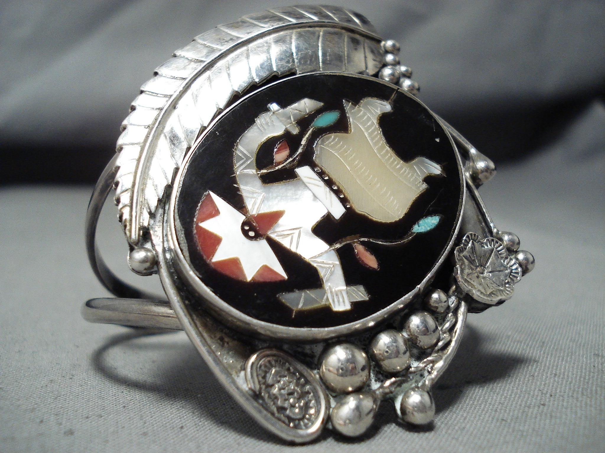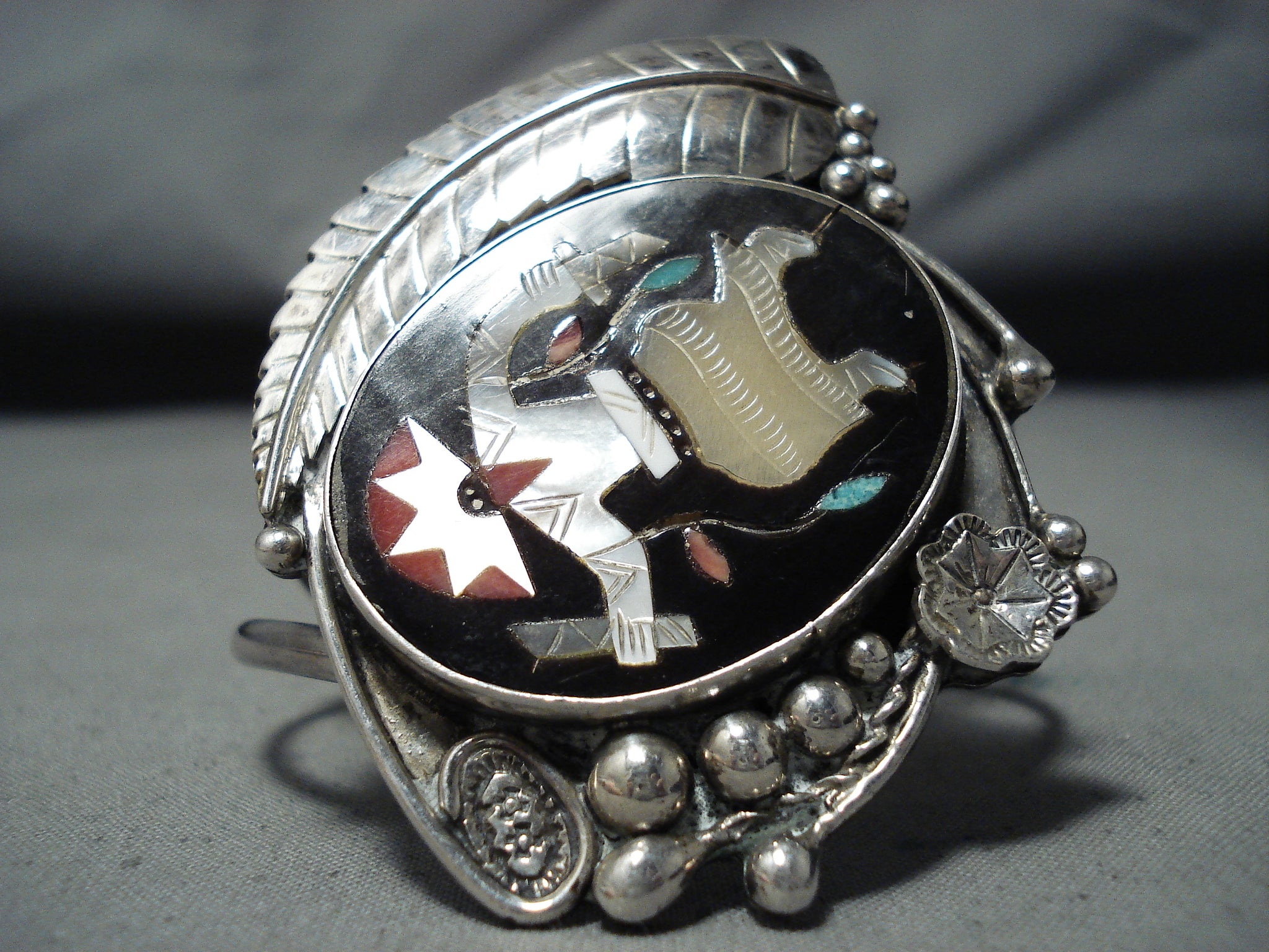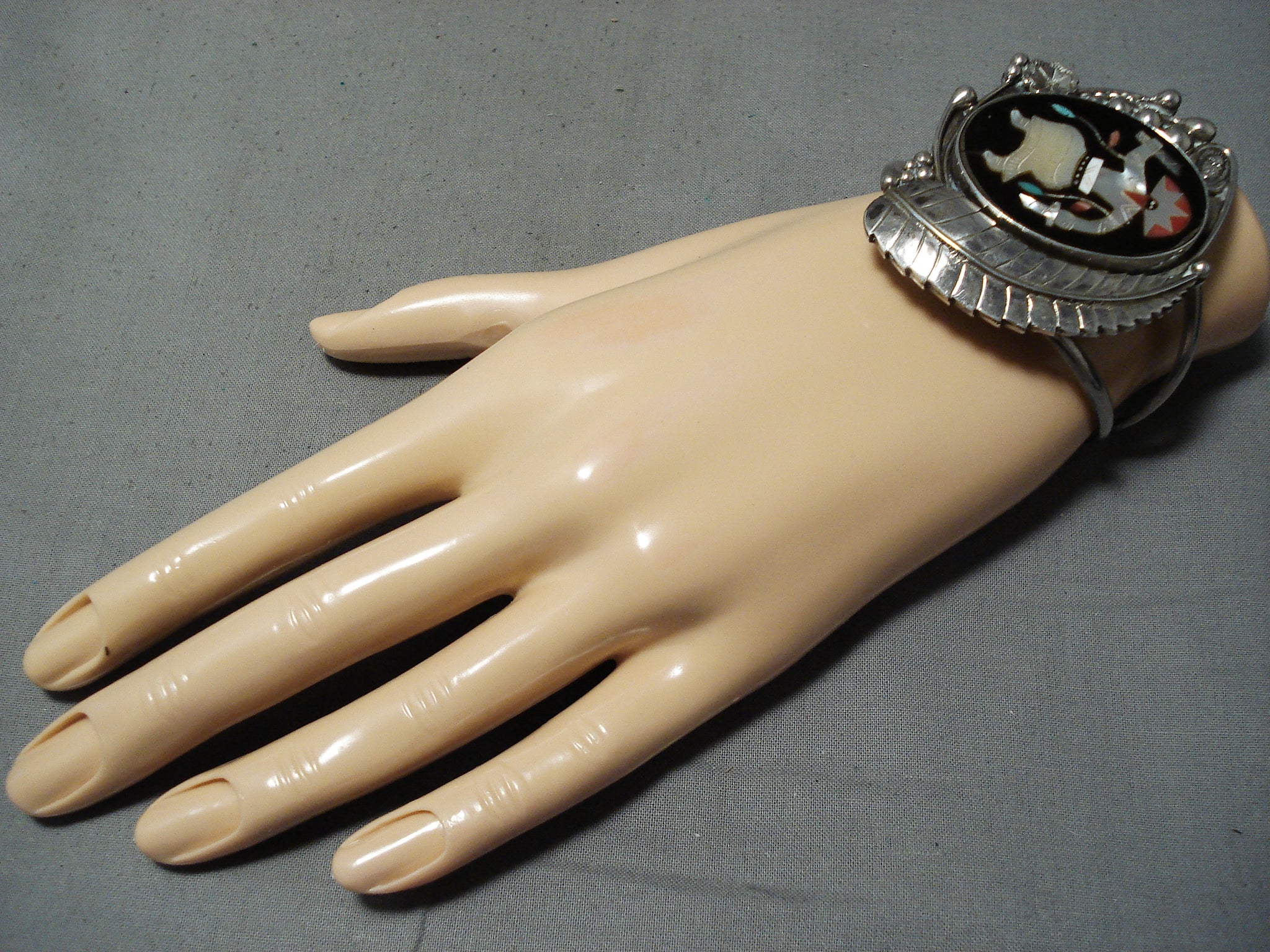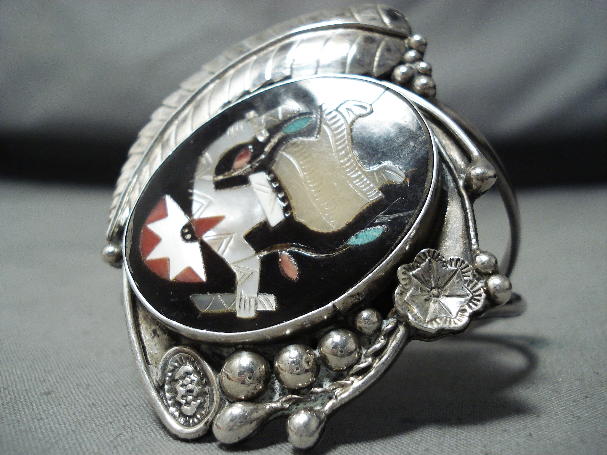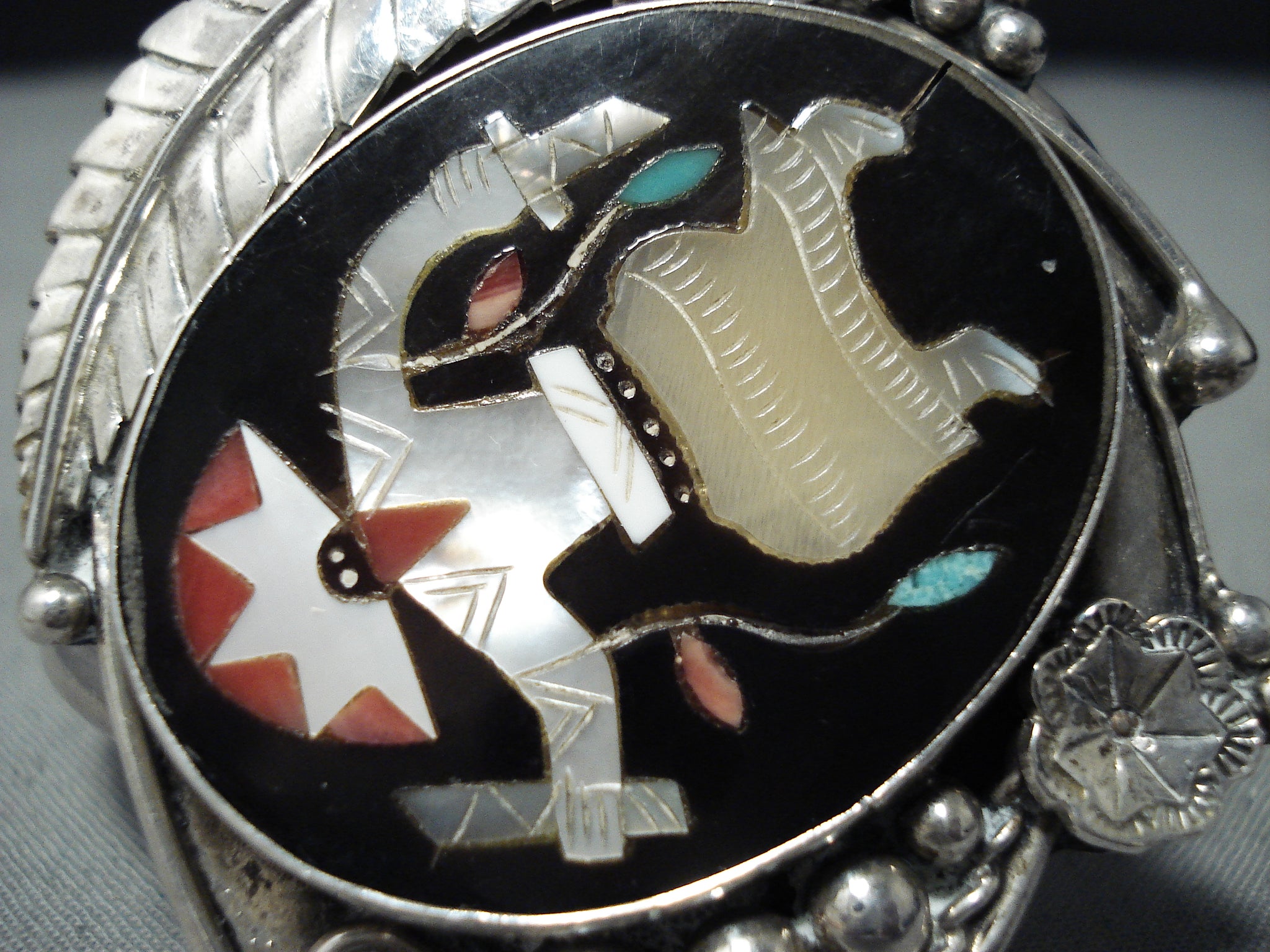 Ceremonial Kachina Vintage Native American Zuni Turquoise Sterling Silver Inlay Bracelet