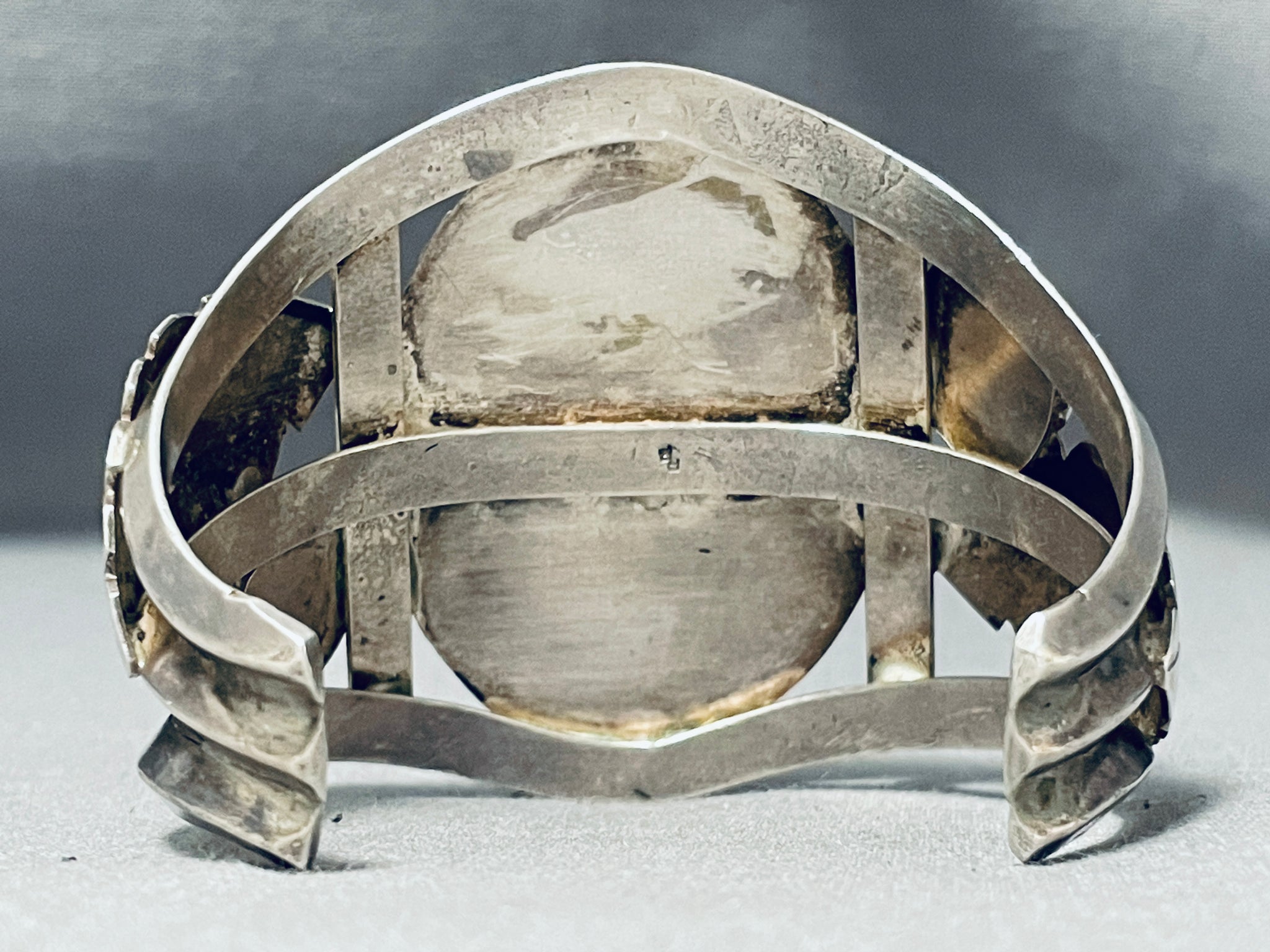 This is a fascinating vintage Navajo inlaid dancing kachina silver bracelet. This impressive bracelet contains a large center hand inlaid dancing kachina that consists of beautiful mother of pearl, onyx, coral, and turquoise. Surrounding the inlay work are large silver raindrops with side accenting thick and sturdy silver flanks. Also situated at the sides of the stunning thick and sturdy triple silver shank cuff are outstanding large handmade silver leaves with accenting chunky turquoise stones. The width of the bracelet measures around 2-1/8". Sterling silver. Cir. Mid century . The inside end to end measures around 5" with an additional 1-1/2" gap. Sturdy 71 grams.