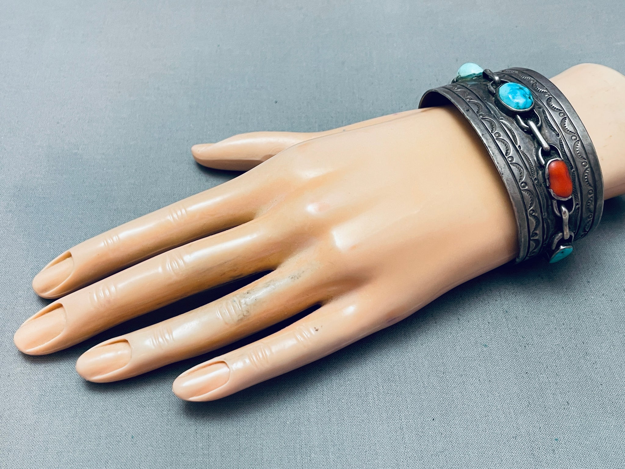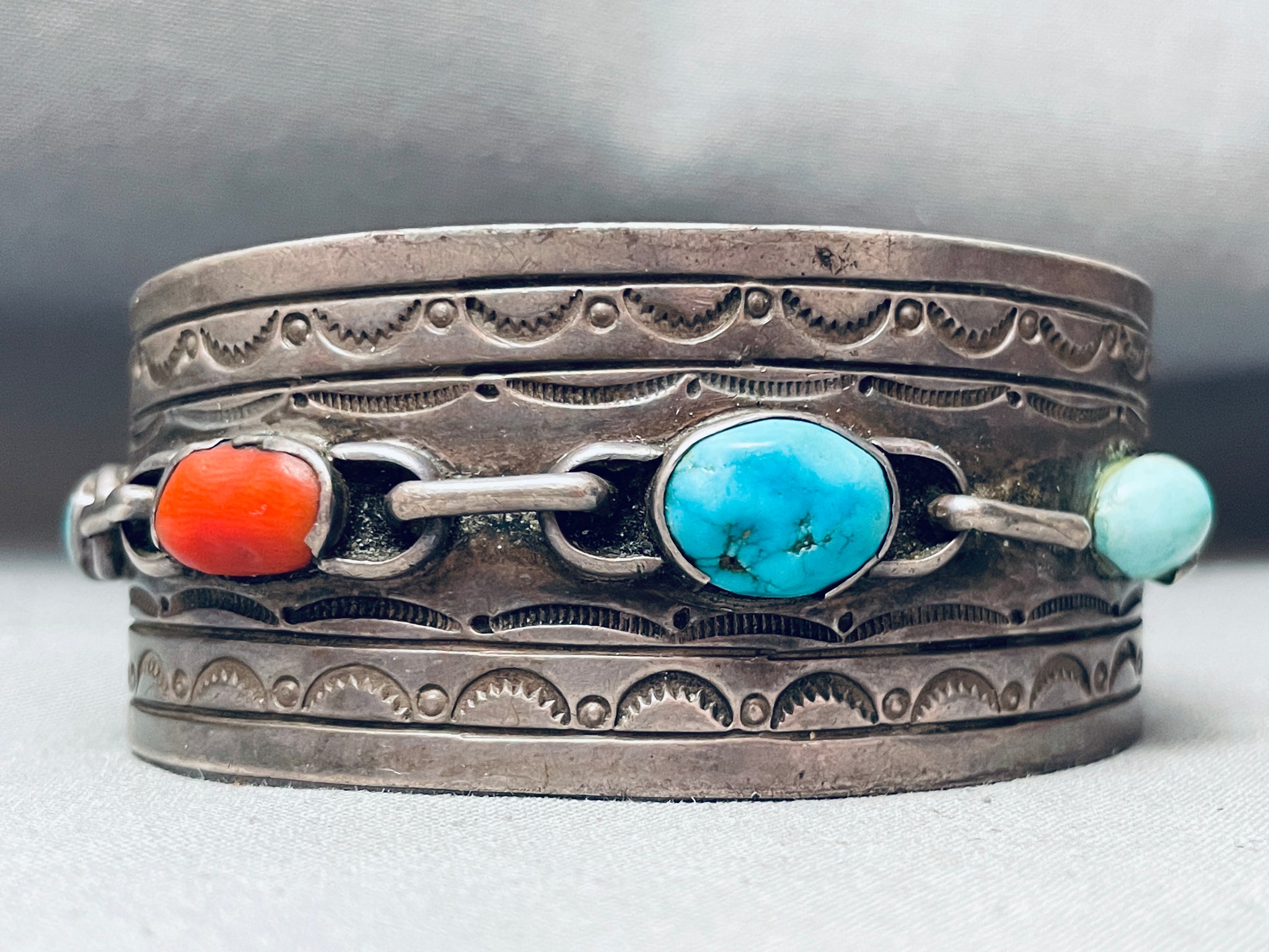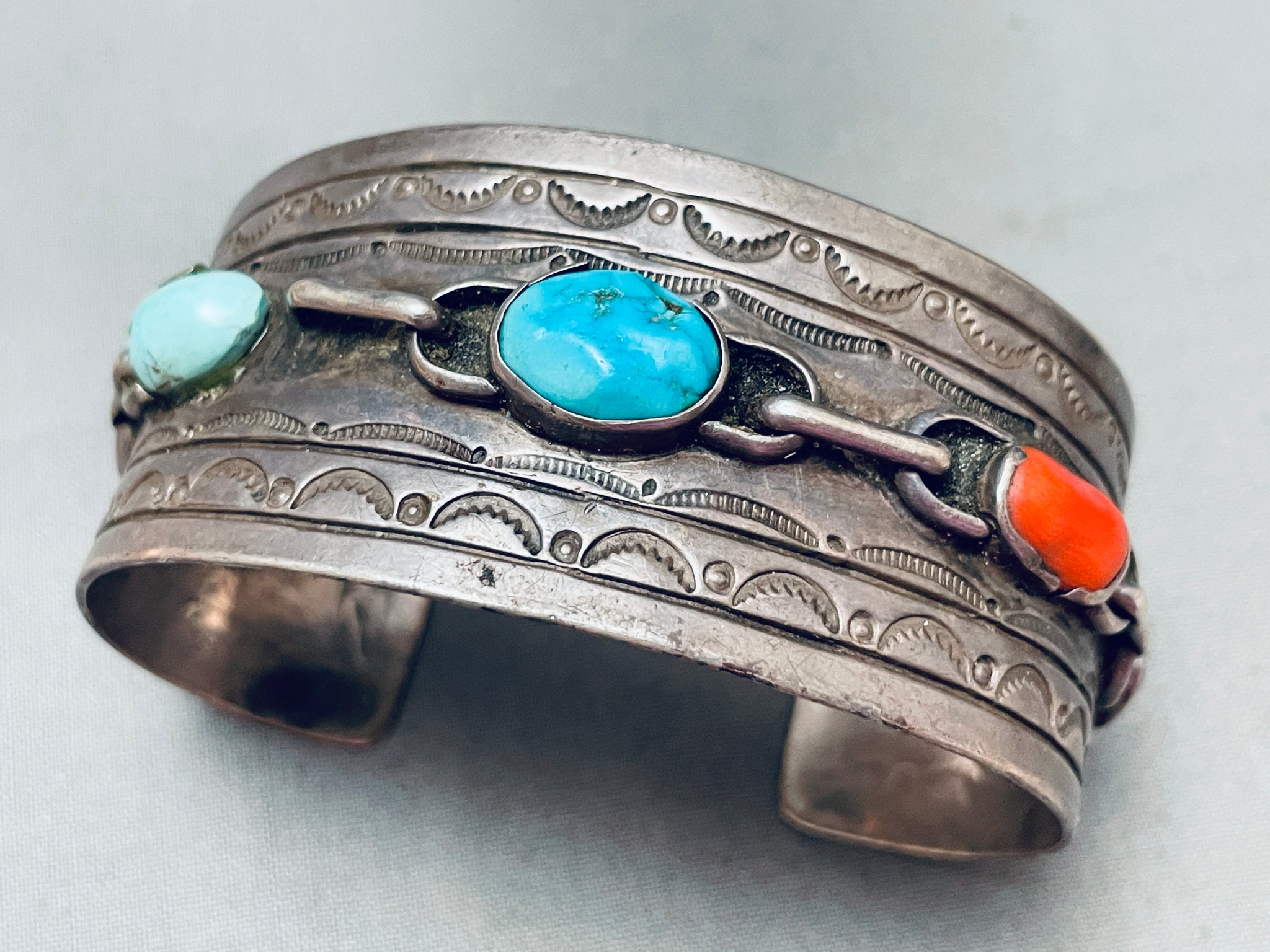 This is a remarkable vintage Navajo multiple stone silver cuff bracelet. This fascinating bracelet contains five chunky turquoise stones that graduate in size towards the center. The stones consist of coral, Sleeping Beauty turquoise and Blue Gem turquoise. Located around the stones are beautiful silver link chain patterns. Running from one end to the other end of the wide thick silver cuff are impressive silver stampings that consist of line segments, sun stampings, and dotted works. The old natural patina on this bracelet is superior. The center stone measures around 1/2" x 3/8". The width of the bracelet measures around 1-1/4". Sterling silver. Cir. 1970's+. The inside end to end measures around 5-3/4" with an additional 1-1/4" gap. Sturdy 50 grams.