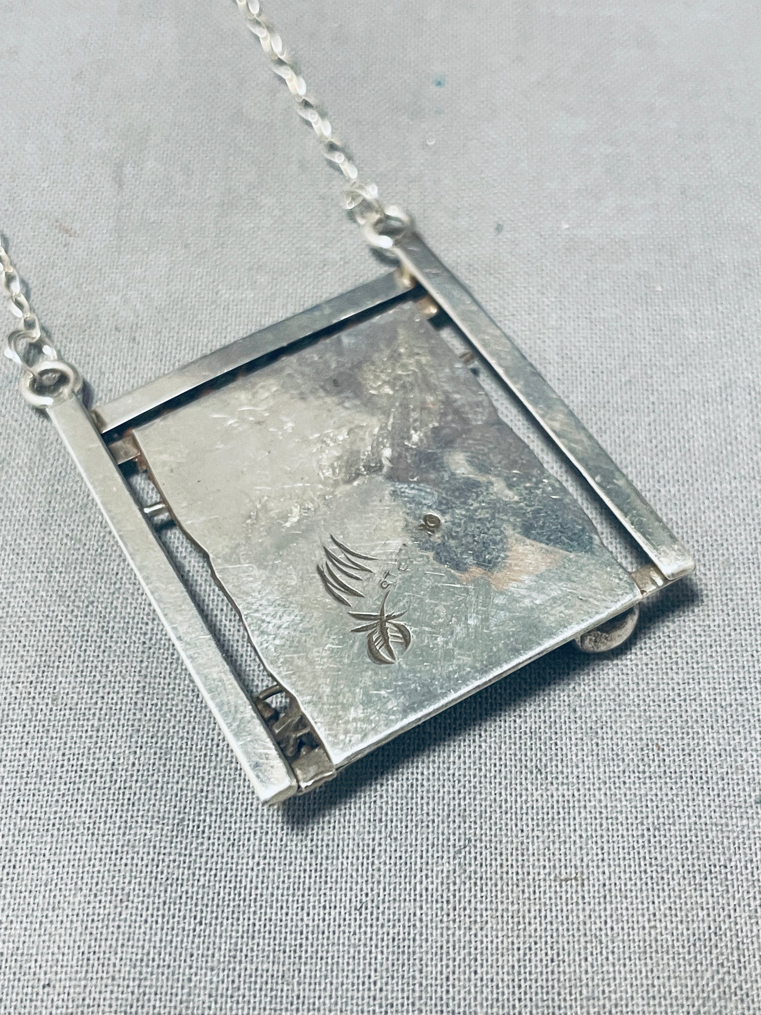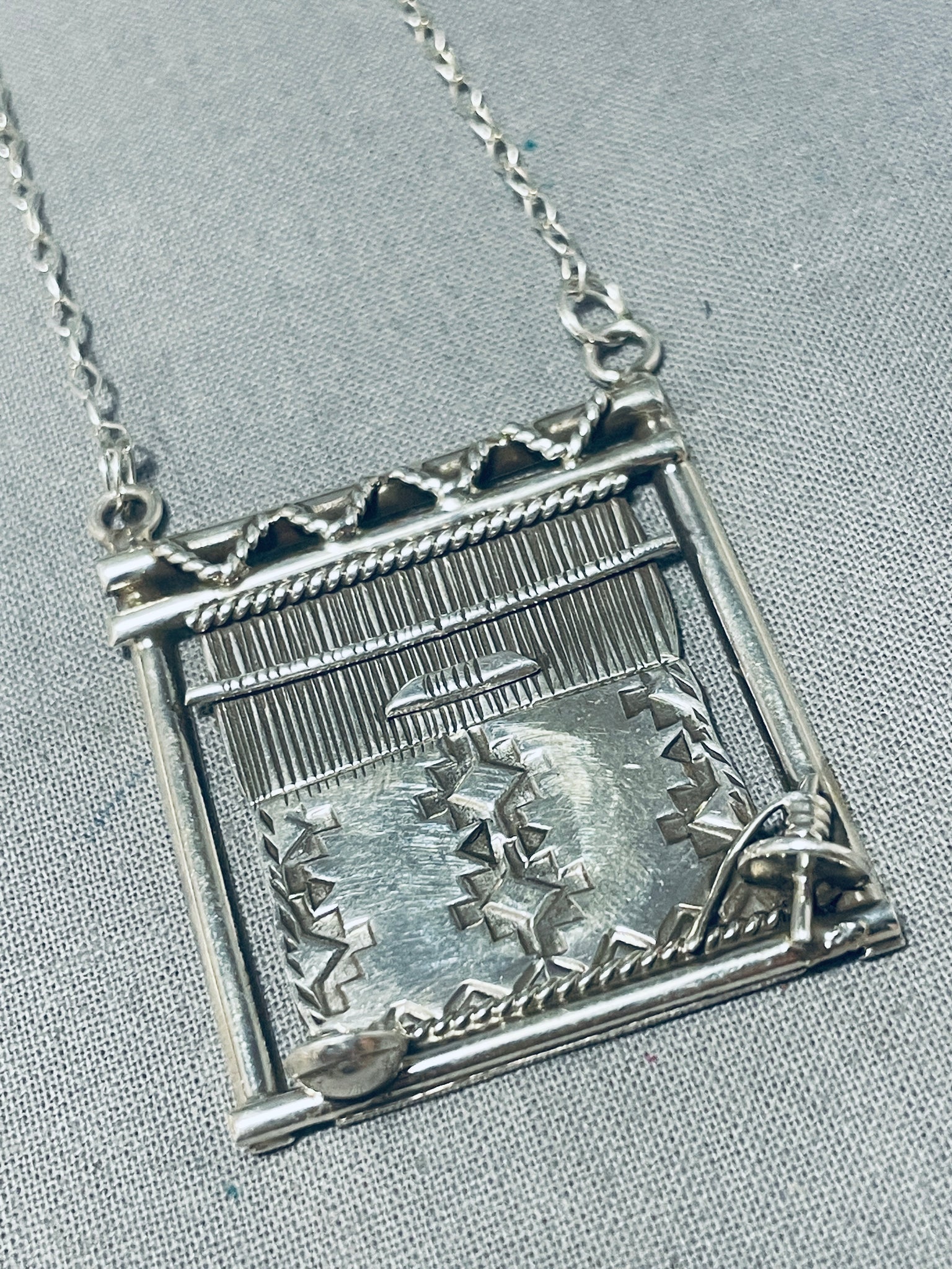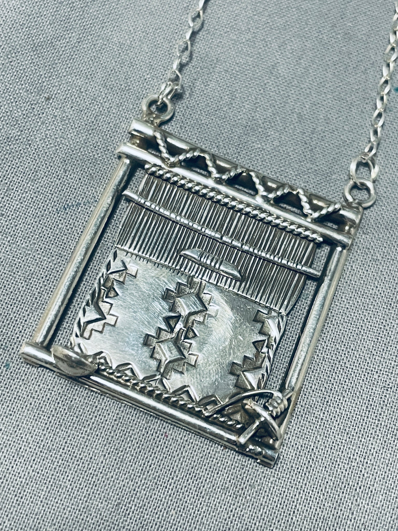 Here we have a fantastic Navajo necklace! It features a handcarved detailed silver loom pendant with a silver Navajo rug, and a silver clasp! This necklace is one of a kind! Sterling silver, marked. Signed by Navajo artist, Nelson Morton. The length of the necklace measures around 22". Sturdy 14 grams.