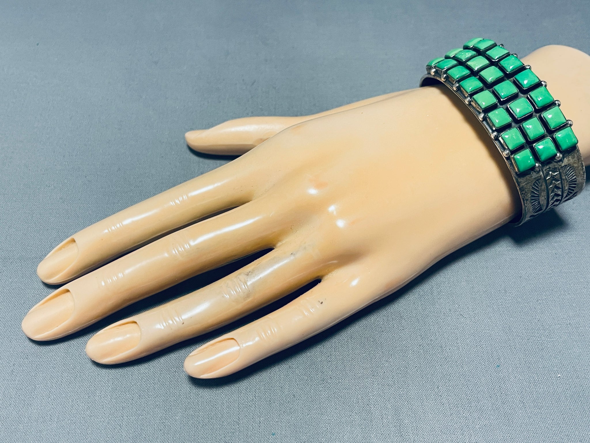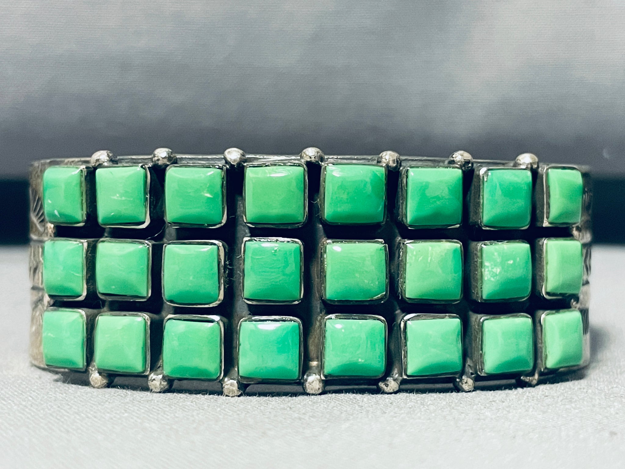 This is a superior vintage Navajo three row turquoise silver cuff bracelet. This outstanding bracelet contains three impressive rows of beautiful square shaped green gaspeite stones. Situated around the edges of the outer stones are stunning silver raindrops. Running down both ends of the wide and thick silver cuff are fascinating deep silver stamp works that consist of plants works, sun stampings, teepees and line segments. The intricacy and detailing on this piece is so remarkable. The stones measure around 3/16" x 3/16". The width of the bracelet measures around 7/8". Sterling silver. Cir. Mid century . The inside end to end measures around 5-3/4" with an additional 1" gap. Sturdy 59 grams.