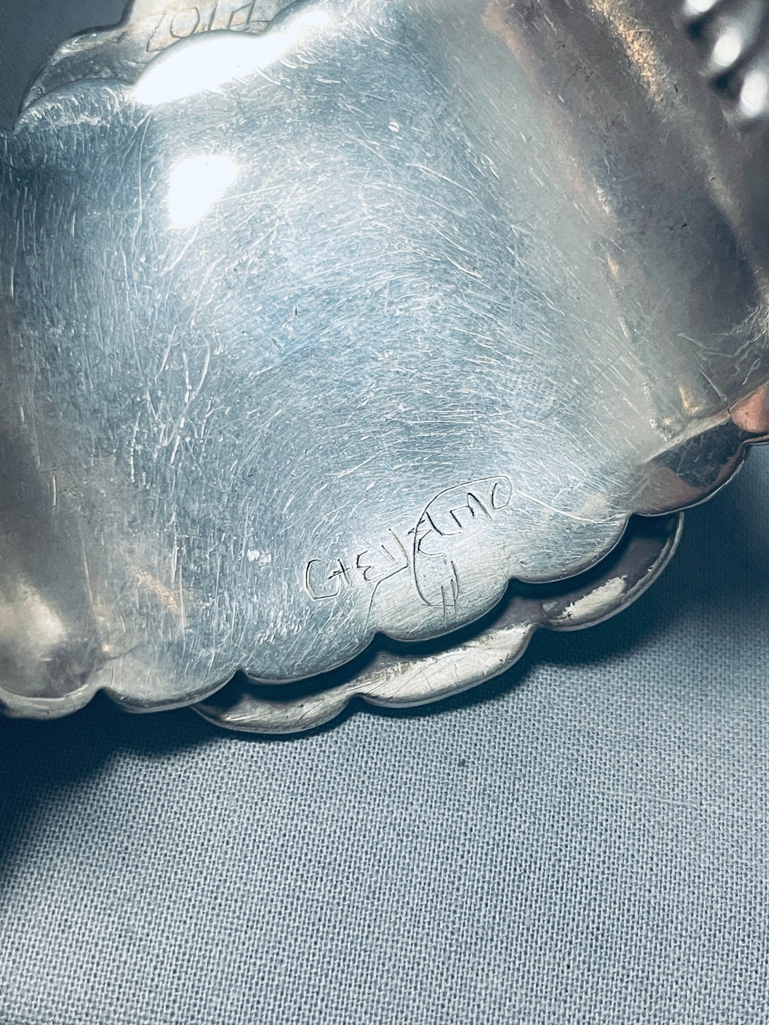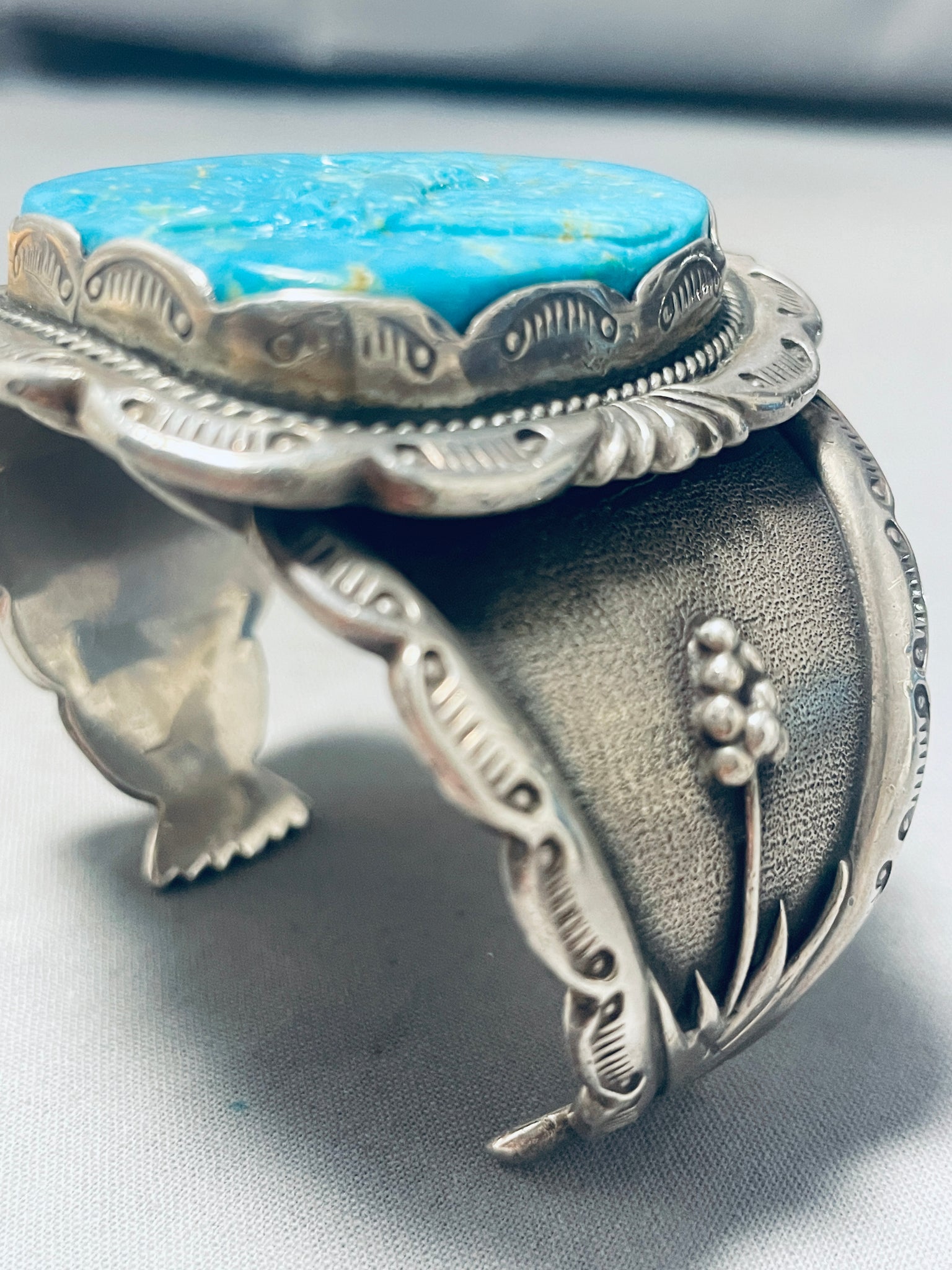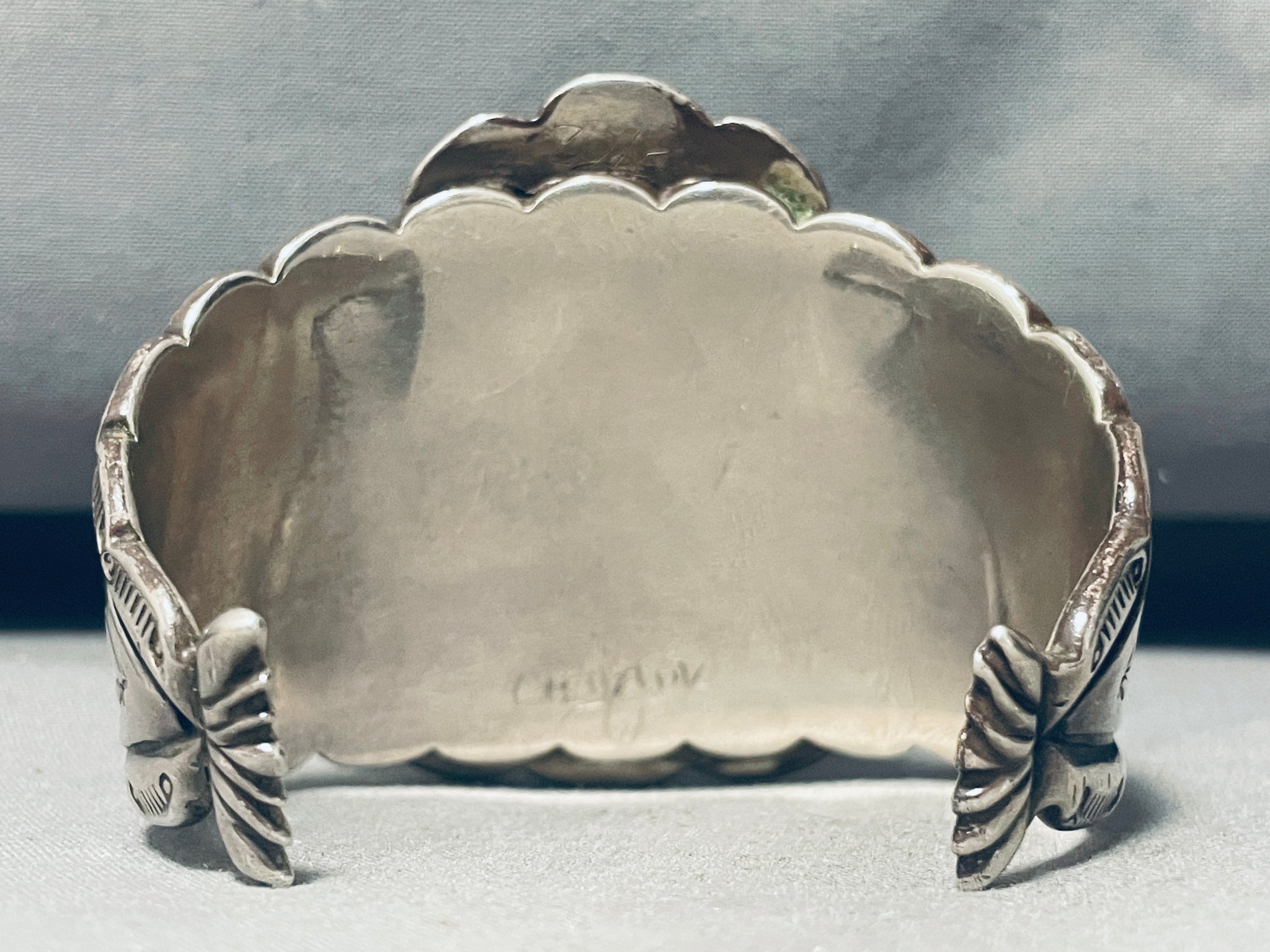 This is an incredible vintage Navajo single stone silver bracelet. This fascinating bracelet contains a large hand carved roadrunner bird that is hand carved into a beautiful vibrant blue turquoise stone. Surrounding the stone are phenomenal ropes, sun stampings, dotted works, and wave works. Running down the ends of the thick cuff bracelet are 3D silver yucca plants that are extremely detailed. Bordering the edges of the wide graduating silver cuff bracelet are protruding edges that consist of sun stampings and wave works. What I love about this bracelet is that the center of the stone consists of the New Mexico state bird which is a roadrunner and the New Mexico state flower which is the yucca plant. The bracelet is absolutely beautiful. The center stone measures around 1-5/8" x 1-1/4". The width of the bracelet measures around 2-3/8". Signed by Navajo artist, Chei Elmo. Sterling silver. Cir. 1970's+. The inside end to end measures around 5-1/4" with an additional 1-1/4" gap. Sturdy 106 grams.