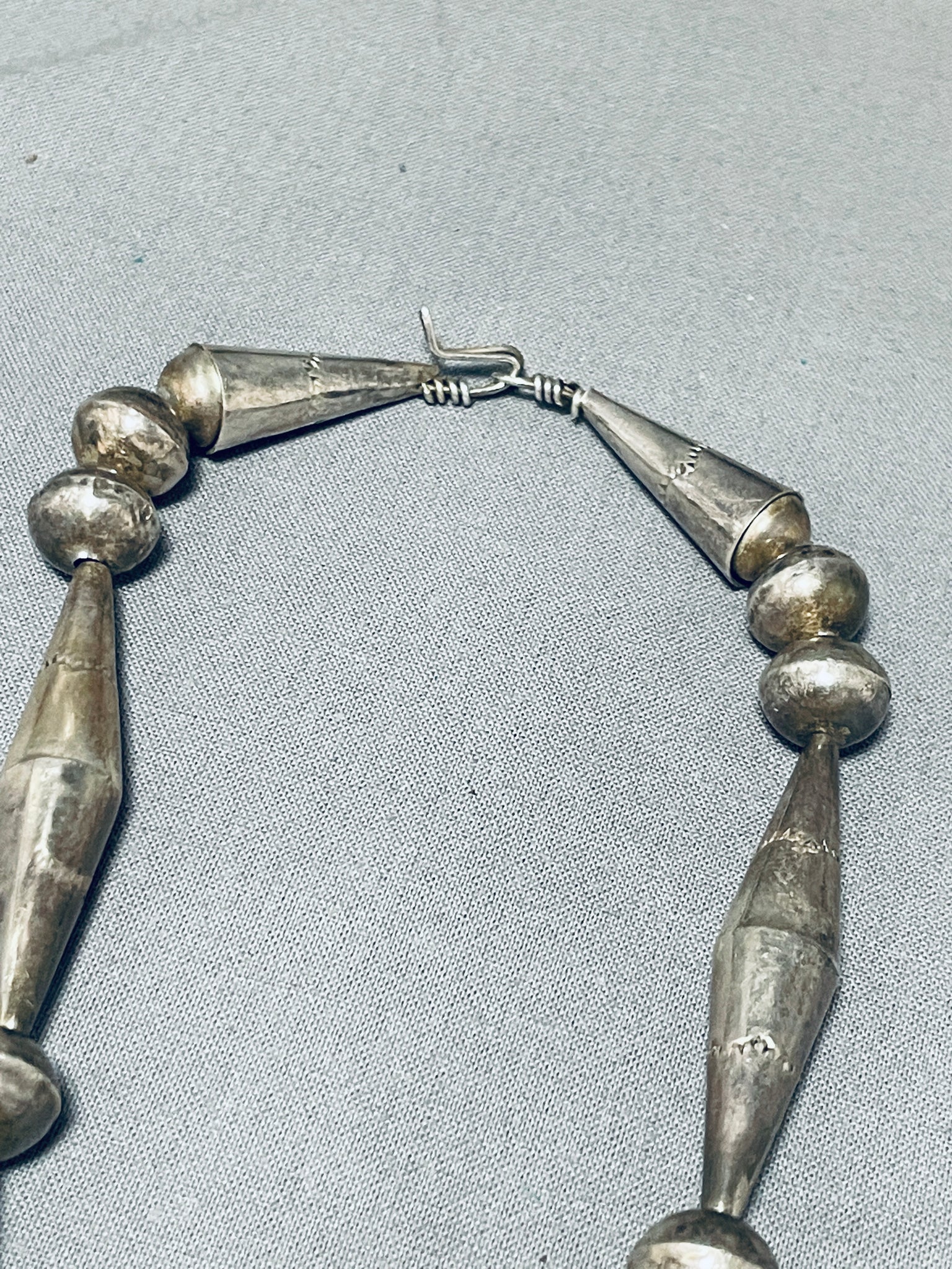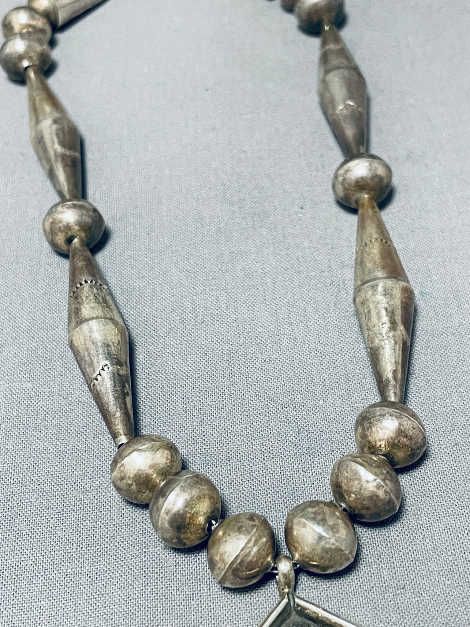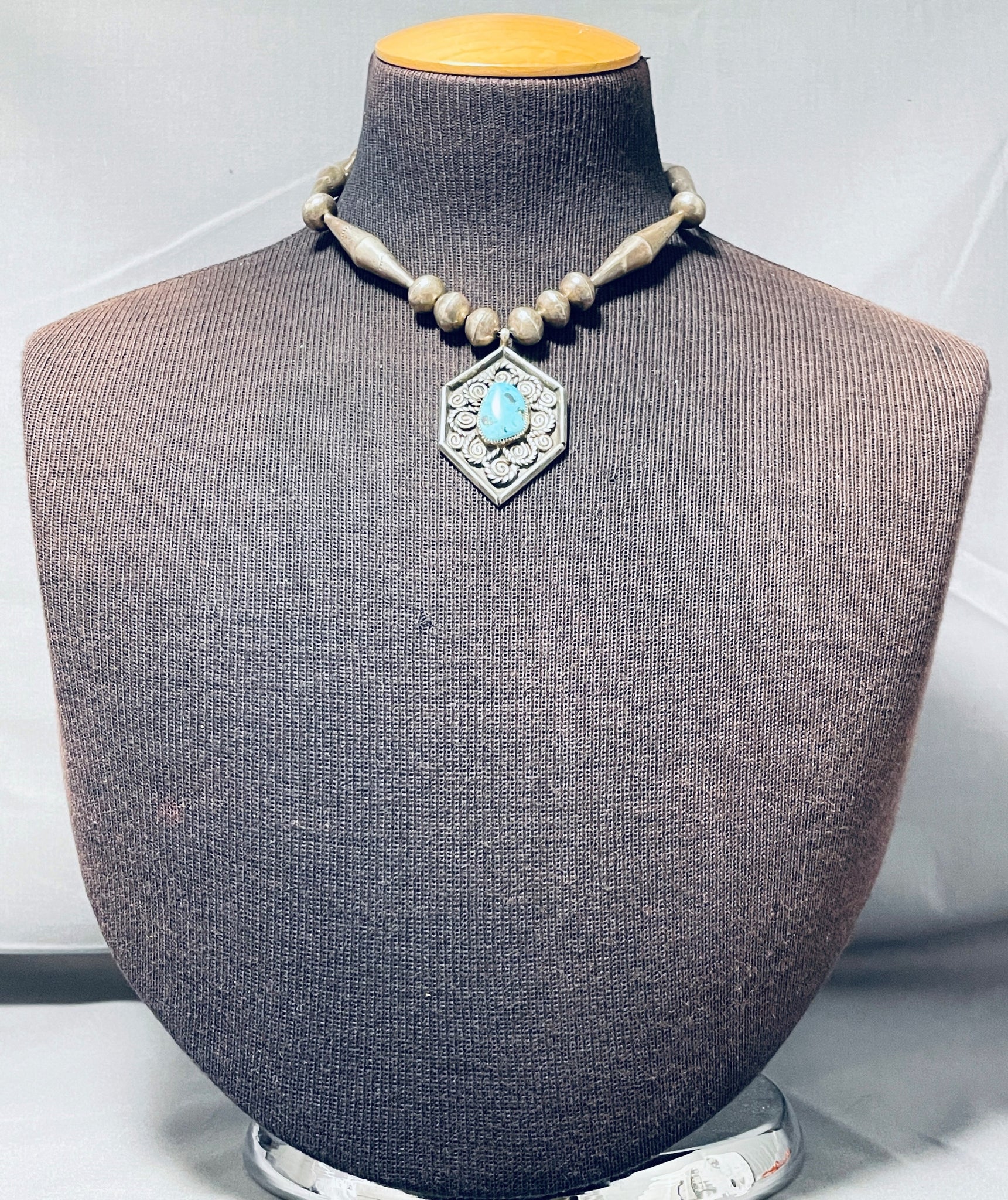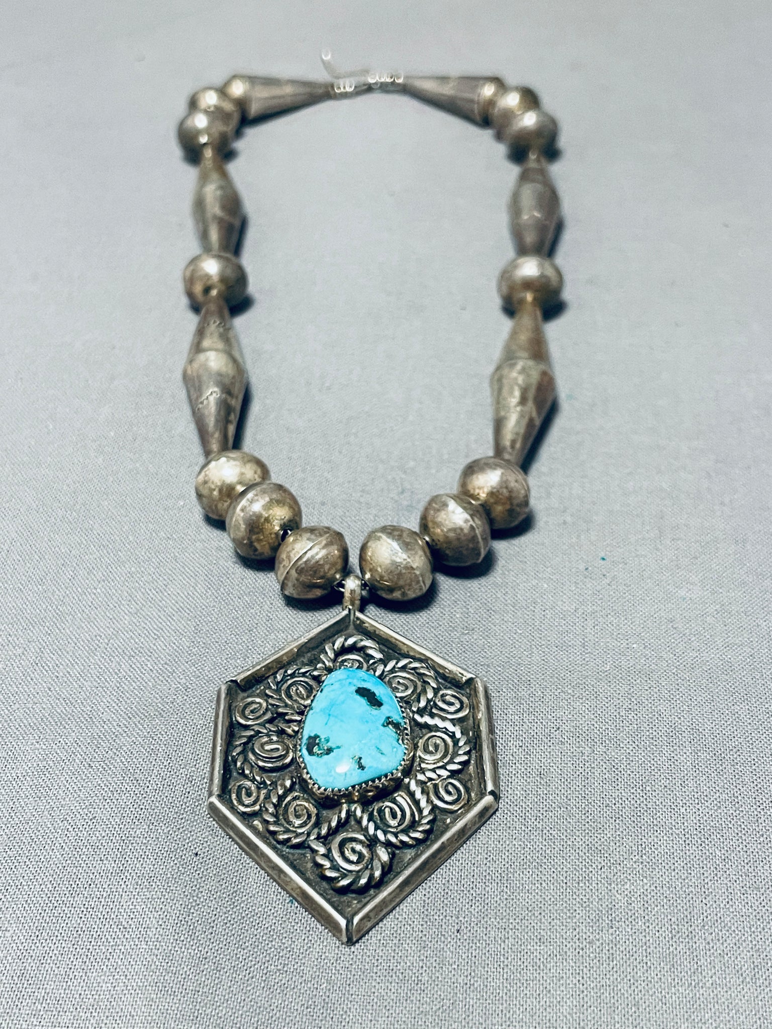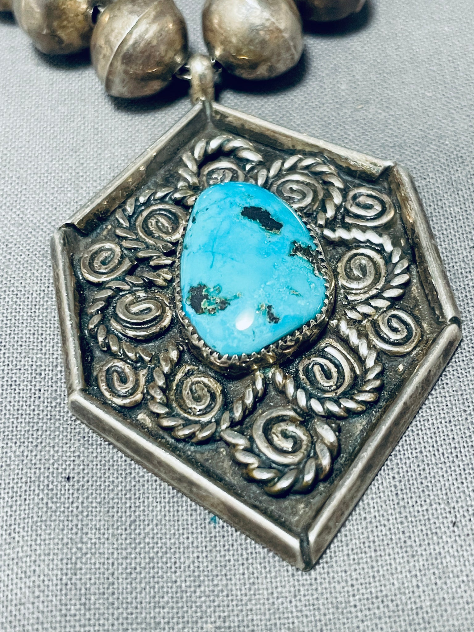 We are proud to offer this monumental vintage Navajo silver necklace having a large handcarved silver pendant with a Godber turquoise center surrounded by swirling silver rope and stems! This incredible necklace has a single strand of handcarved silver torpedo and round beads with silver cones and a handmade silver hook and eye clasp! Absolutely Brilliant! The turquoise stone measures about 3/4" x 1/2". Sterling silver. The length of the necklace measures around 17". Sturdy 42 grams. Cir Mid Century.