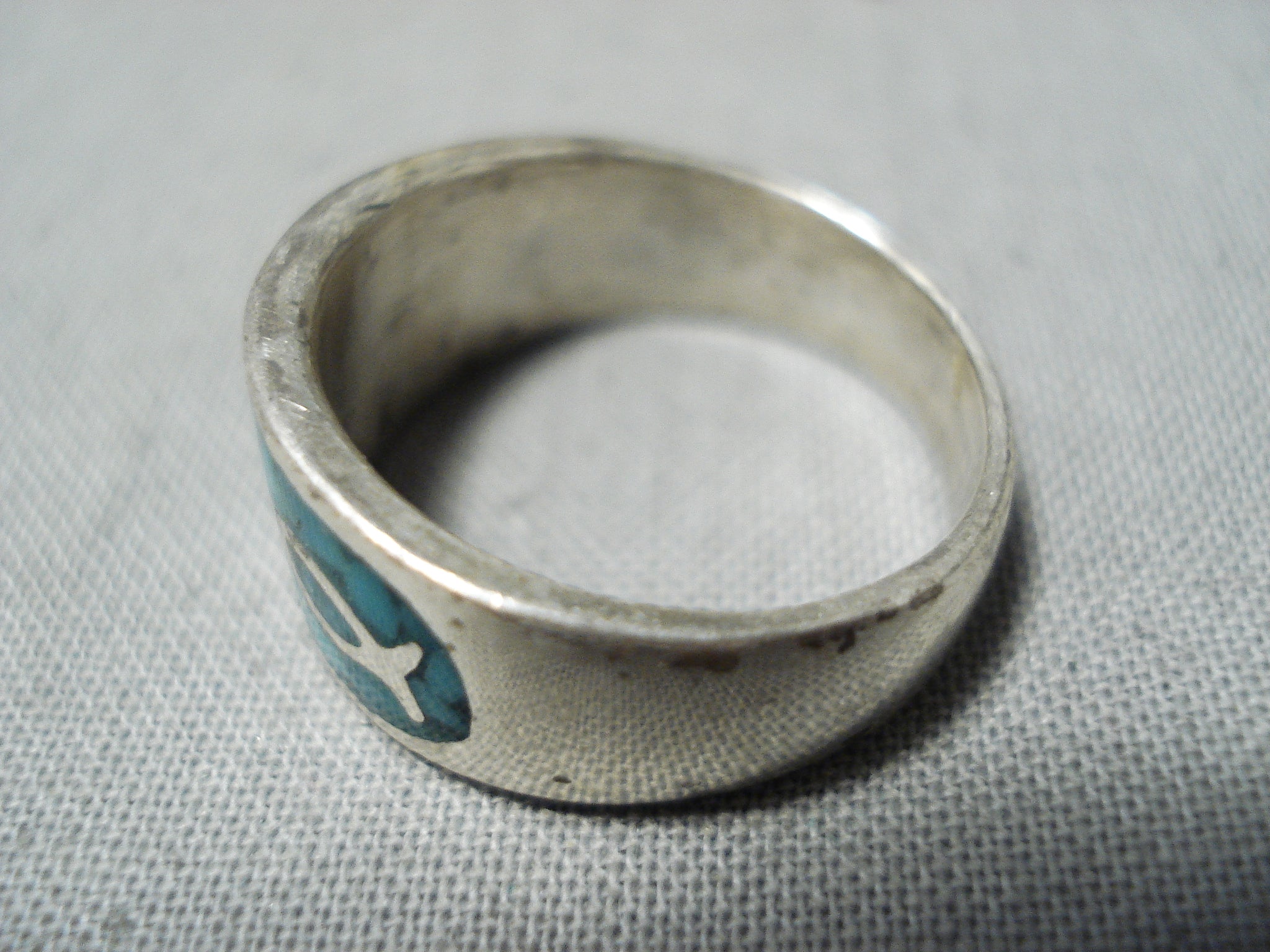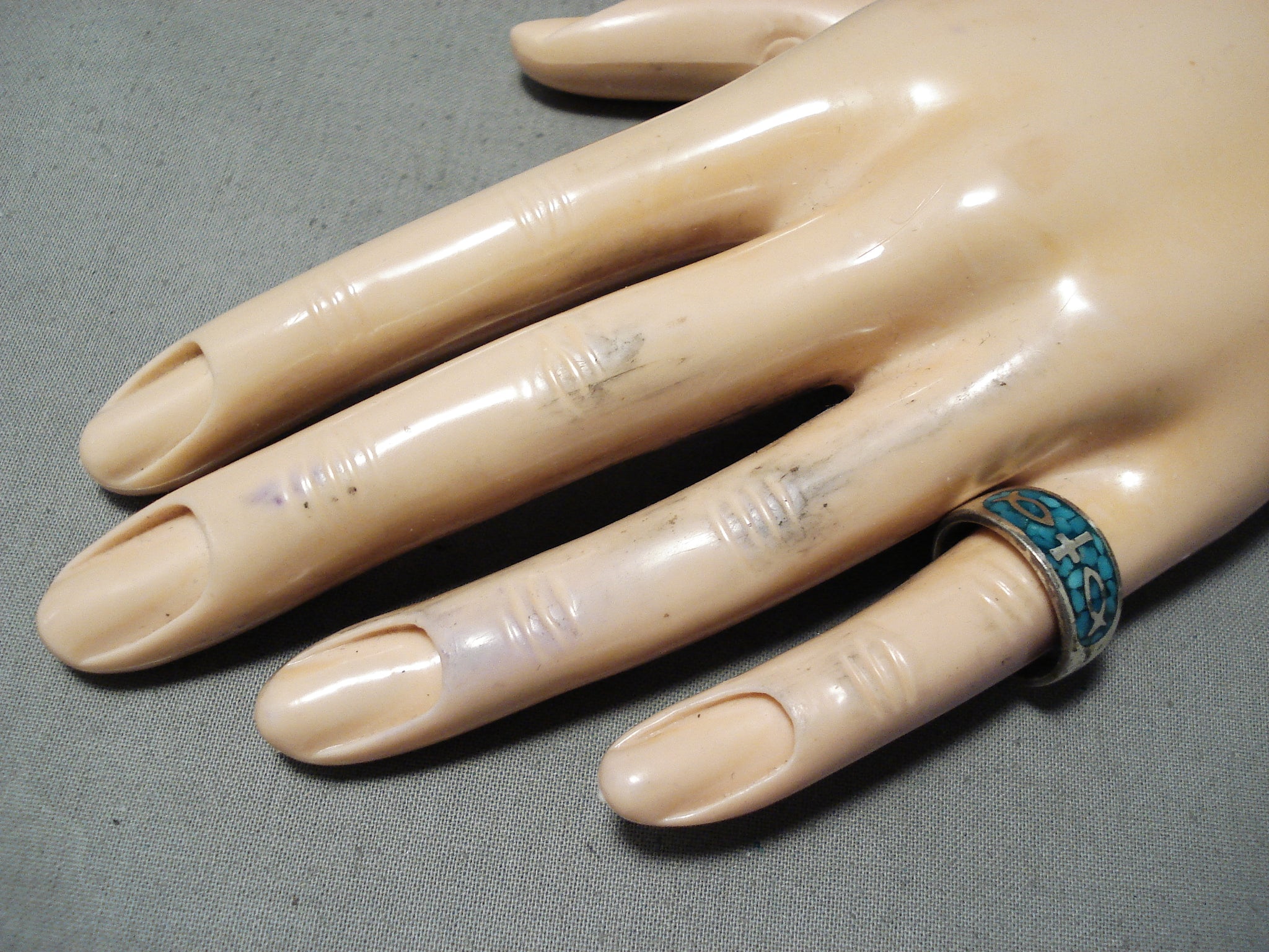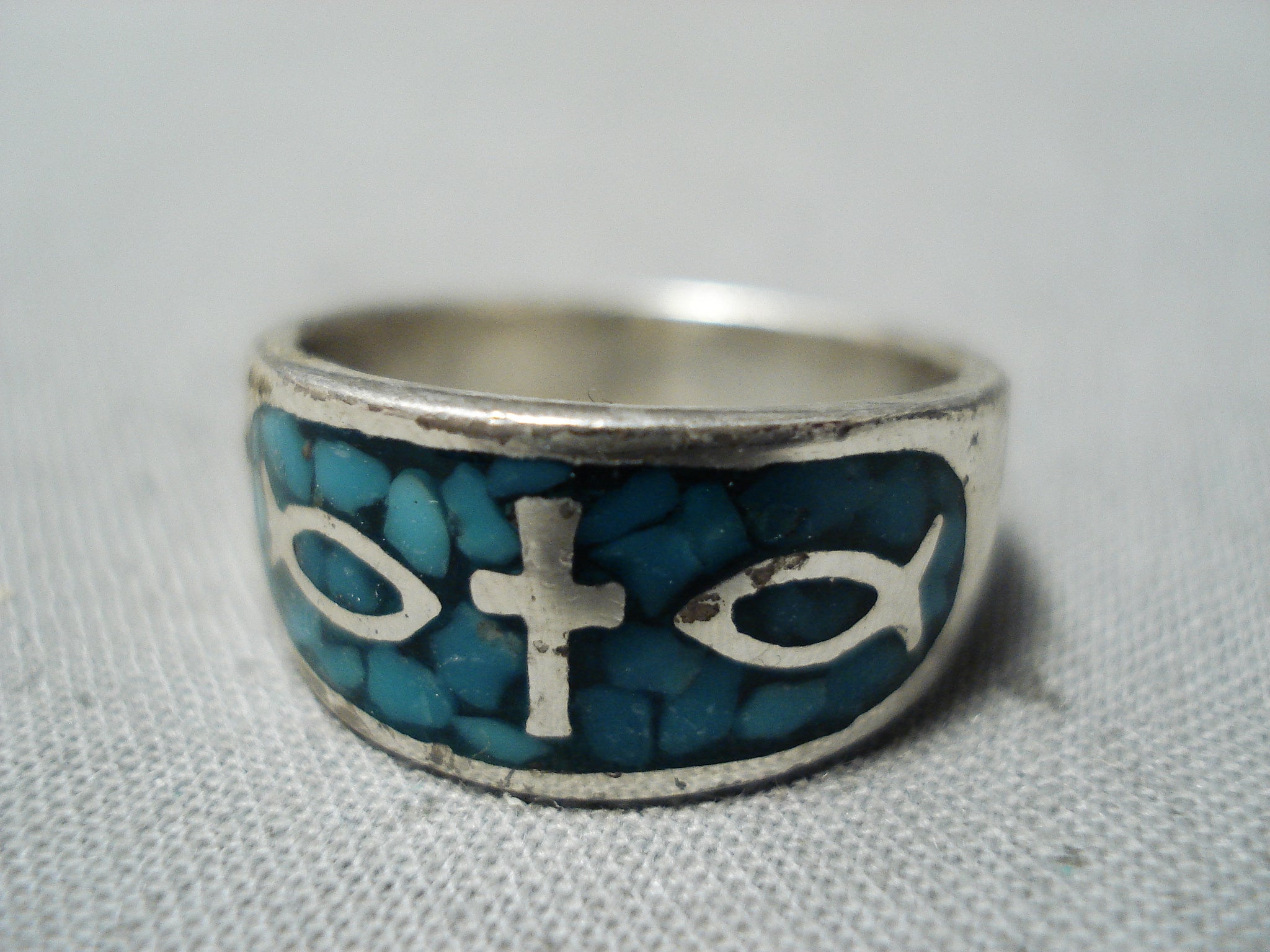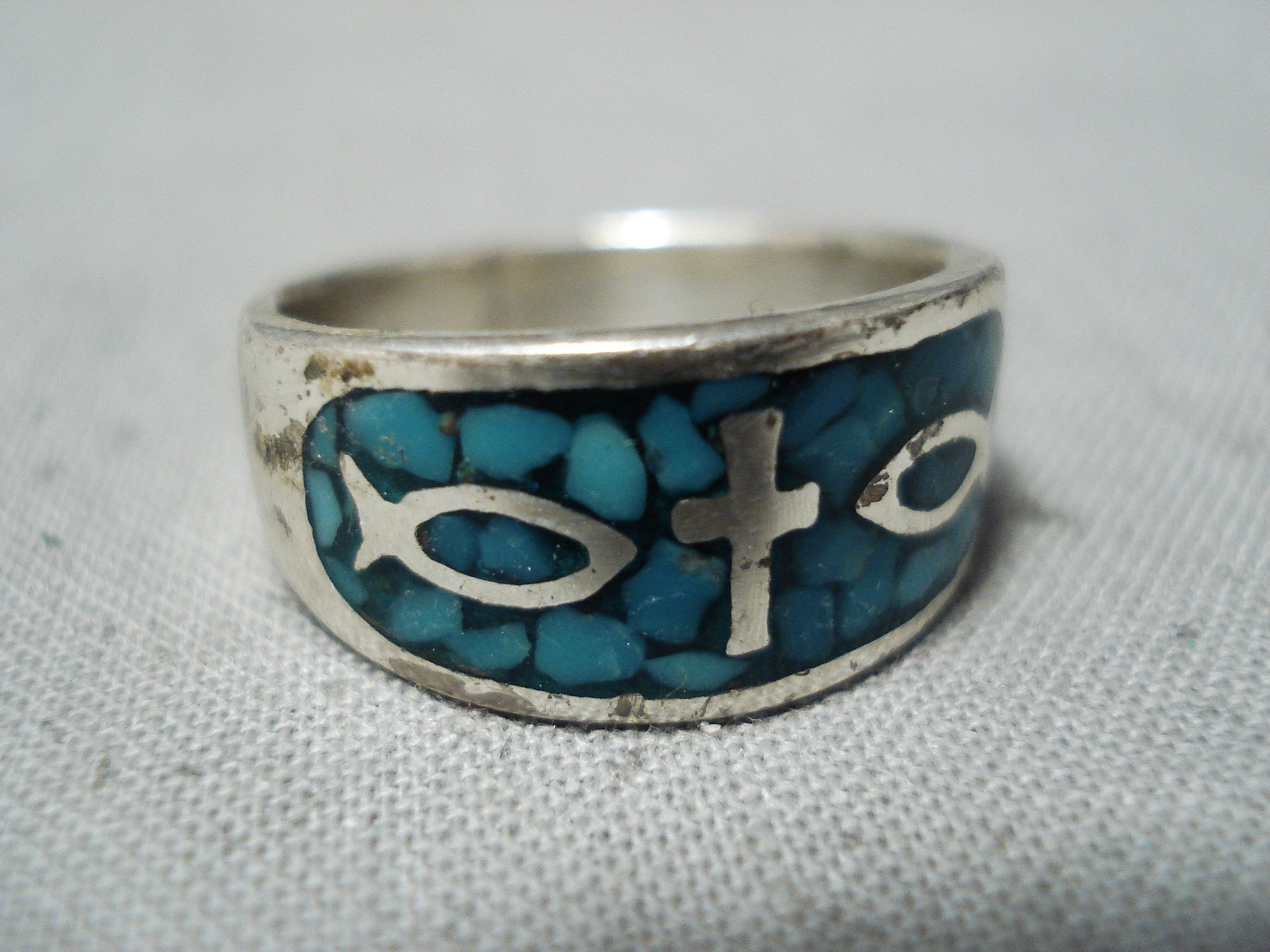 Christian Cross Vintage Native American Navajo Turquoise Sterling Silver Fish Ring Old