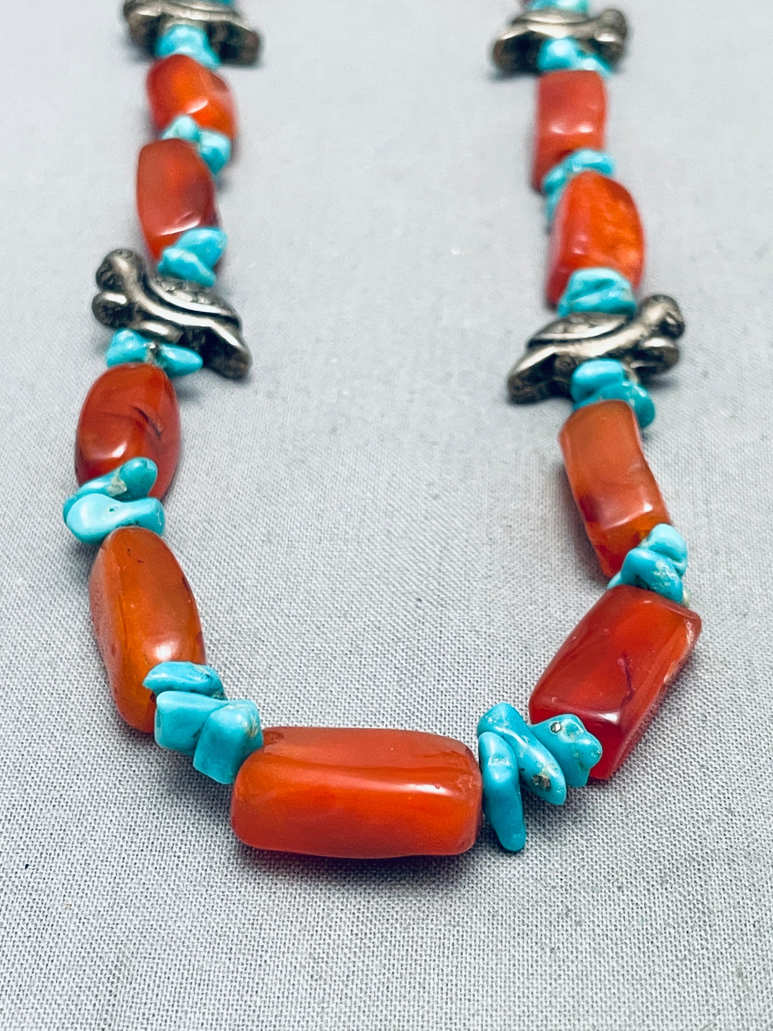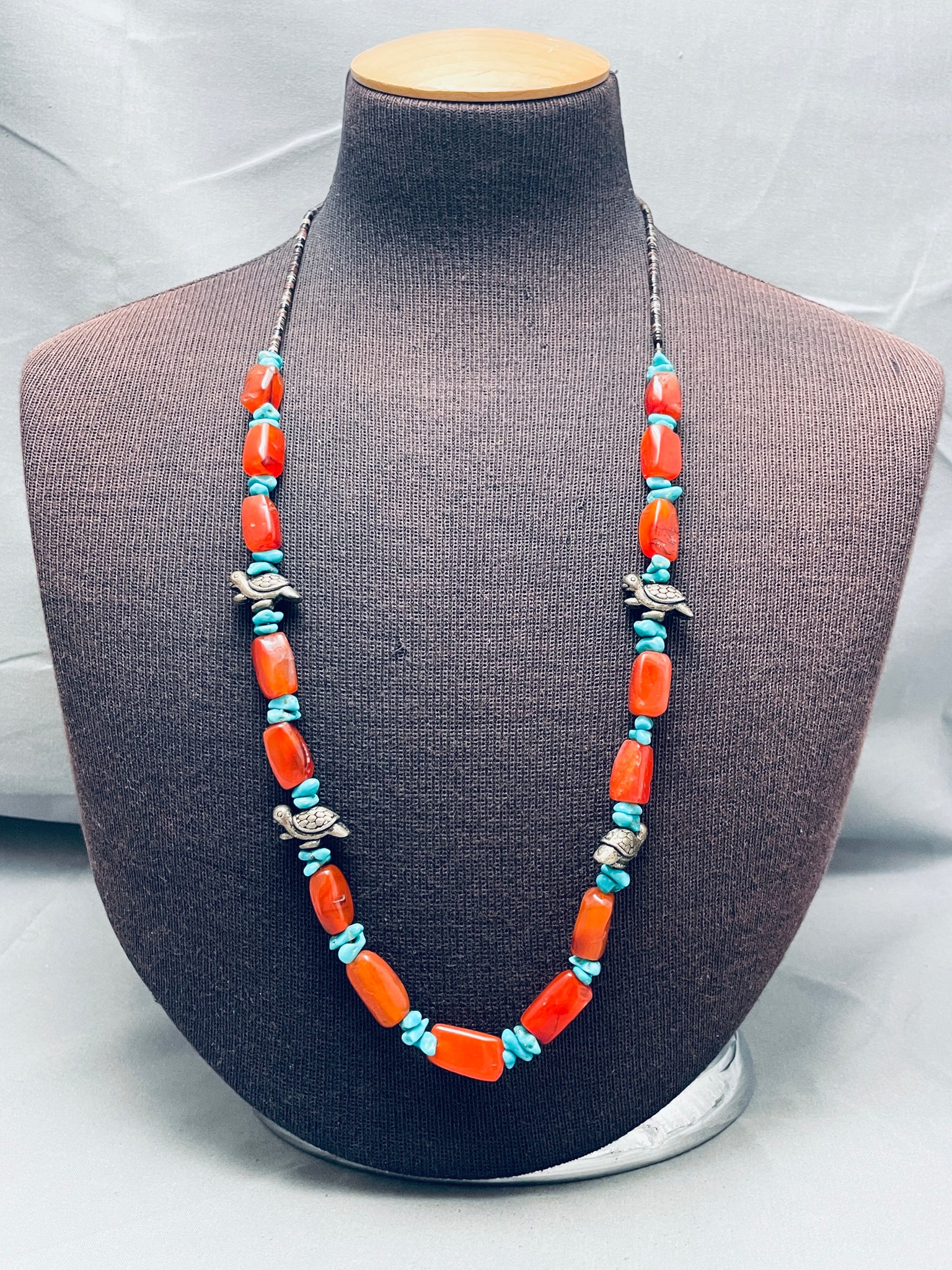 This is a superlative vintage Santo Domingo turquoise and amber silver necklace. This remarkable necklace contains a beautiful plethora of hand cut amber stones that each measure around 5/8" X 1/4". Situated throughiout the amber stones are chunky turquoise stones with accenting hand carved silve turtle pendants. Resting at the ends of the necklace are amazing hand cut brown shell heishi with a traditonal silver clasp. Sterling silver. Cir. 1970's+. The length of the necklace measures around 26". Sturdy 55 grams.