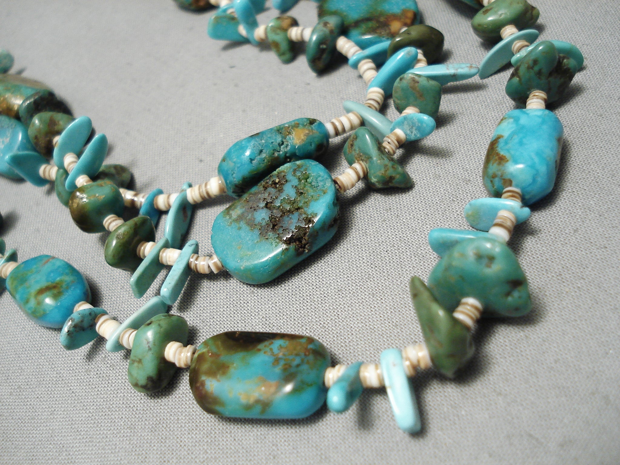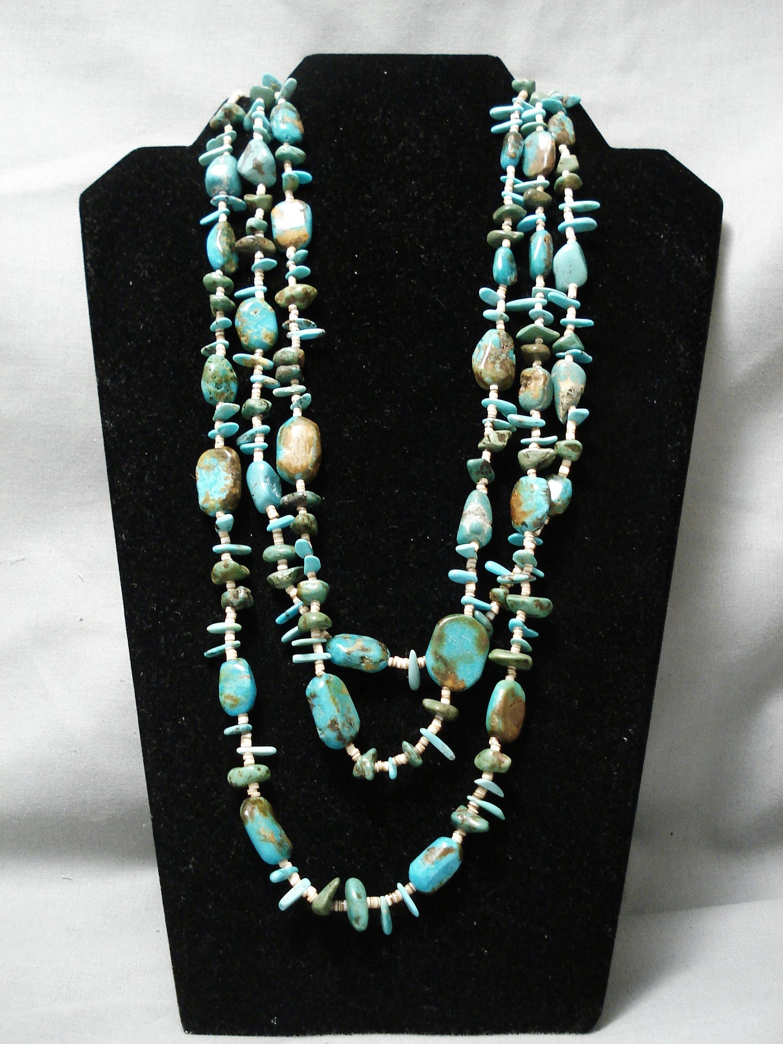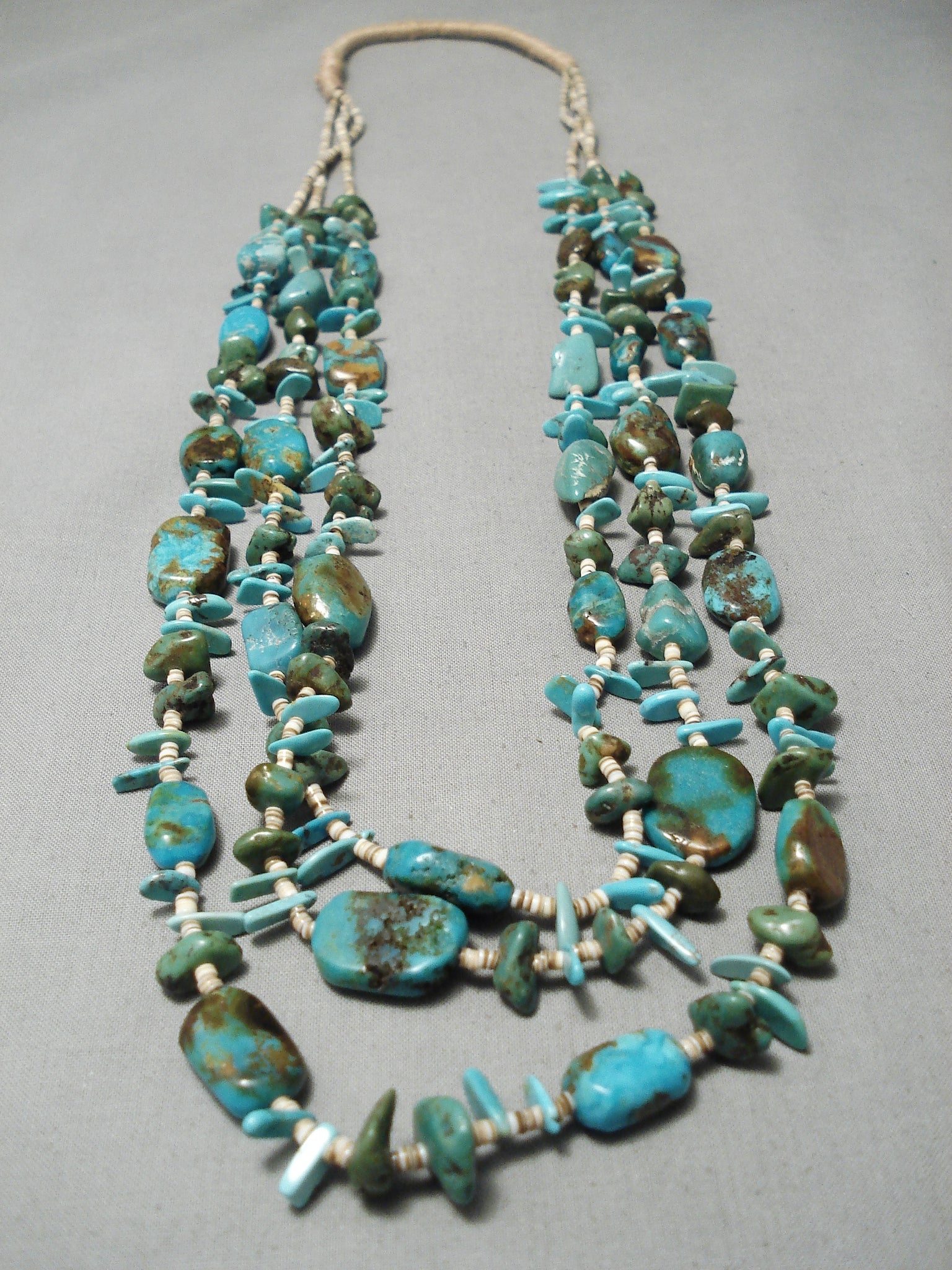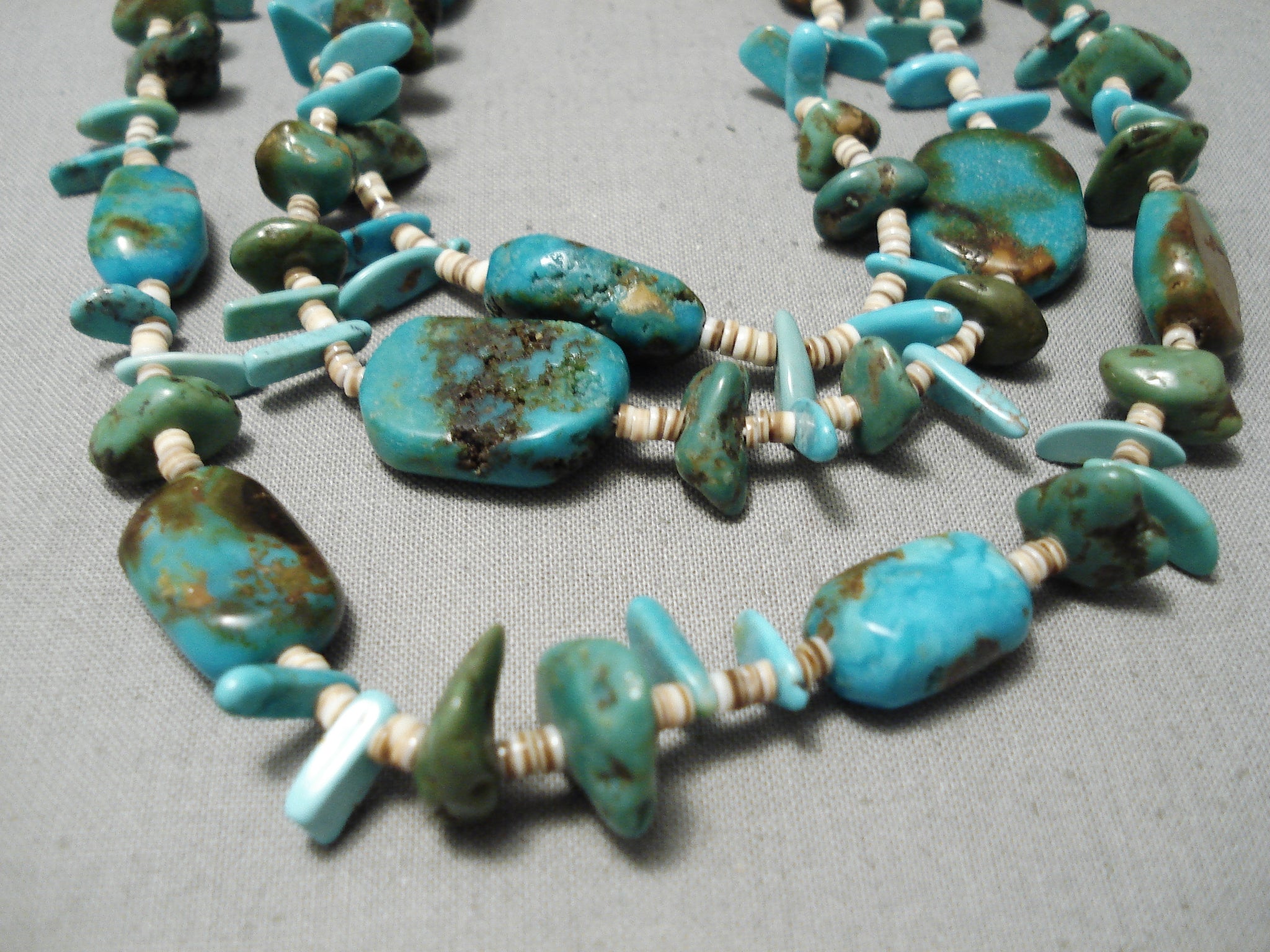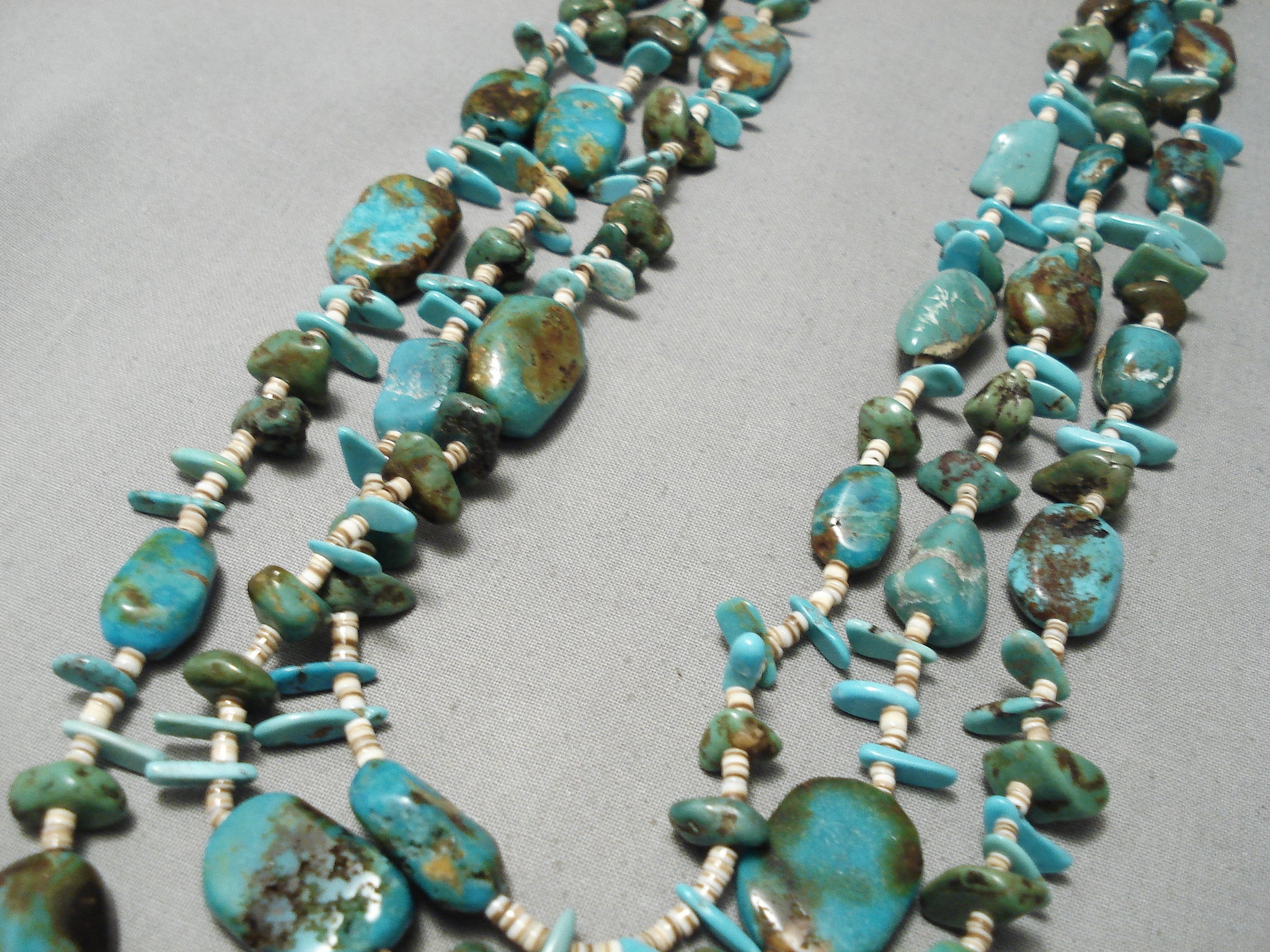 This is a marvelous vintage Navajo necklace. What an astounding necklace we have here! These 3 strands consist of so many Royston turquoise stones of varying sizes and shapes – all separated and accented with light heishi! The strands drape beautifully and are layered – about of lengths 30”, 32” and 34”. The largest of stones is about ¾” x ½”. Sturdy 118 grams.