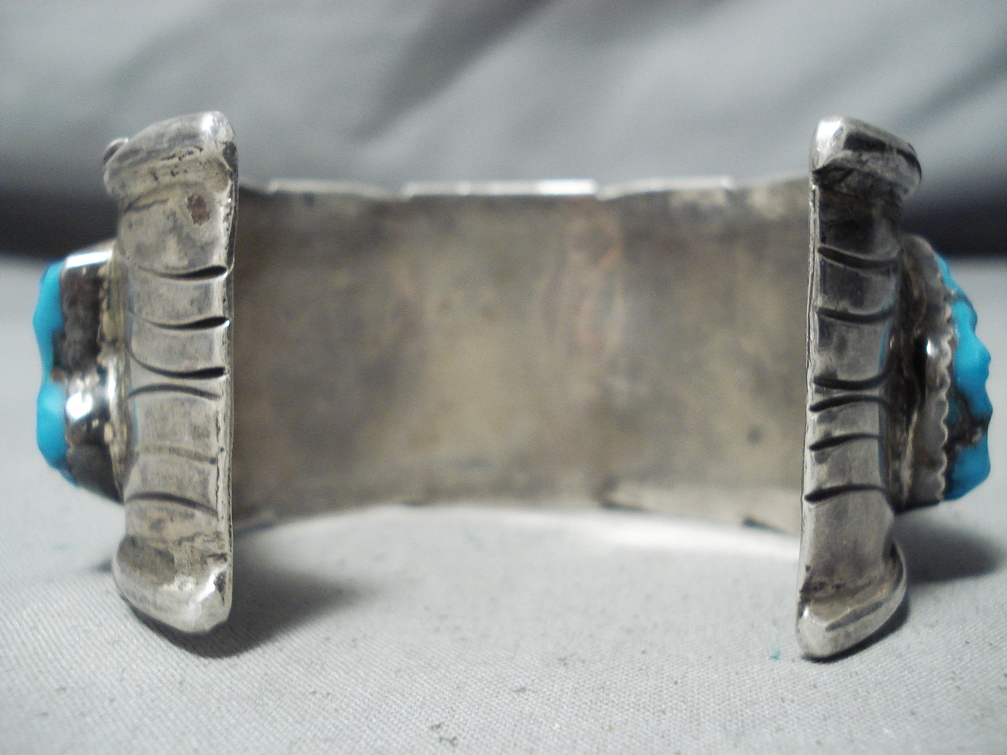 Chunky Hand Carved Vintage Native American Navajo Turquoise Fetish Sterling Silver Bracelet