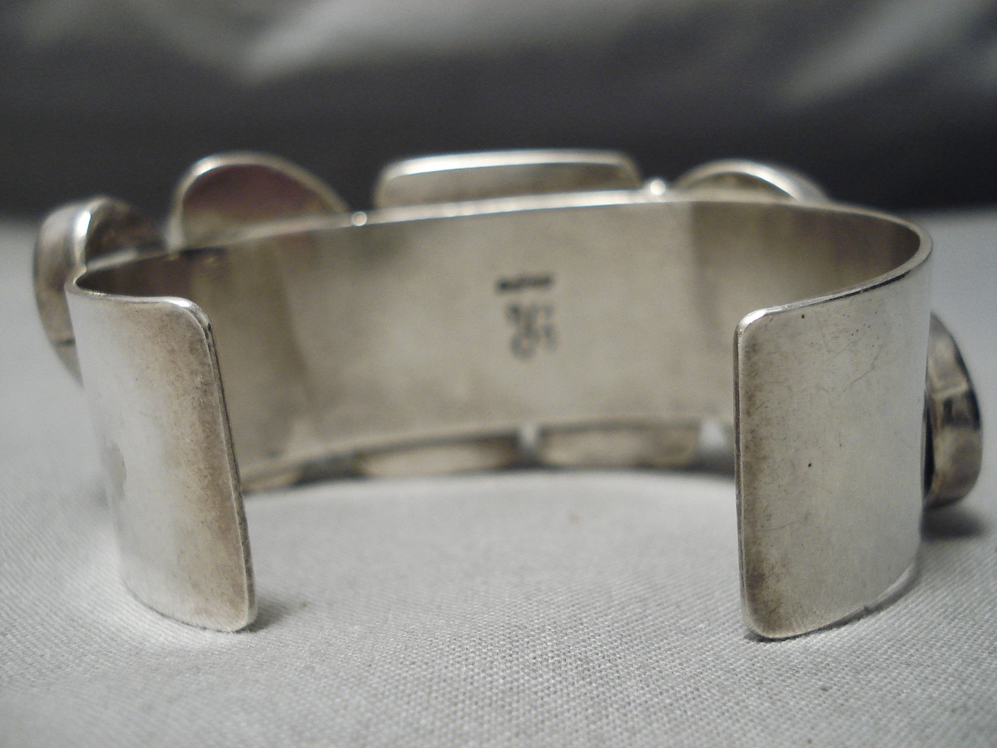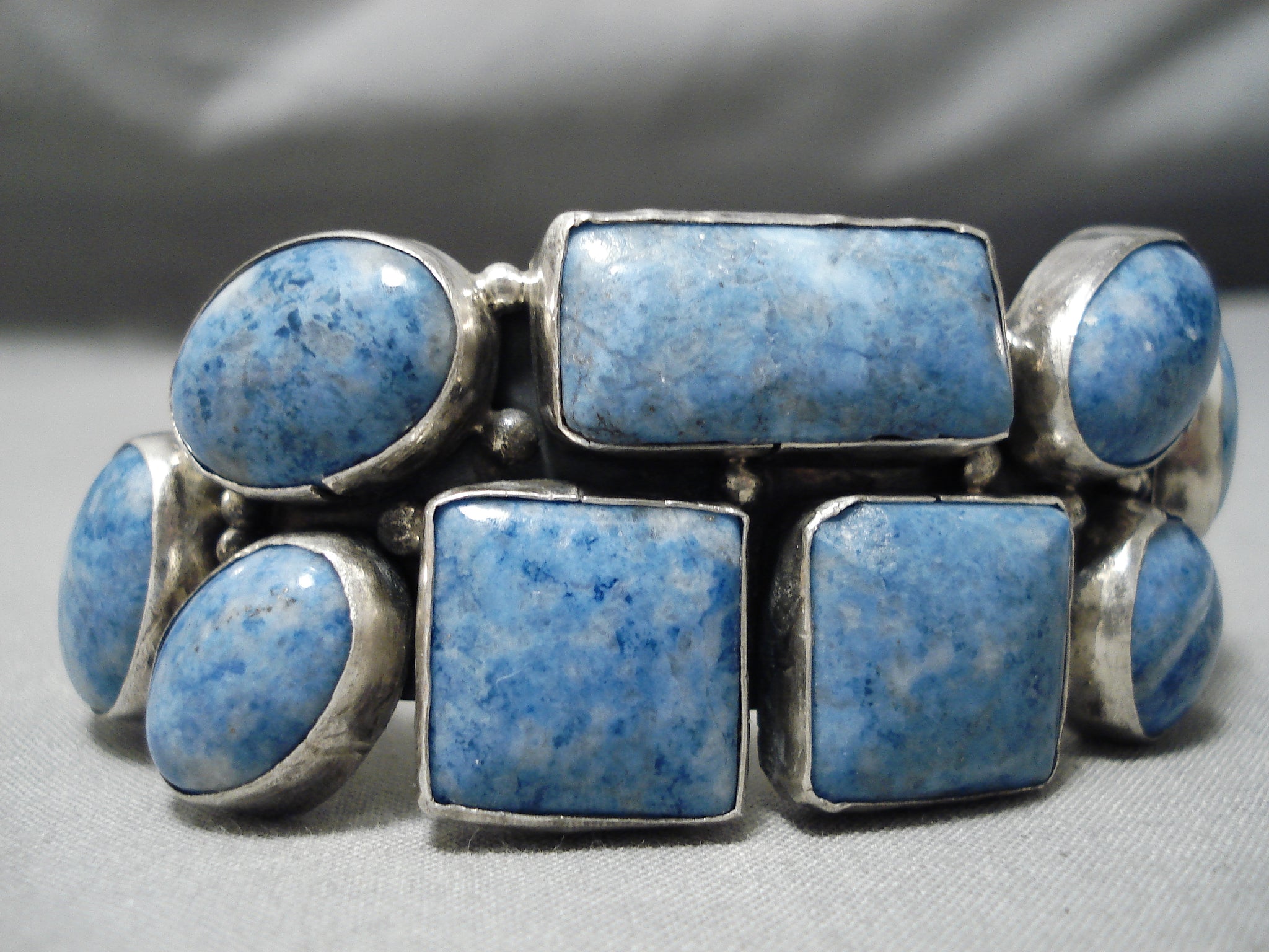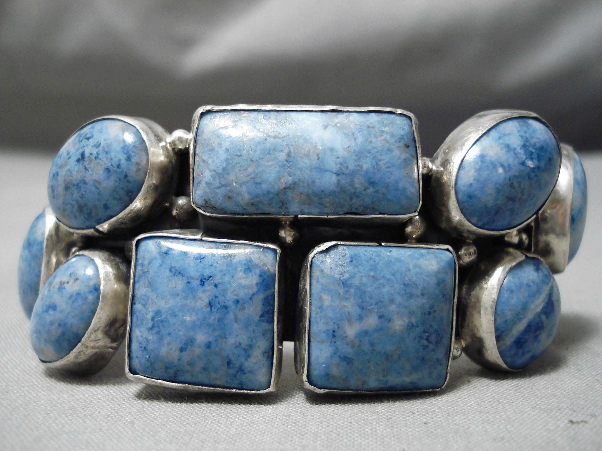 This is an incredible vintage Navajo multiple stone silver bracelet. This outstanding piece contains 9 fabulous lapis stones that are some of the most unique shaped lapis stones we have seen. Look how large each of the stones are. Situated throughout the stones are wonderful silver raindrops. The largest stone measures around 7/8" x 1/2". The width of the bracelet measures around 7/8". Signed by Navajo artist, R. Sterling silver, marked. Cir. 1980's+. The inside end to end measures around 5-1/4" with an additional 1-1/4" gap. Sturdy 68 grams.