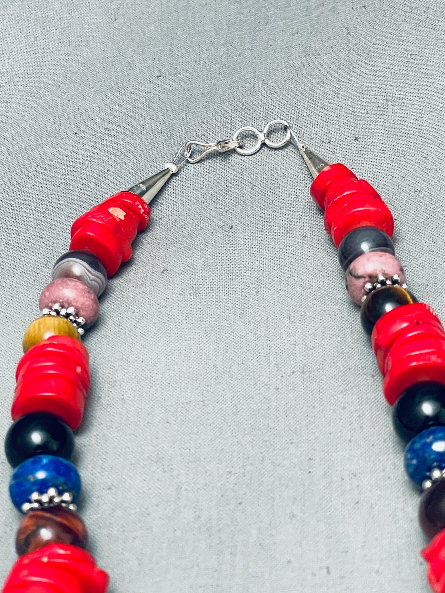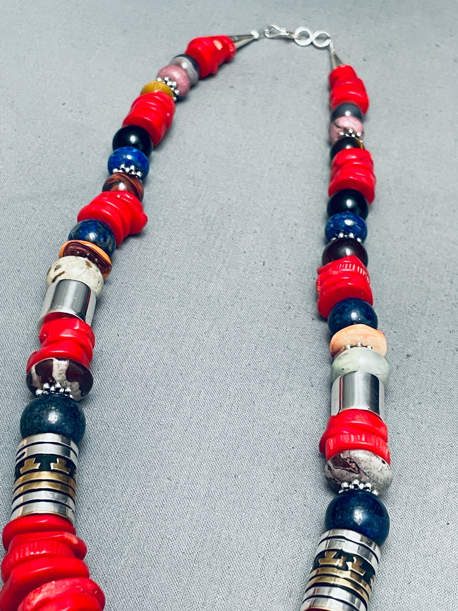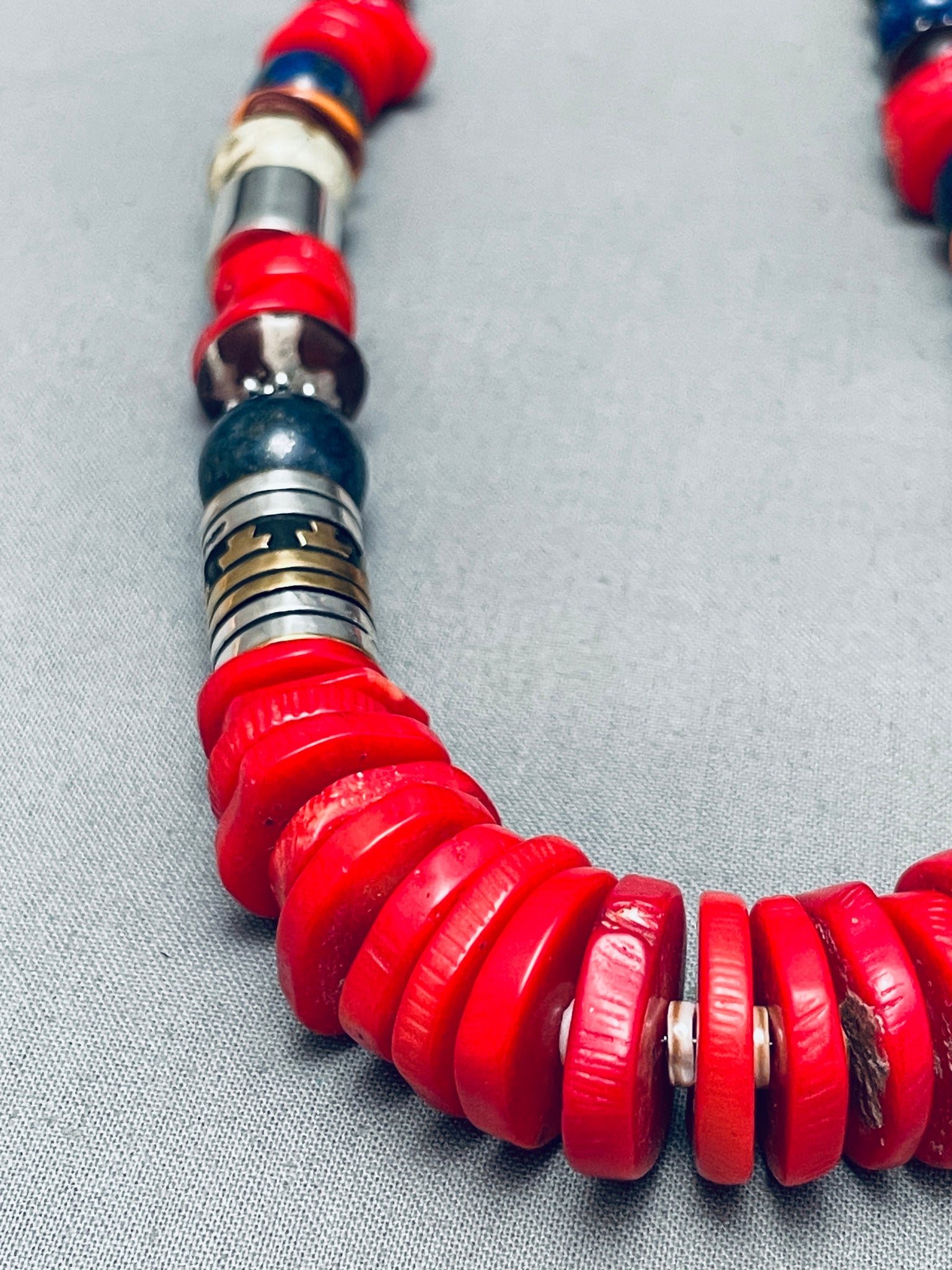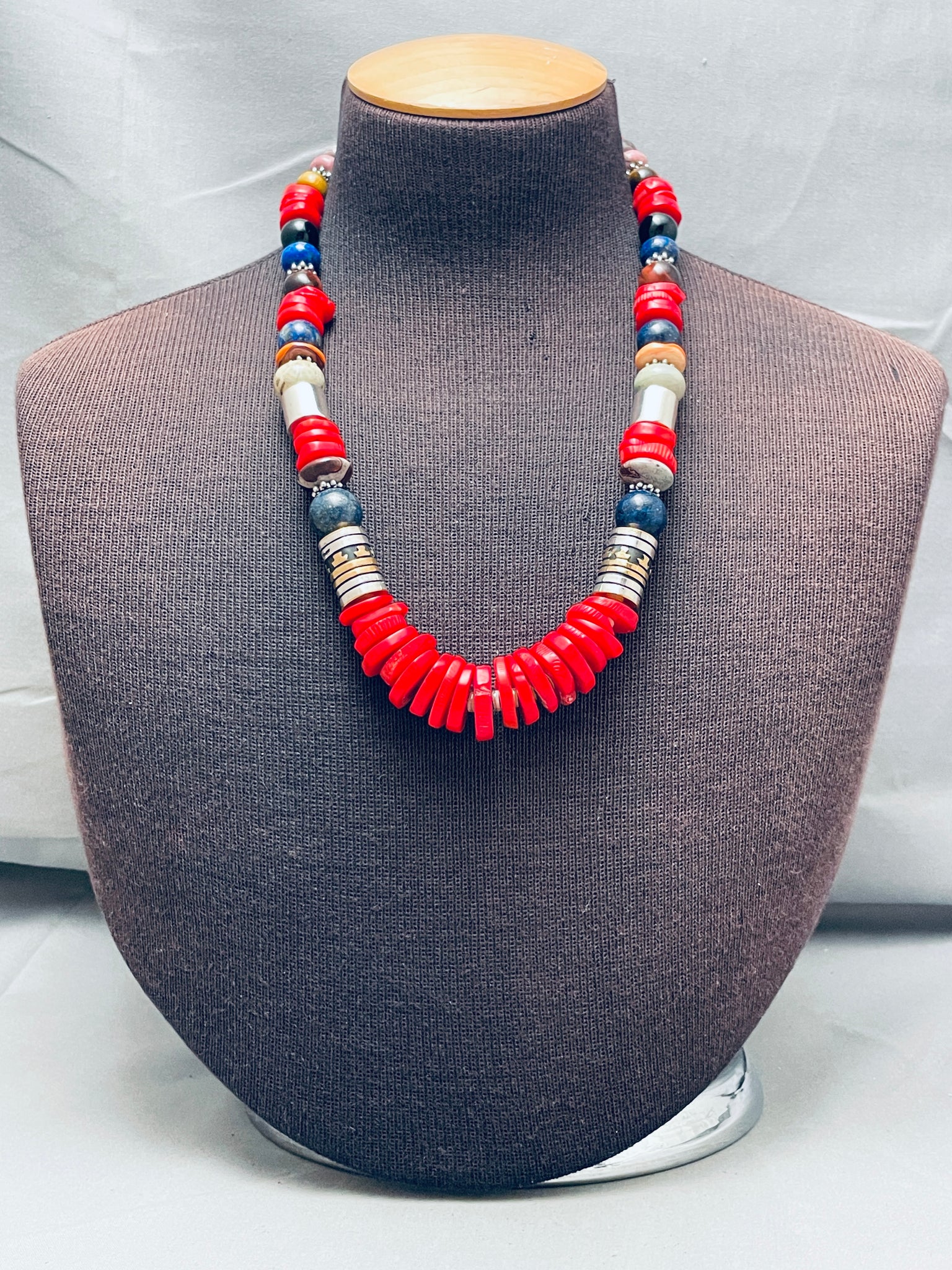 Chunky Native American Navajo Coral Disc Sterling Silver Beaded Necklace