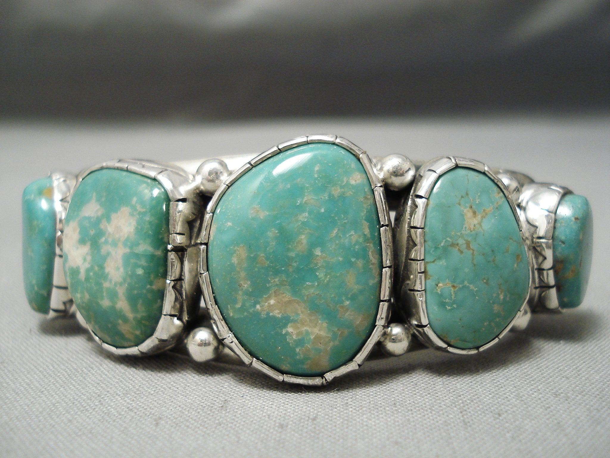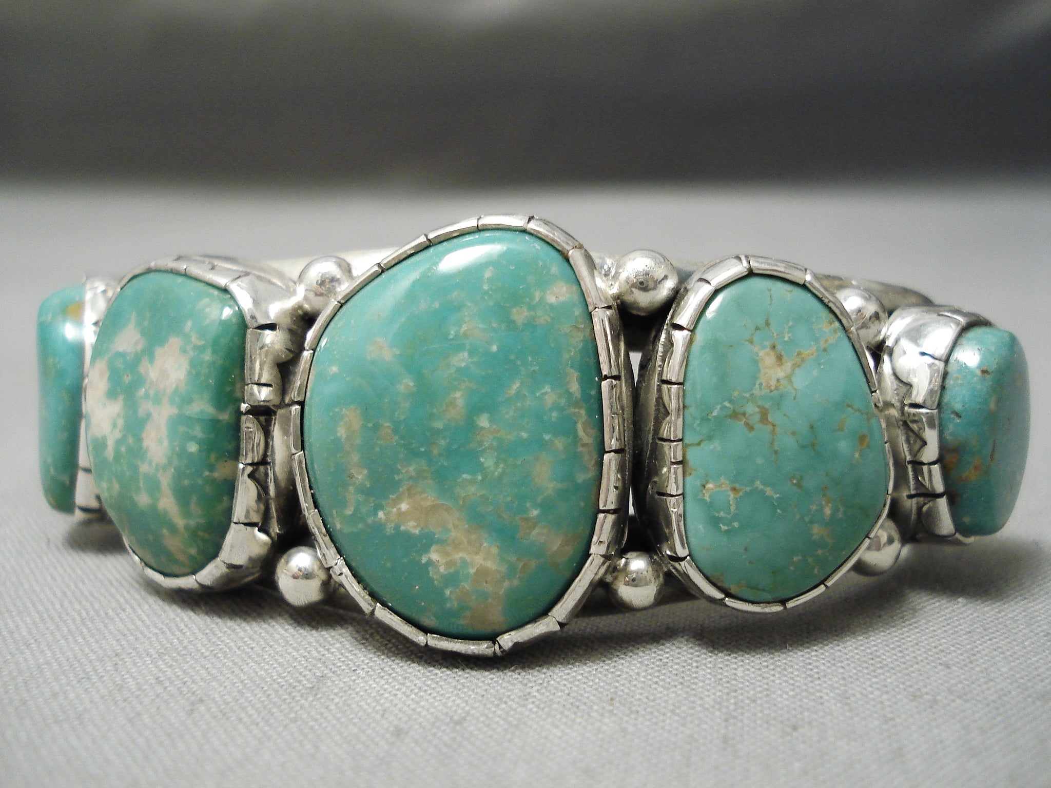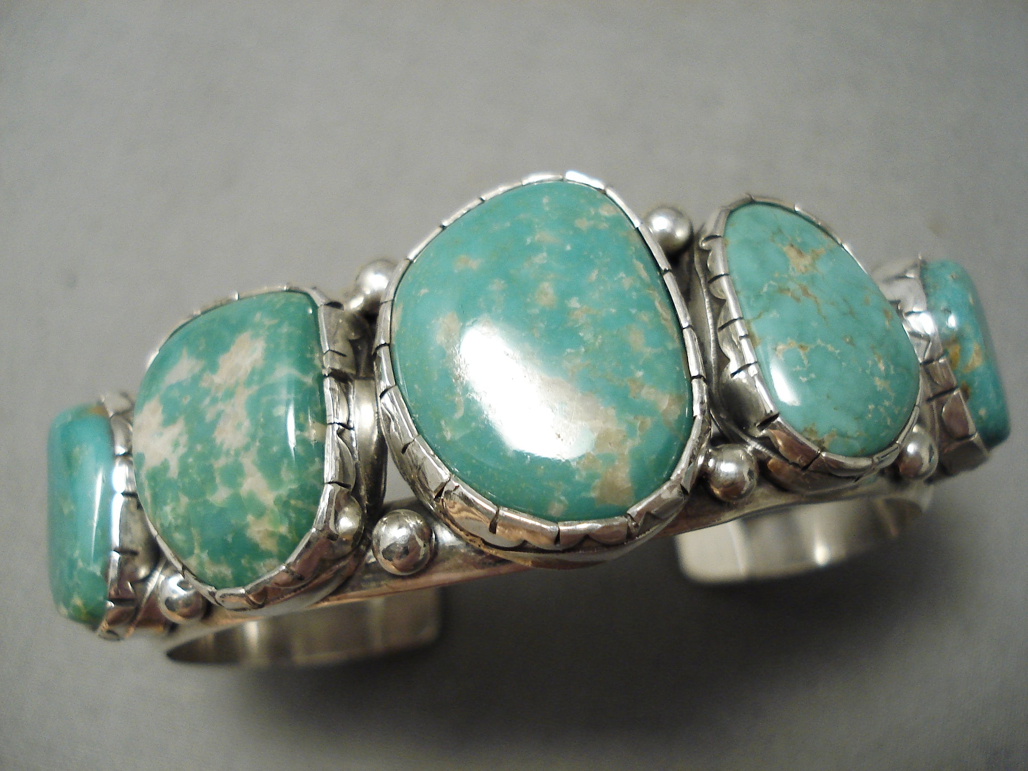 This is an impressive vintage Navajo five stone silver bracelet. This piece contains five graudating turquoise stones that appear to be from the Royston turquoise mine. Check out the intricacy of those beautiful hand carved silver bezels, just amazing. Situated throughout the stones are wonderful silver raindrops. The bracelet contains a superior double silver shank cuff. The center stone measures around 7/8" x 5/8". The width of the bracelet measures around 7/8". Signed by Navajo artist, Biaso . Sterling silver, marked. Cir. M1970's+. The inside end to end measures around 5-3/4" with an additional 1" gap. Sturdy 50 grams.