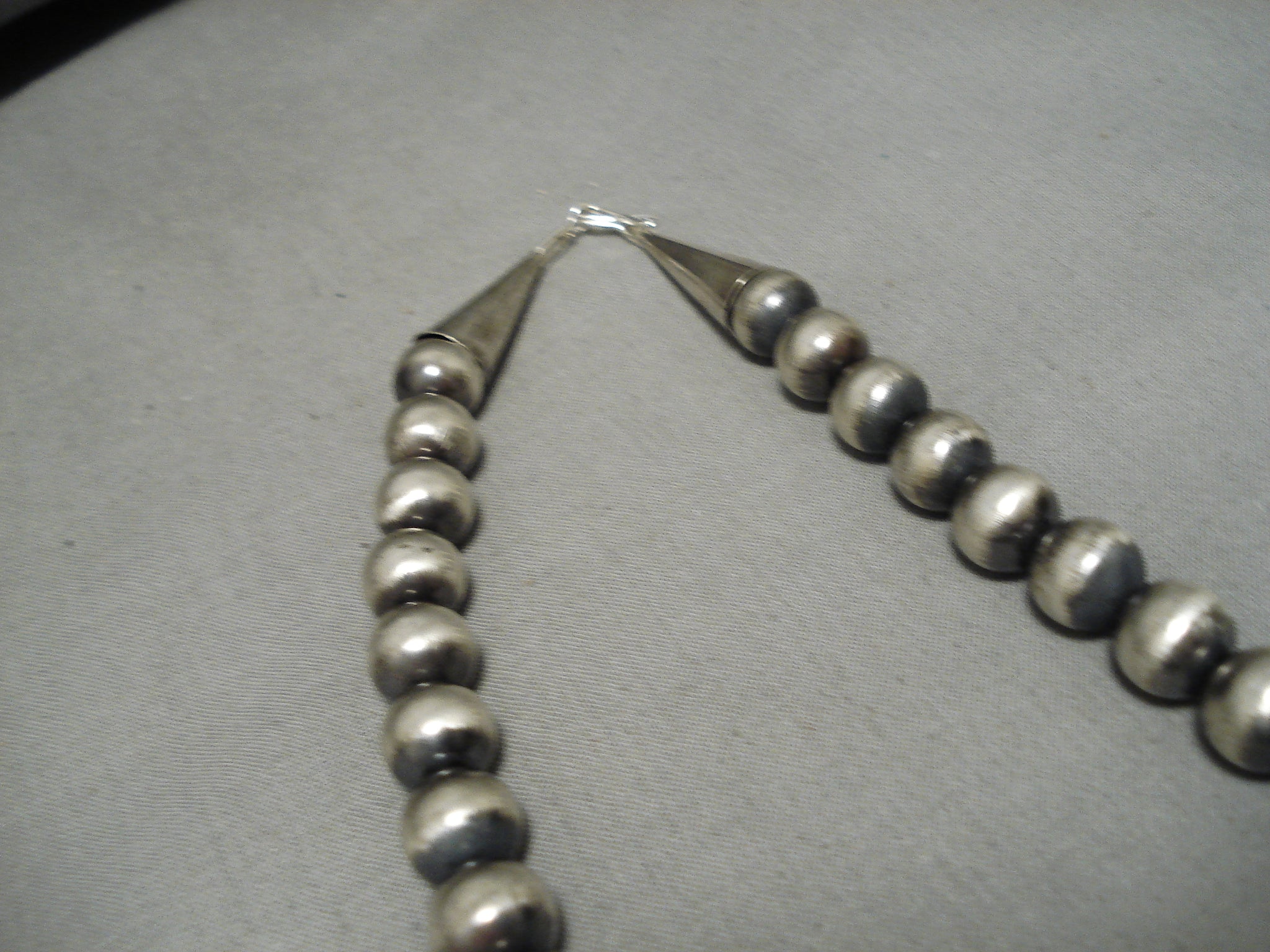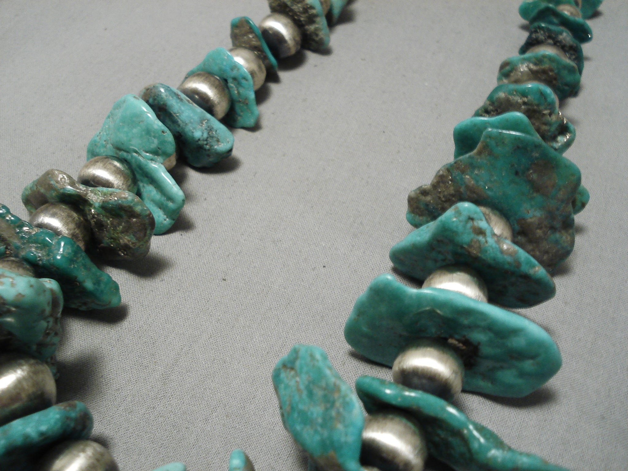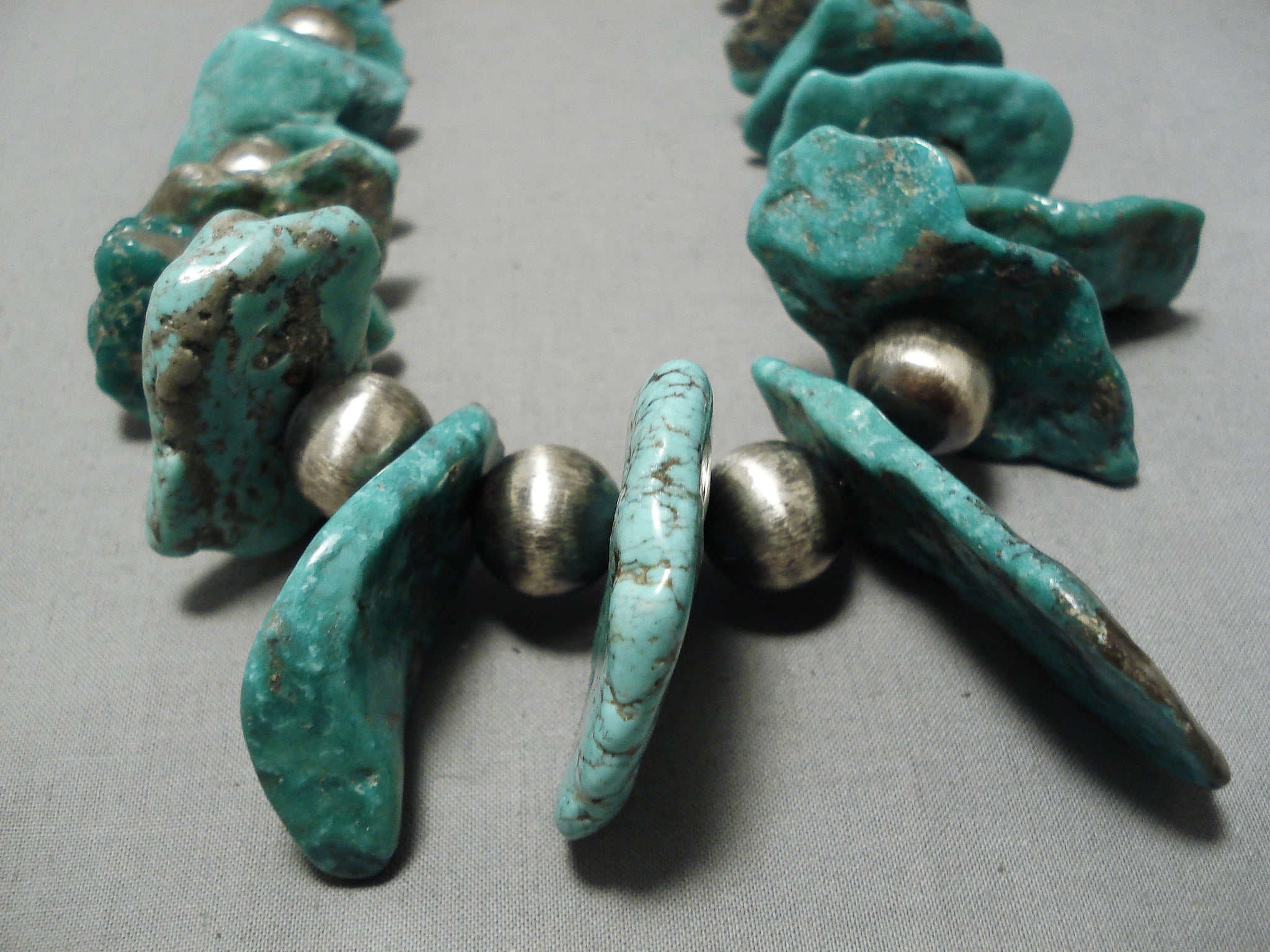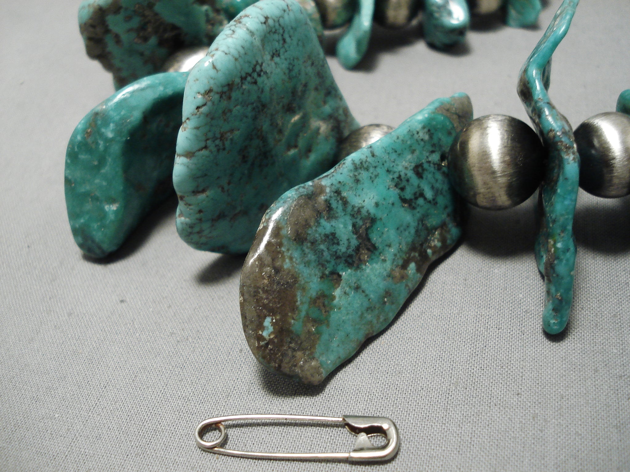 This is a tremendous vintage Navajo turquoise slab necklace. This is one of the biggest turquoise slab necklaces we have collected this year. These stones are absolutely remarkable as they graduate in size towards the bottom. The largest turquoise stone measures a mind blowing 2-5/8" X 1". Resting throughout the stones are phenomenal graduating round silver beads with the largest measuring around 5/8" in diameter. Located at the ends are sterling silver marked cones with a traditional silver clasp. This necklace is just larger than life. Sterling silver, marked. Cir. Mid century . The length of the necklace measures around 30-1/2". Sturdy 289 grams.