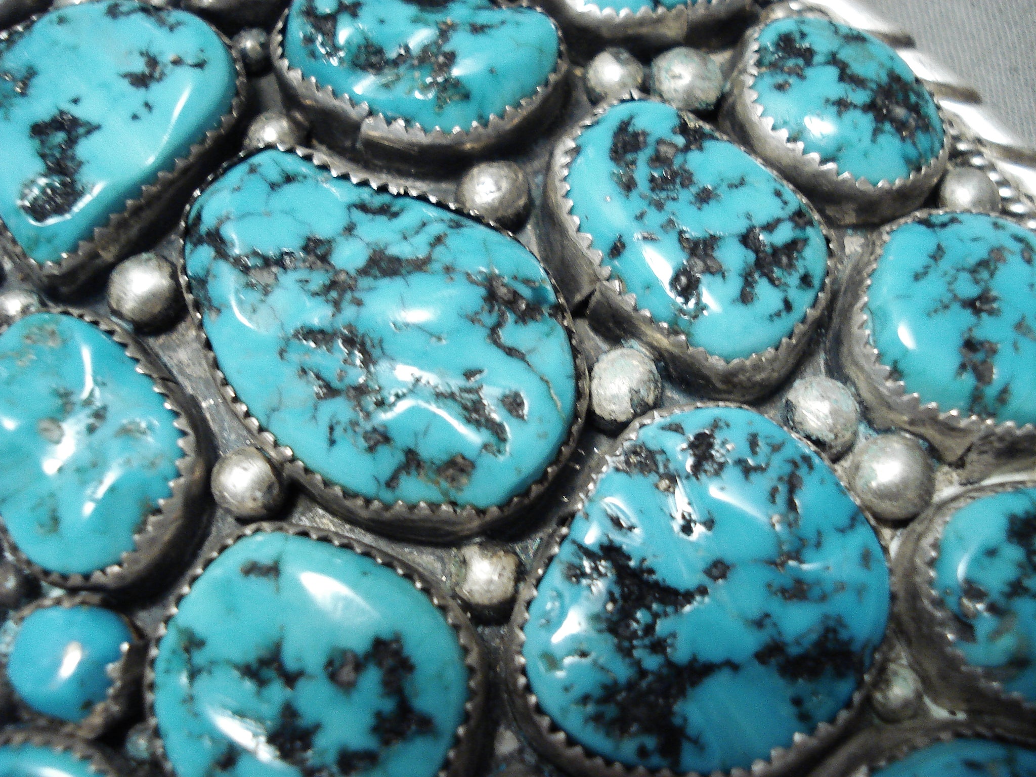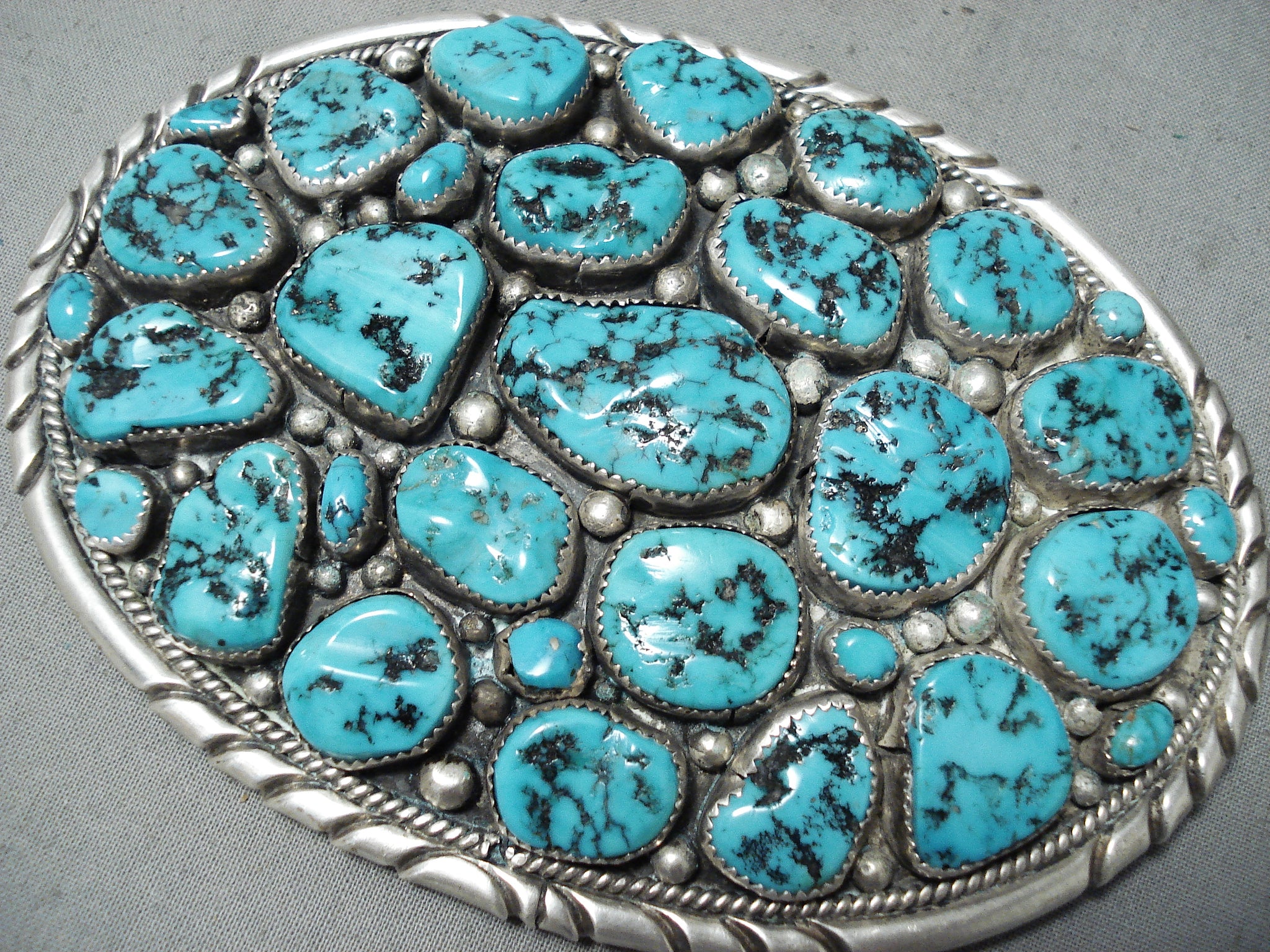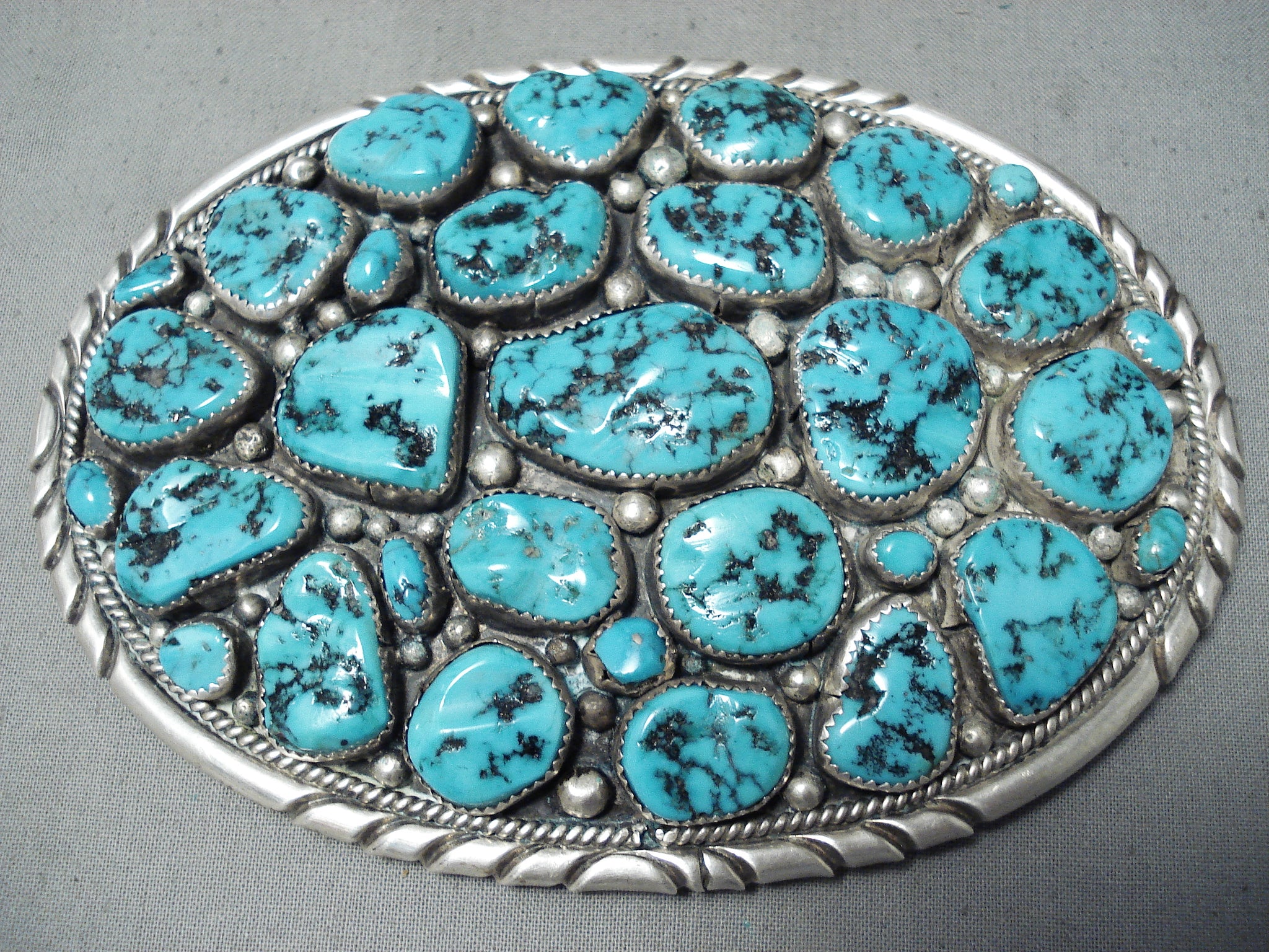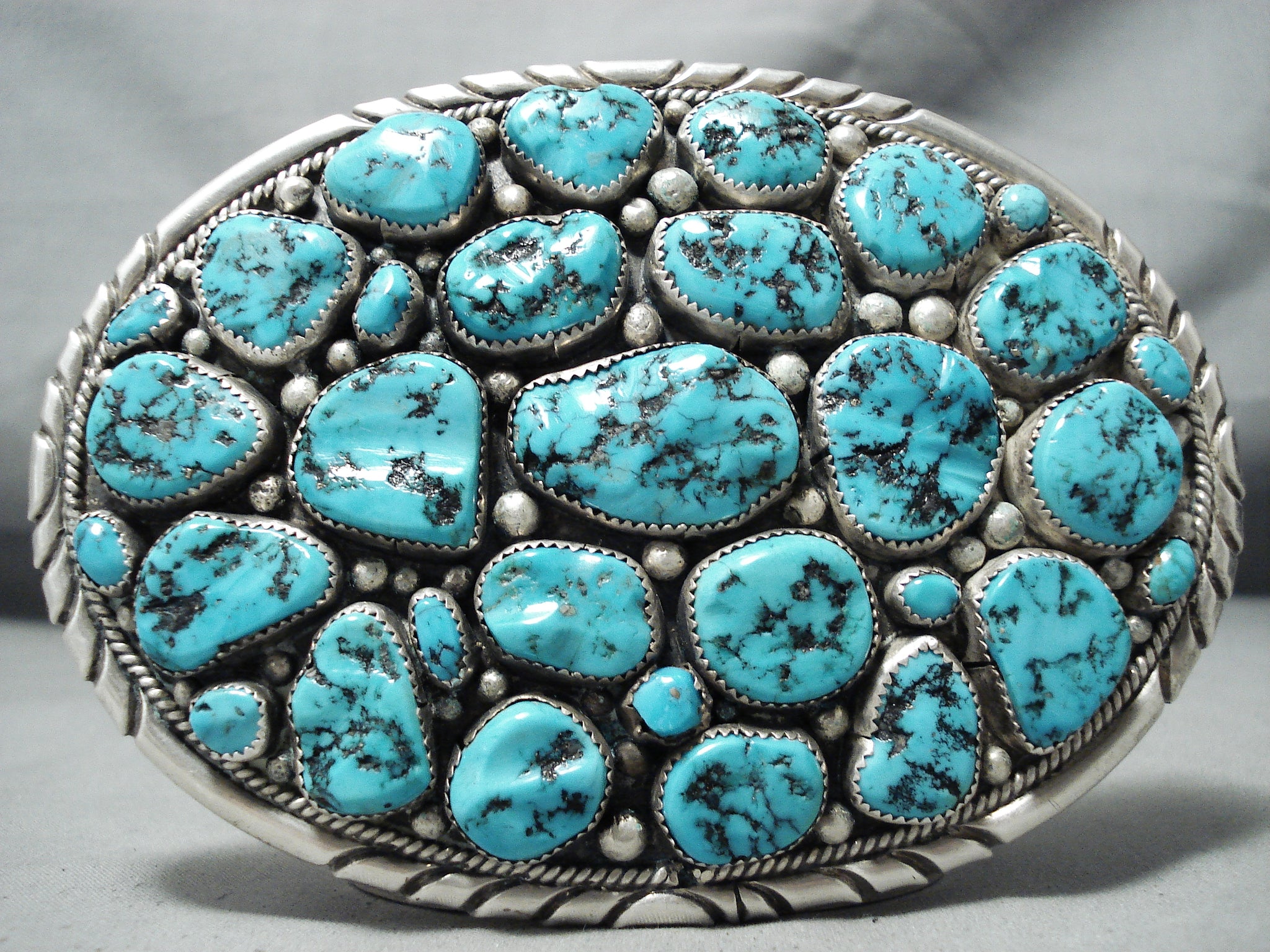 Chunky Vintage Native American Navajo Sleeping Beauty Turquoise Cluster Sterling Silver Buckle