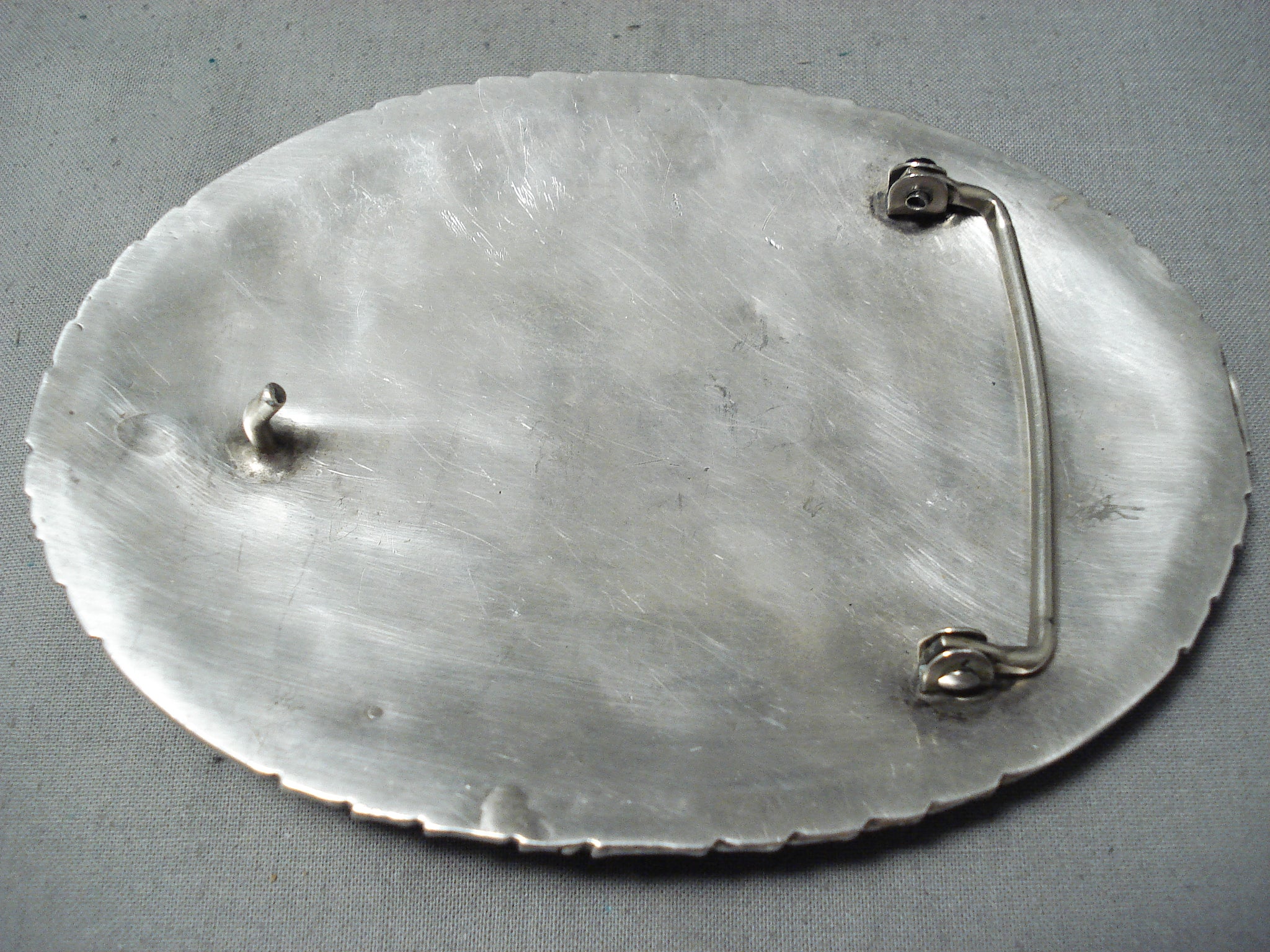 We are proud to offer this magnificent vintage Navajo silver buckle having a cluster of Sleeping Beauty turquoise stones, silver beads, silver rope and handcarved silver borders! Truly Incredible! The belt width is about 2". The largest stone measures around 1" x 3/4". Sterling silver. Cir Mid Century. The buckle measures around 4-7/8" x 3-1/2". Sturdy 160 grams.