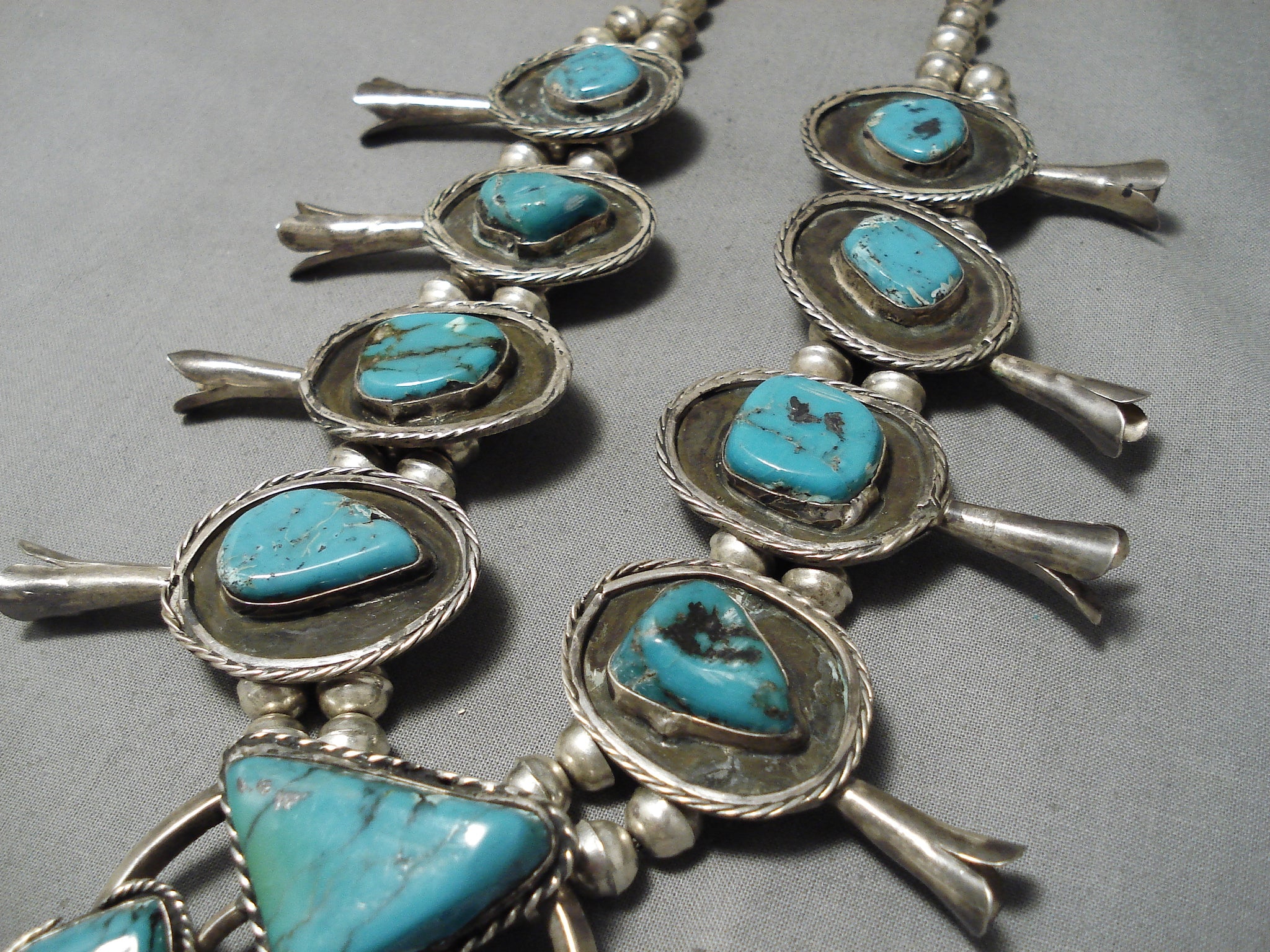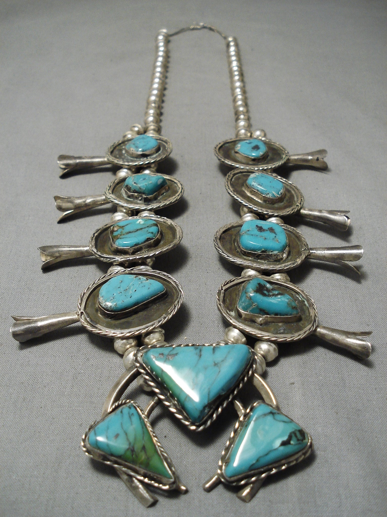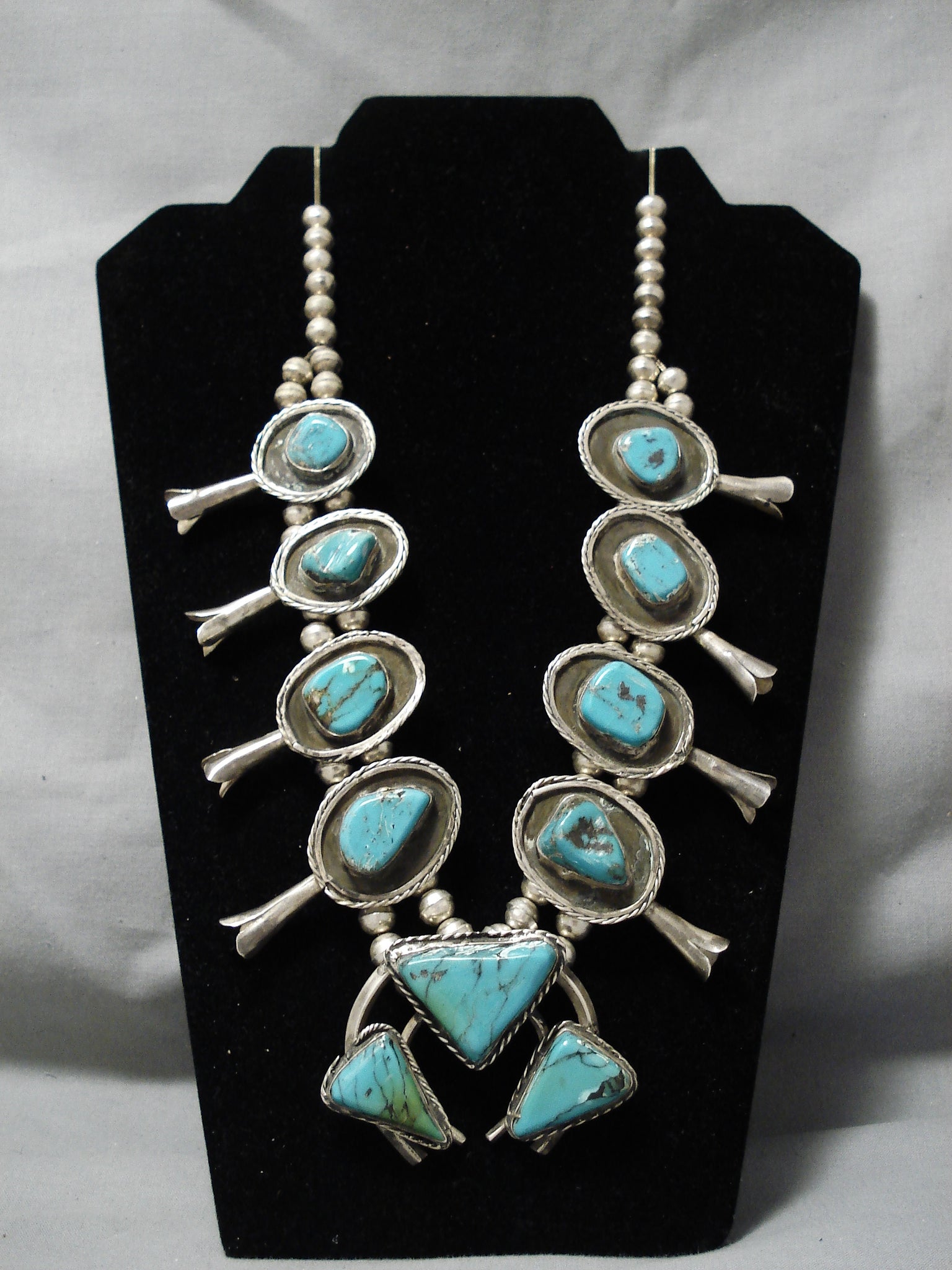 Chunky Vintage Native American Navajo Turquoise Sterling Silver Squash Blossom Necklace