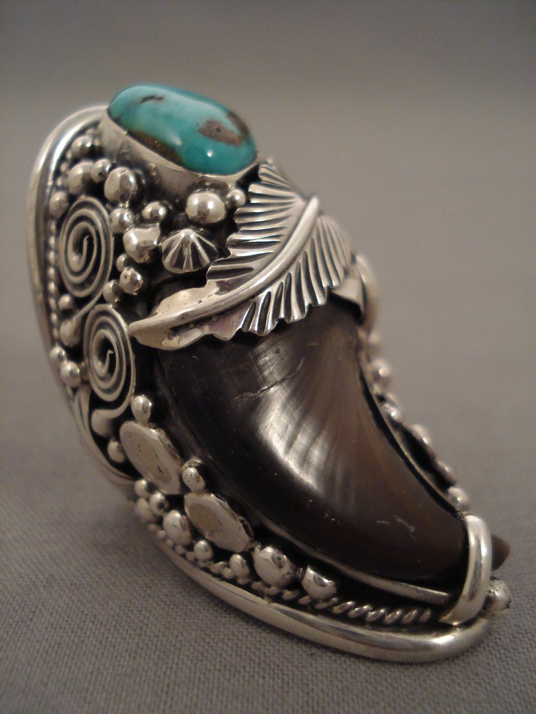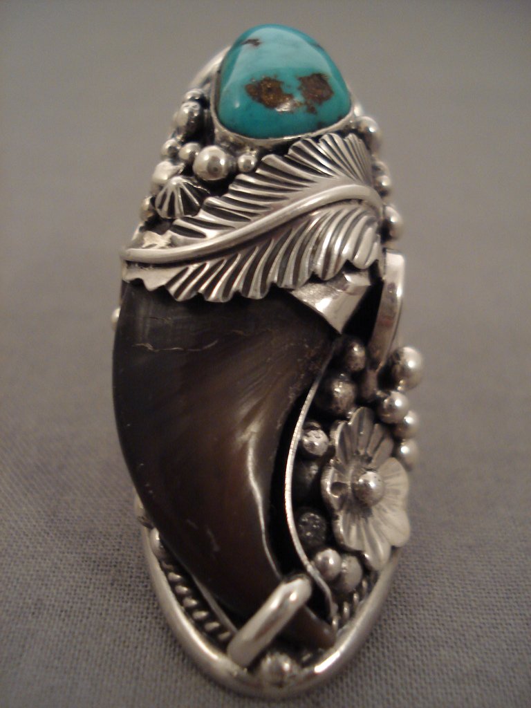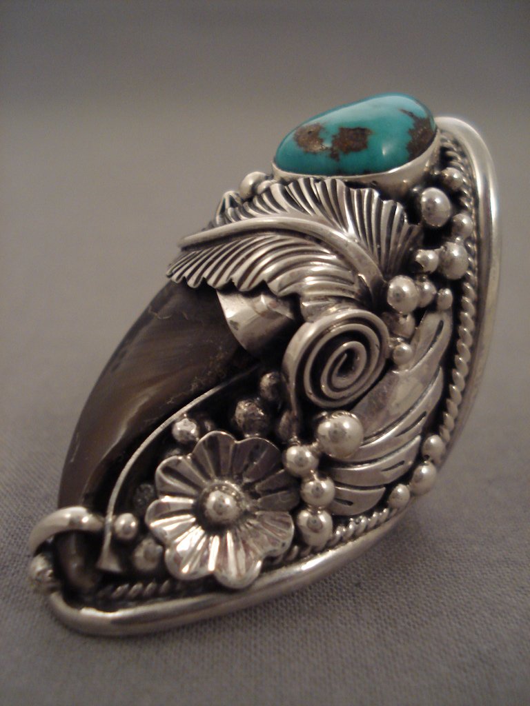 Here we have an amazing Navajo Native American jewelry Native American jewelry silver ring with a large turquoise stone surrounded with a handcarved silver leaf, silver rope, beads, florals and swirling stems on a heavy, solid silver band that reduces at the back! Stunning! Silver leaf measures about 1" x 1/2". Silver floral measures about 1/2" x 1/2". The ring face measures around 2" x 7/8". Signed by Navajo Native American jewelry Native American jewelry artist, H. Smith. The ring size is around 8. Sterling silver, marked. Sturdy 32 grams.