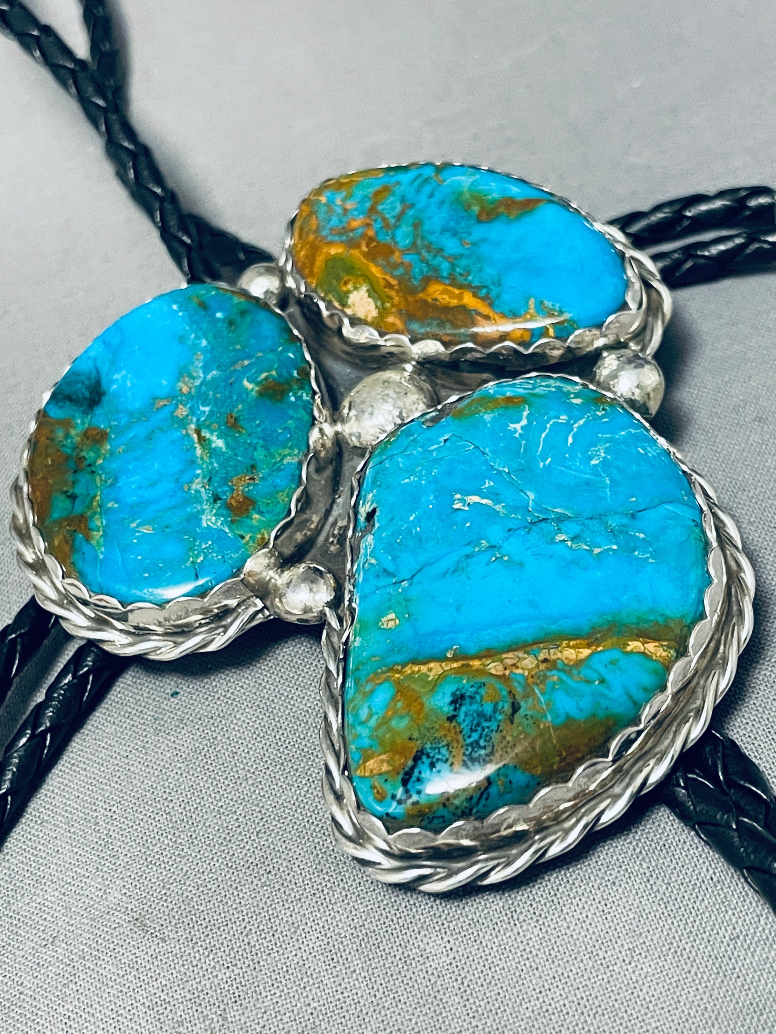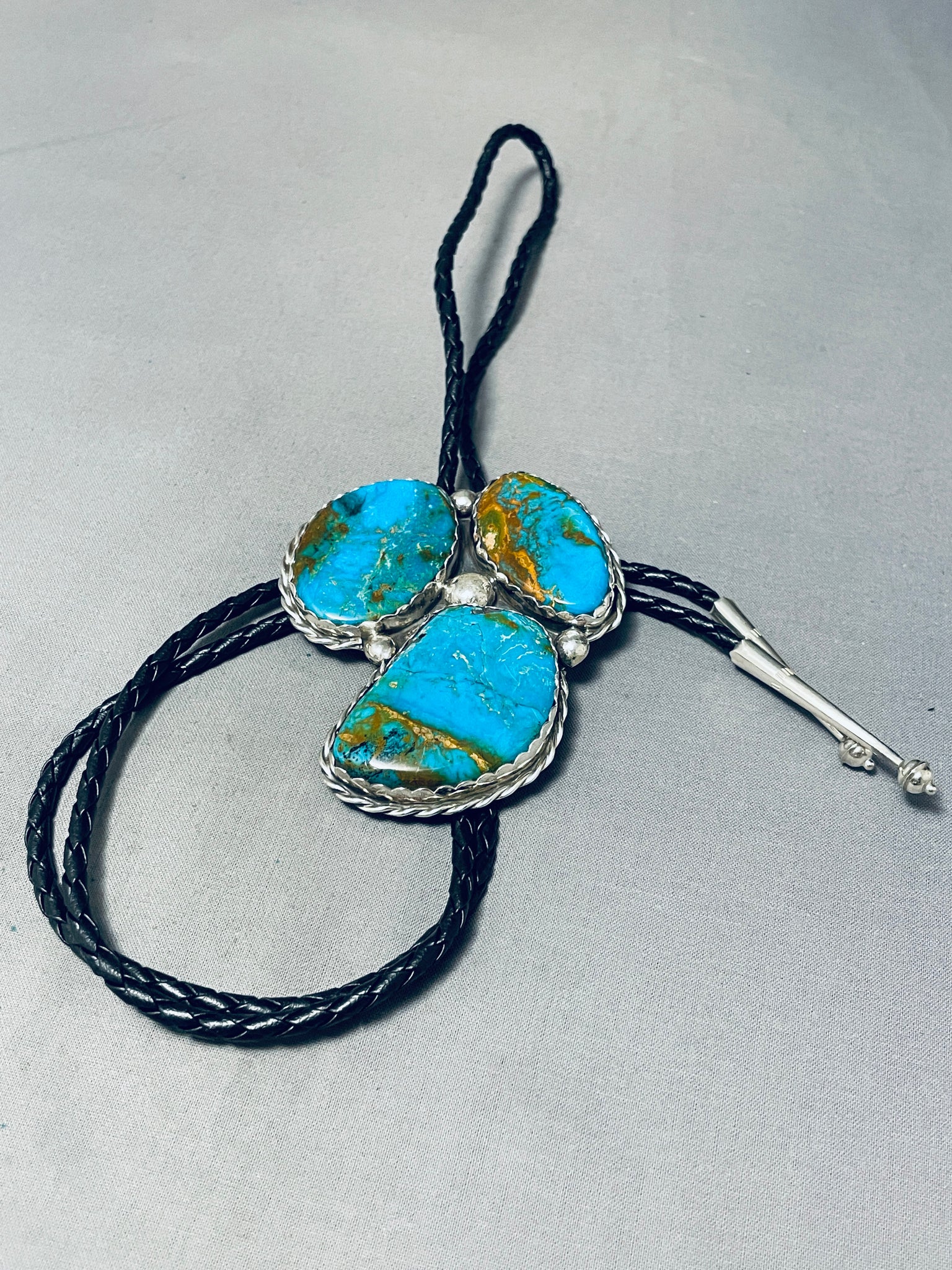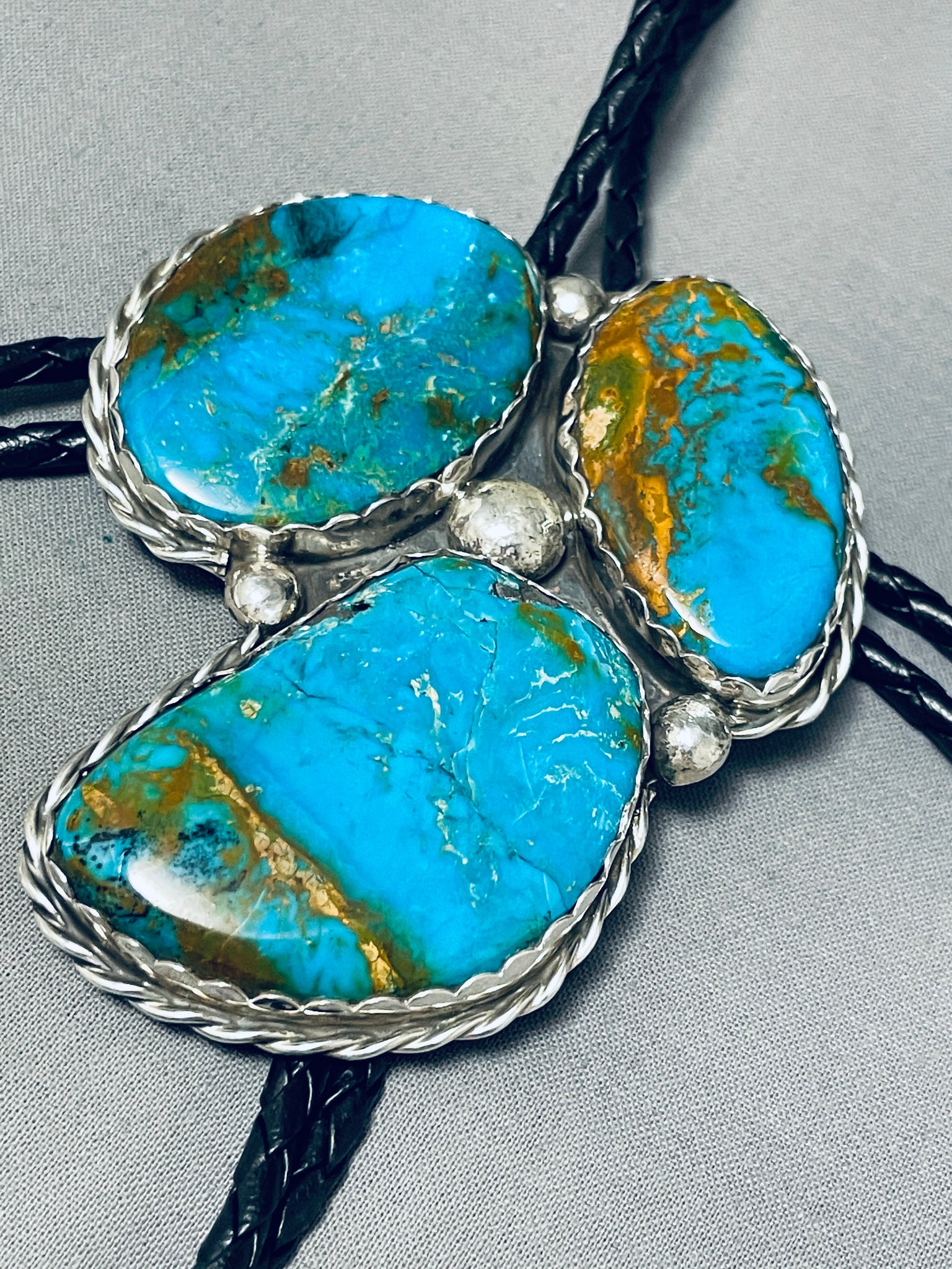 This is a superlative vintage Navajo large chunky turquoise silver bolo tie. This phenomenal bolo consists of three large chunky vibrant blue colored turquoise stones with amazing tan matrix. Surrounding each of the stones are marvelous thick silver coiled patterns. Located in the center of the stones are graduating large silver raindrops. I absolutely love the size of this bolo and the three stones. The bolo measures a whopping 3-1/4" X 2-3/4" and the largest stone measures a whopping 1-3/4" X 1-1/4". Resting at the bottom of the thick 42".black leather tie are wonderful long silver cones with stunning accenting silver beads. Signed by Navajo artist, Jer Cowboy. Sterling silver, marked. Cir. 1990's+. Sturdy 90 grams.