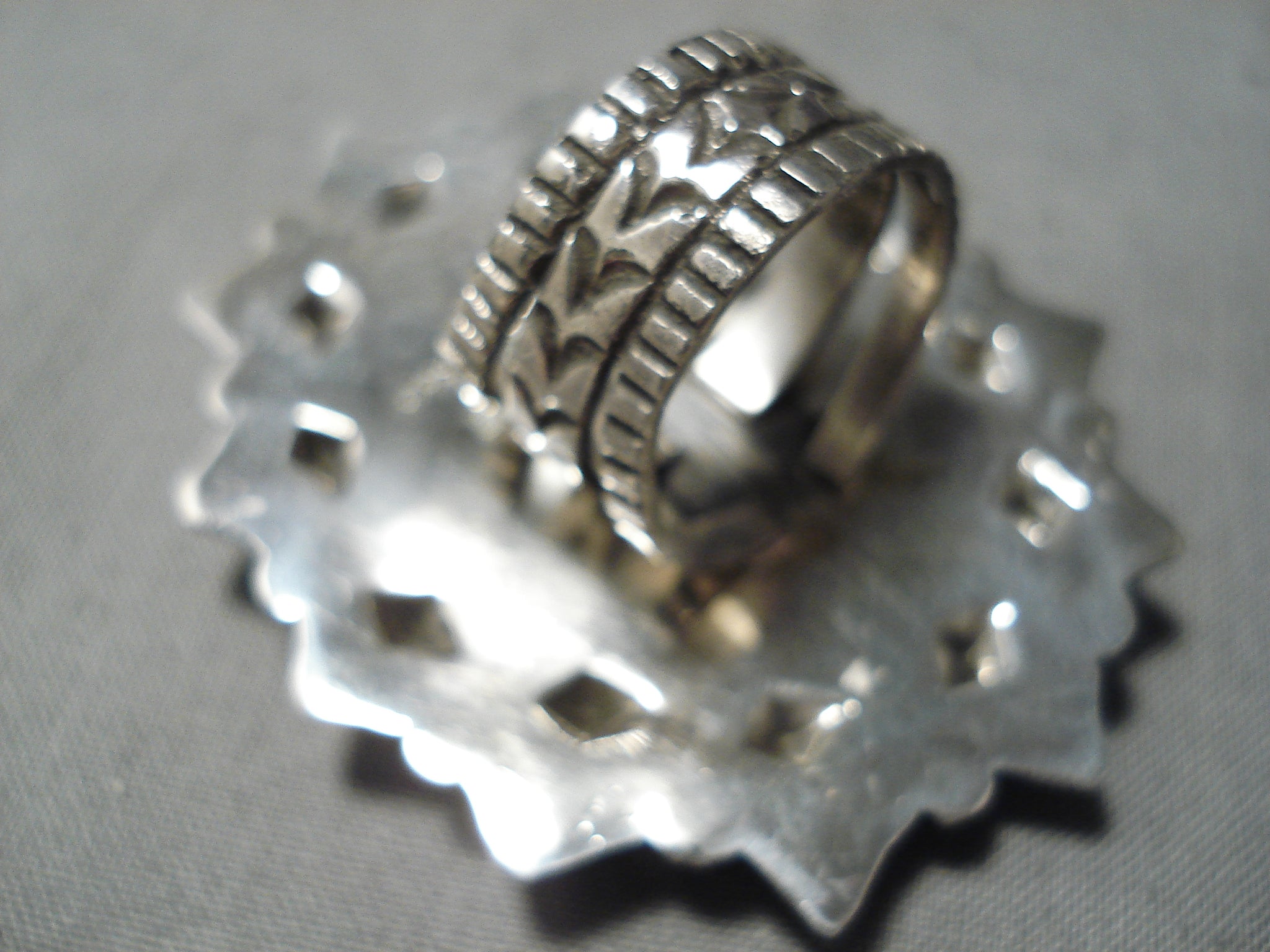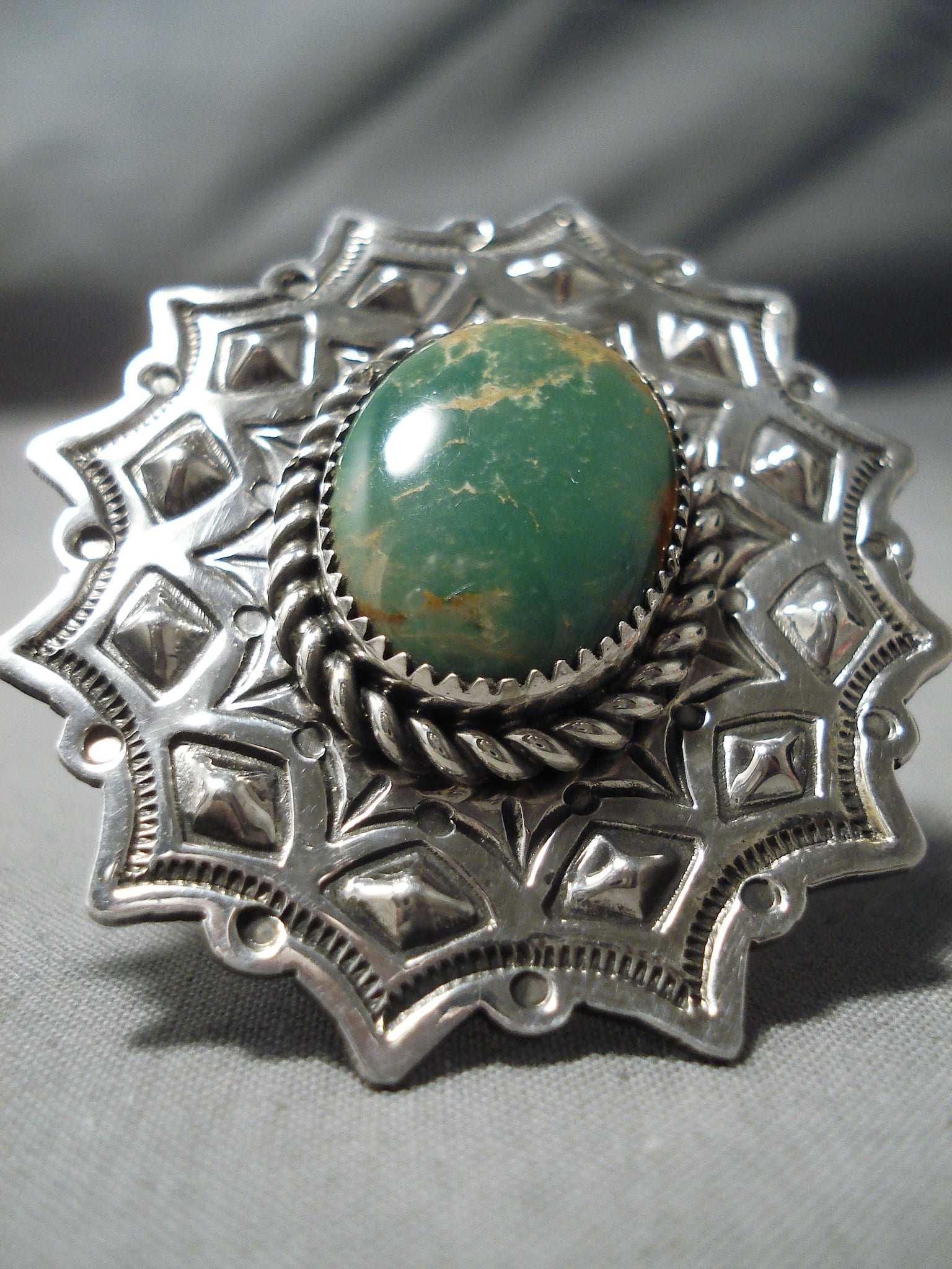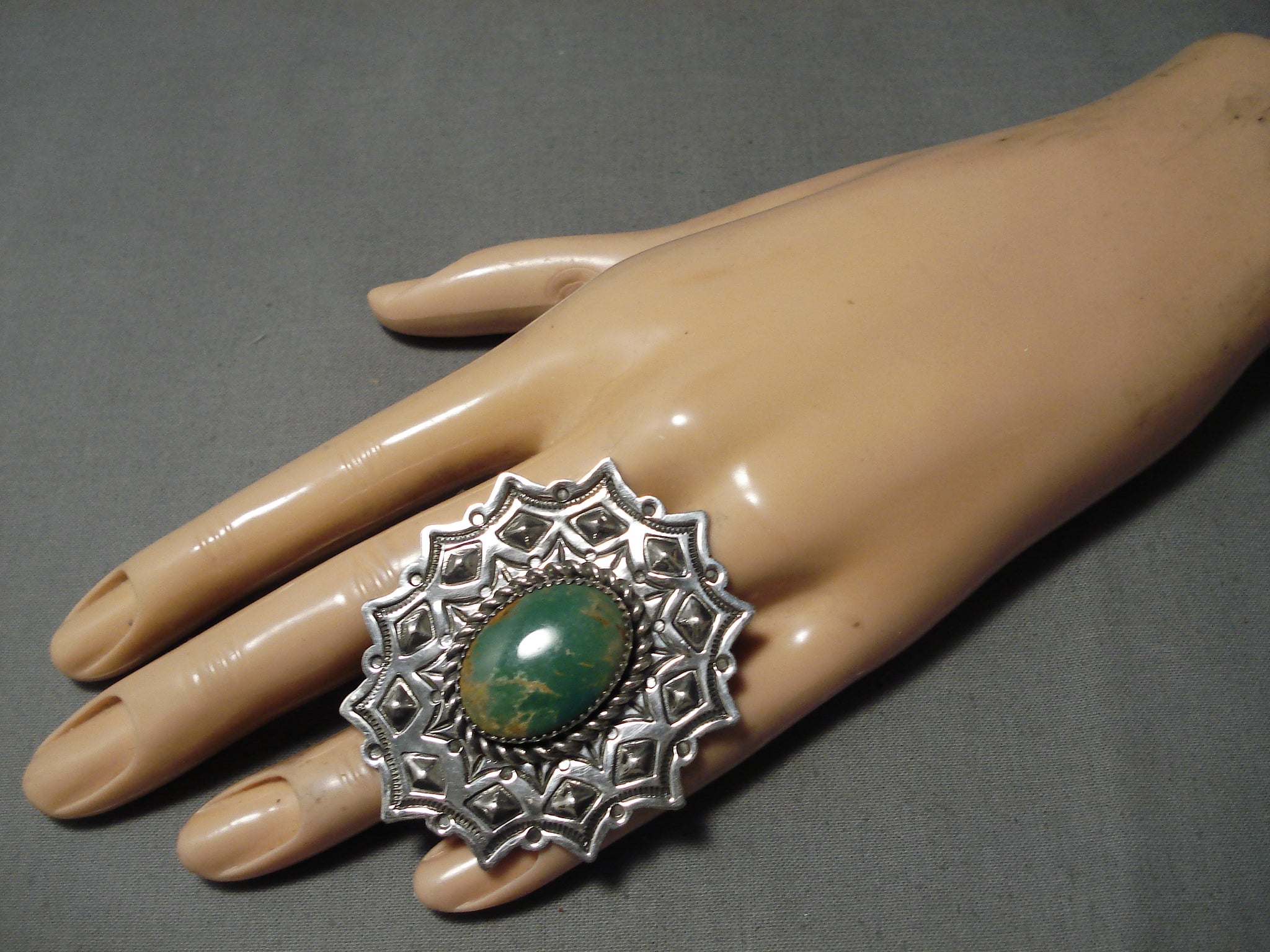 Colossal Native American Green Turquoise Sterling Silver Repoussed Ring
