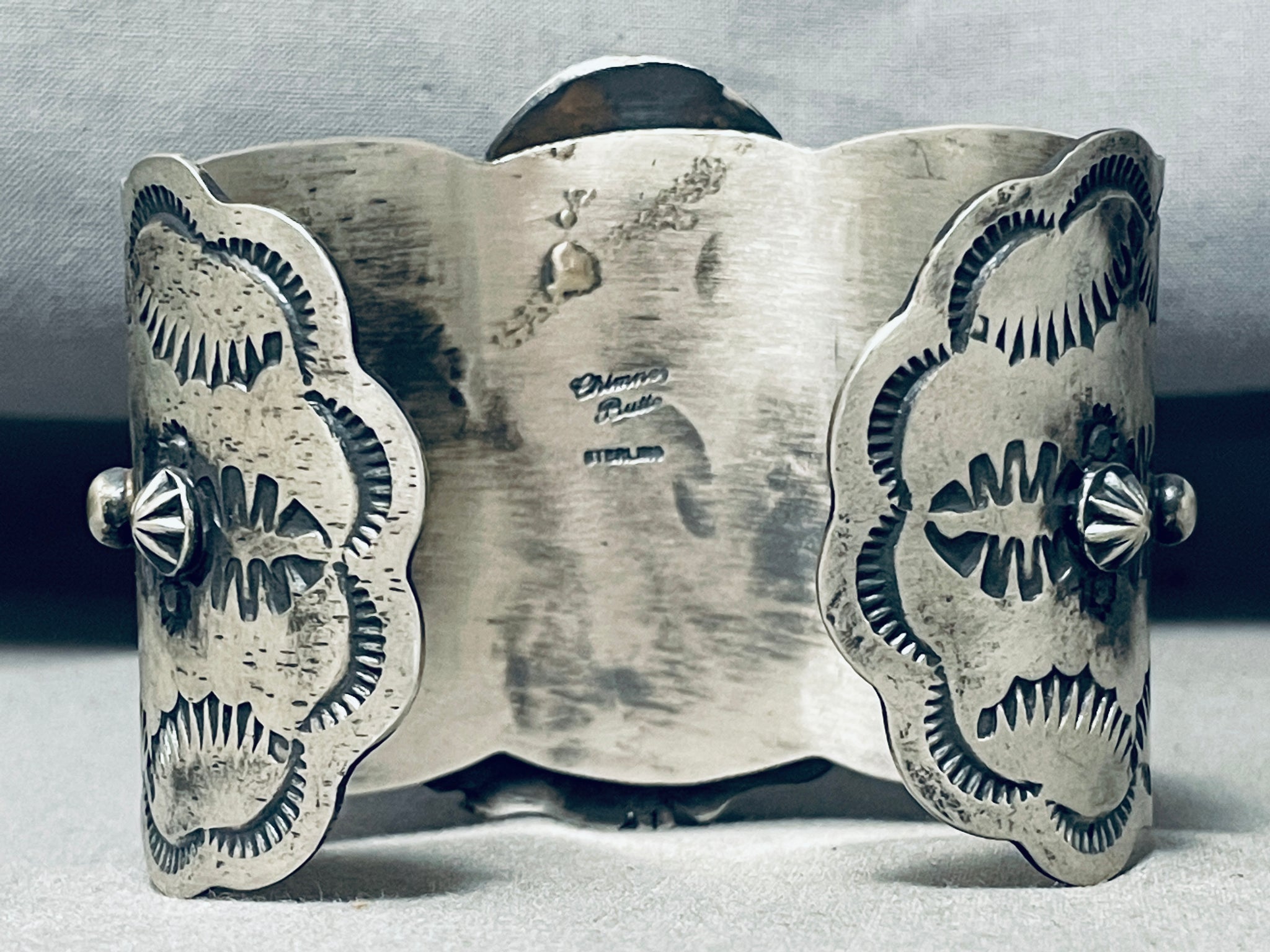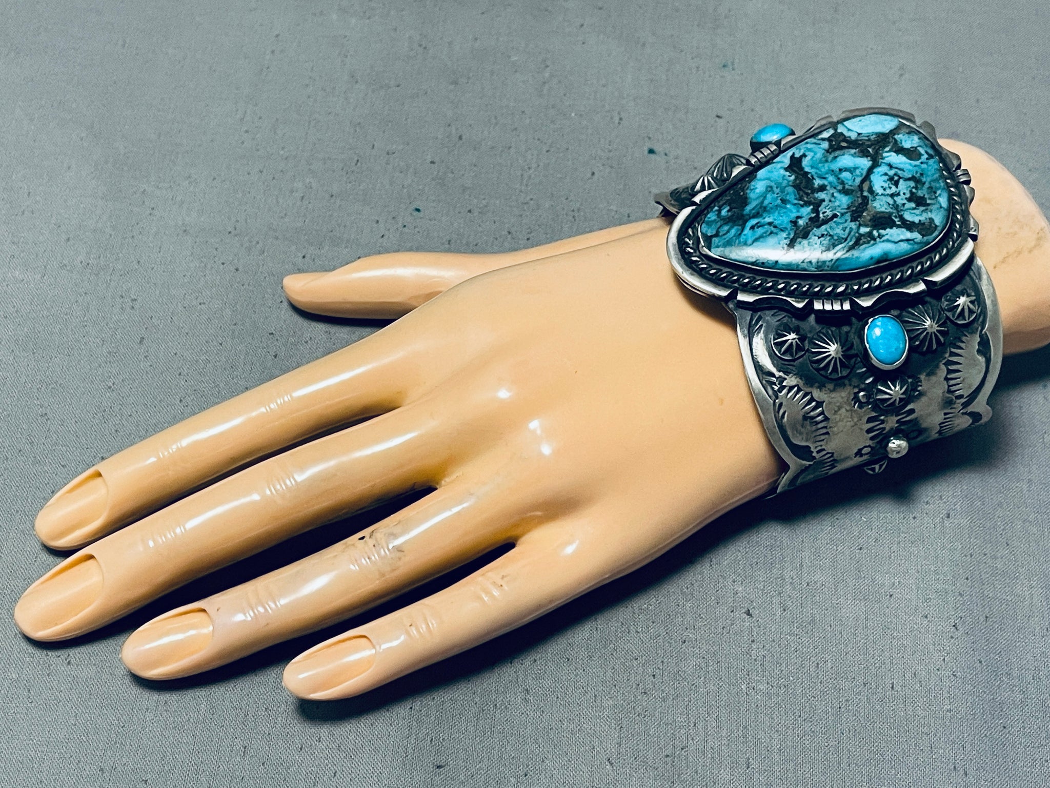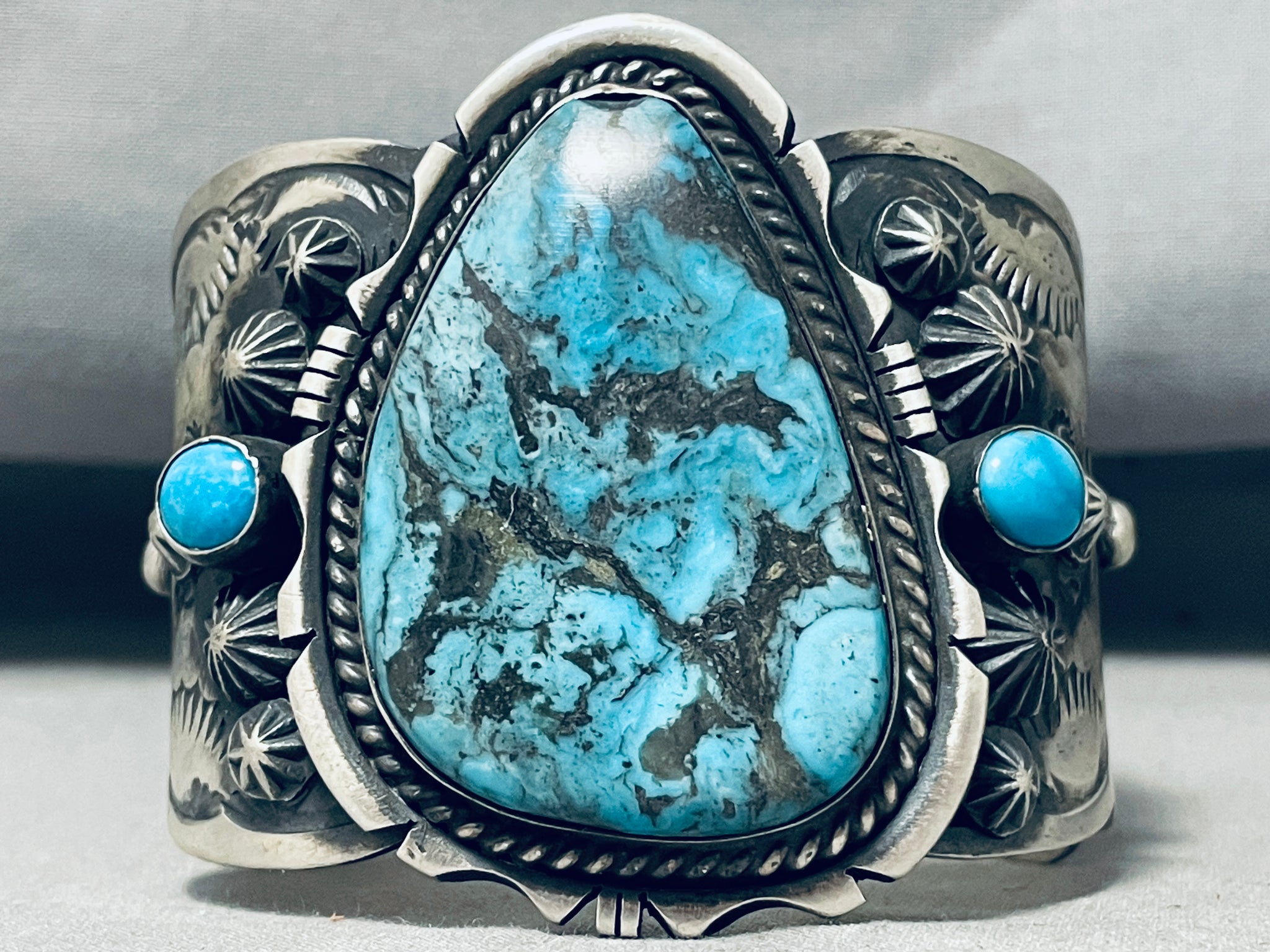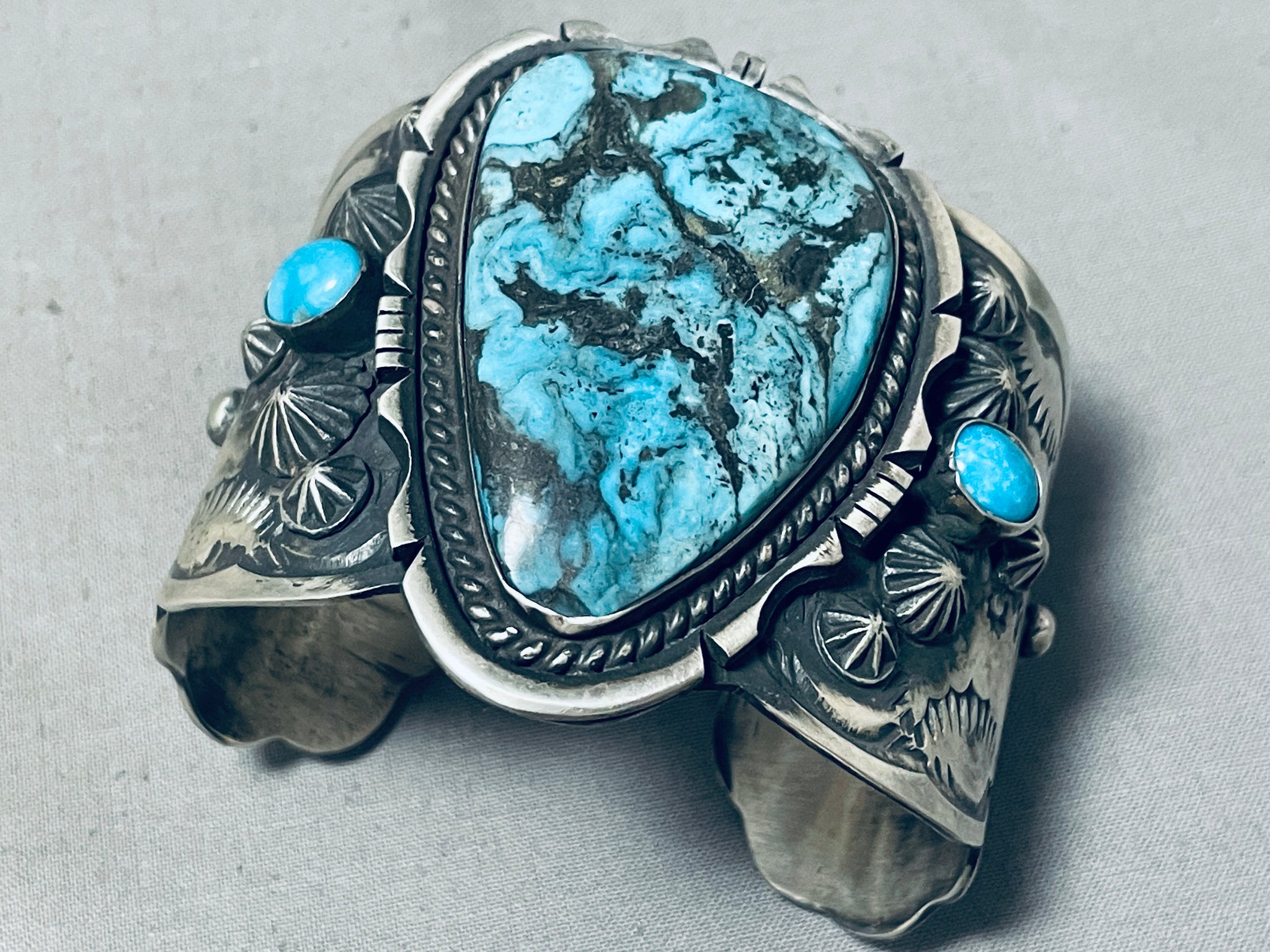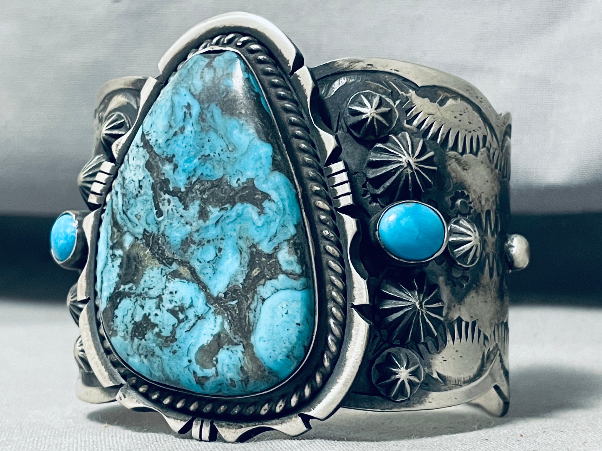 Colossal Native American Navajo Blue Diamond Turquoise Sterling Silver Repoussed Bracelet