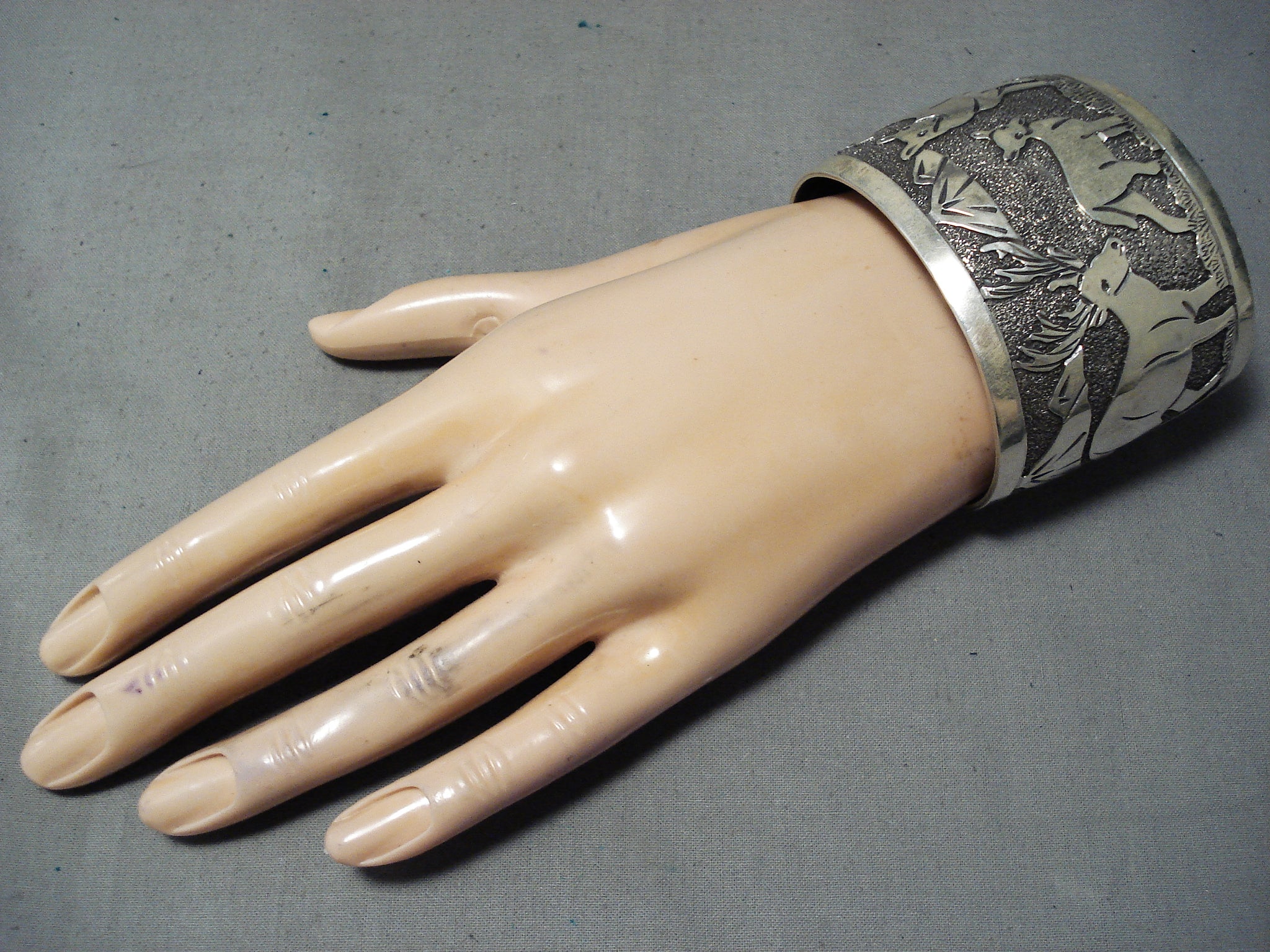 This is an incredible Navajo silver bracelet having an intricately handcarved silver storyteller scene all across the large handcarved solid silver cuff! Absolutely Incredible Piece! The width of the bracelet measures around 2". Signed by Navajo artist, Elaine Becenti. Sterling silver, marked. The inside end to end measures around 6" with an additional 1-3/8" gap. Sturdy 88 grams.