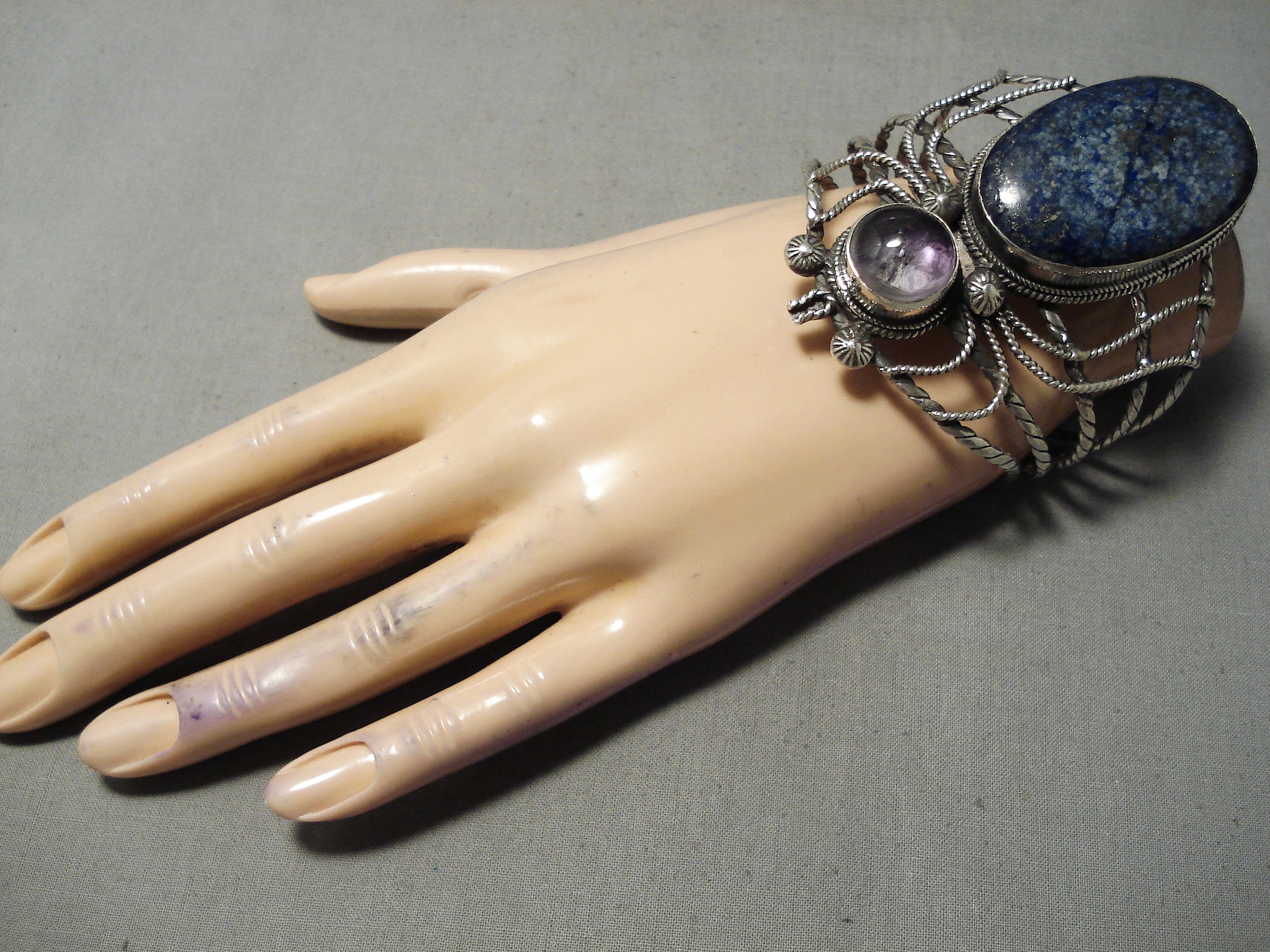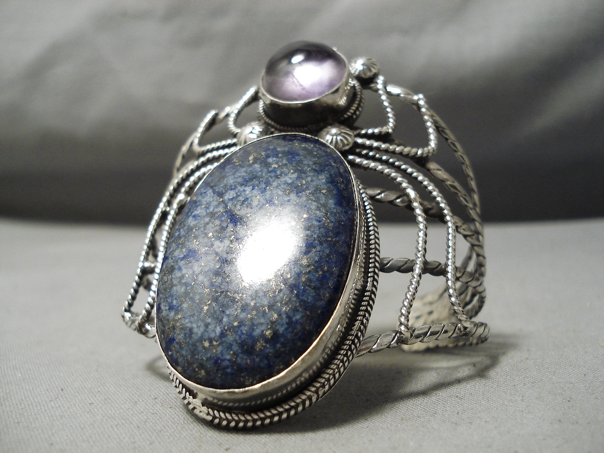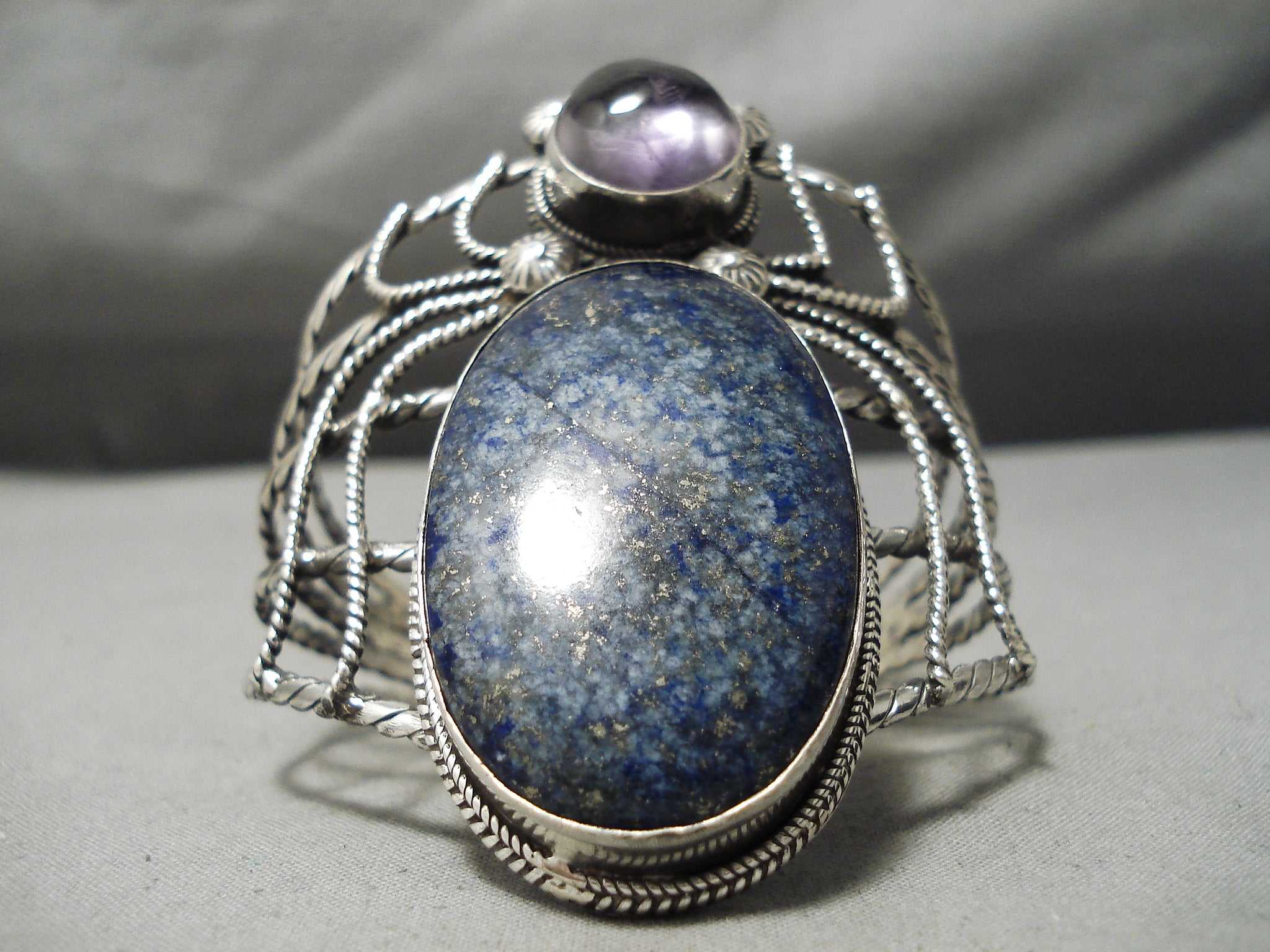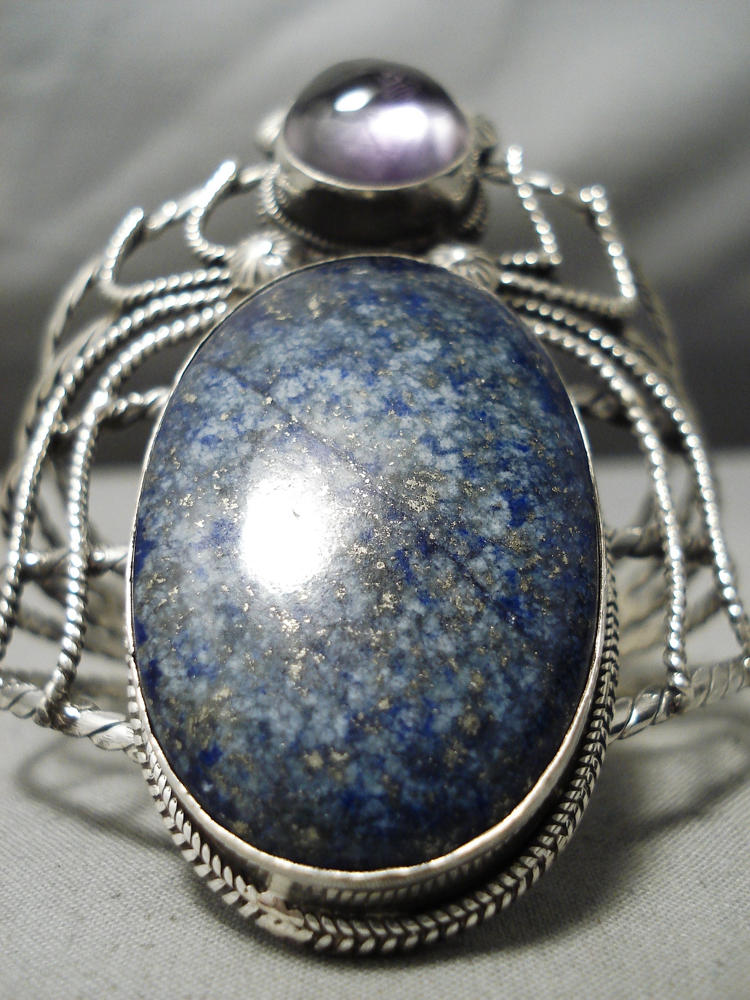 Colossal Vintage Native American Navajo Bug Lapis Amethyst Sterling Silver Bracelet