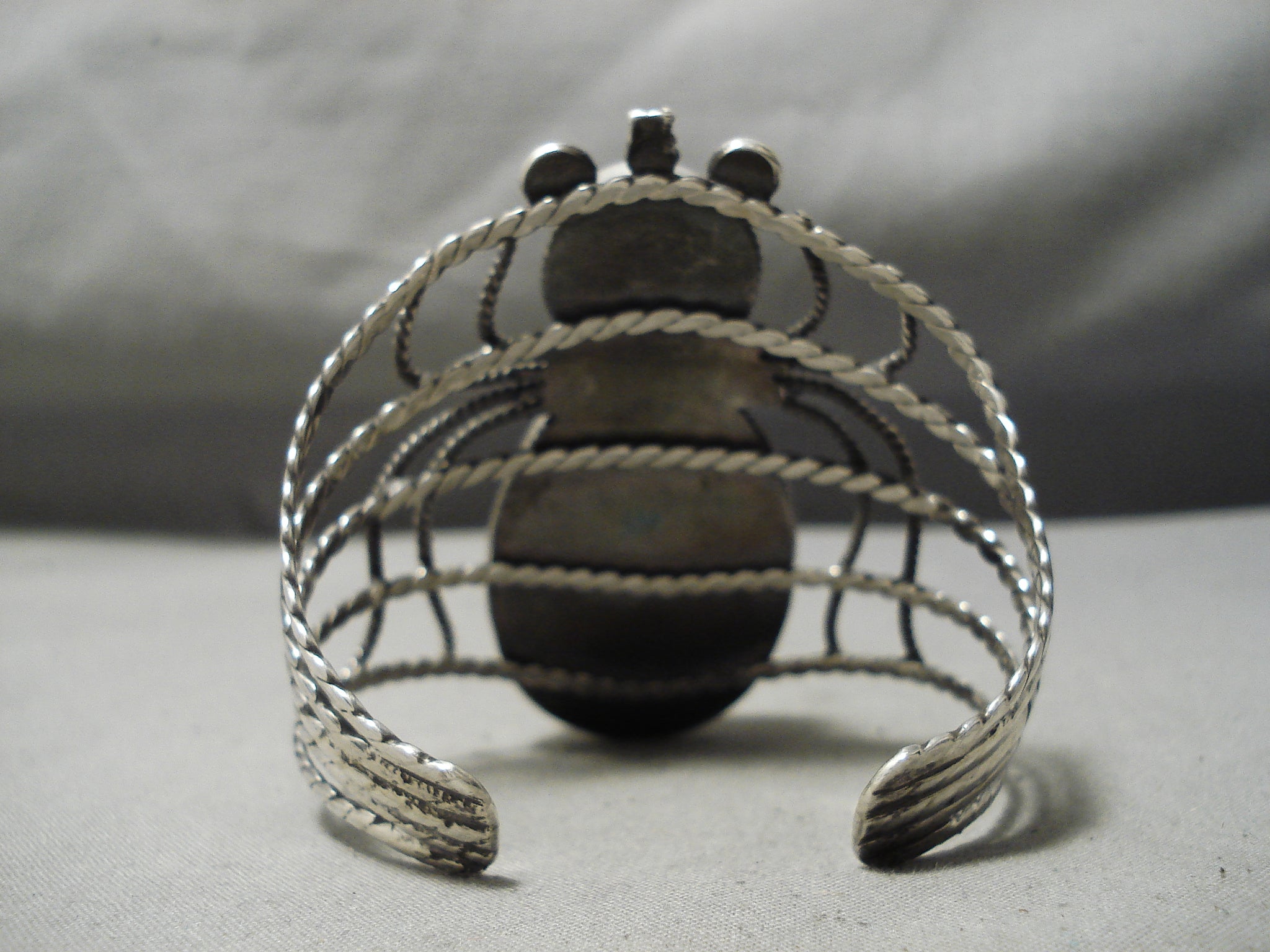 This is a magnificent vintage Navajo stone silver bug bracelet. This absolutely phenomenal bracelet contains a huge silver bug that consists of a large rounded amethyst and lapis stone. Check out those beautiful and intricate hand coiled silver legs that come out from the bug with accenting silver shells. The bug measures a mind blowing 3-1/8" X 1-1/4". The bracelet consists of a marvelous and wide five silver shank cuff with each shank being completely hand coiled from one end to the other. The largest stone measures around 1-3/4" x 1-1/8". The width of the bracelet measures around 2-5/8". Sterling silver. Cir. Mid century . The inside end to end measures around 5-3/4" with an additional 1" gap. Sturdy 85 grams.