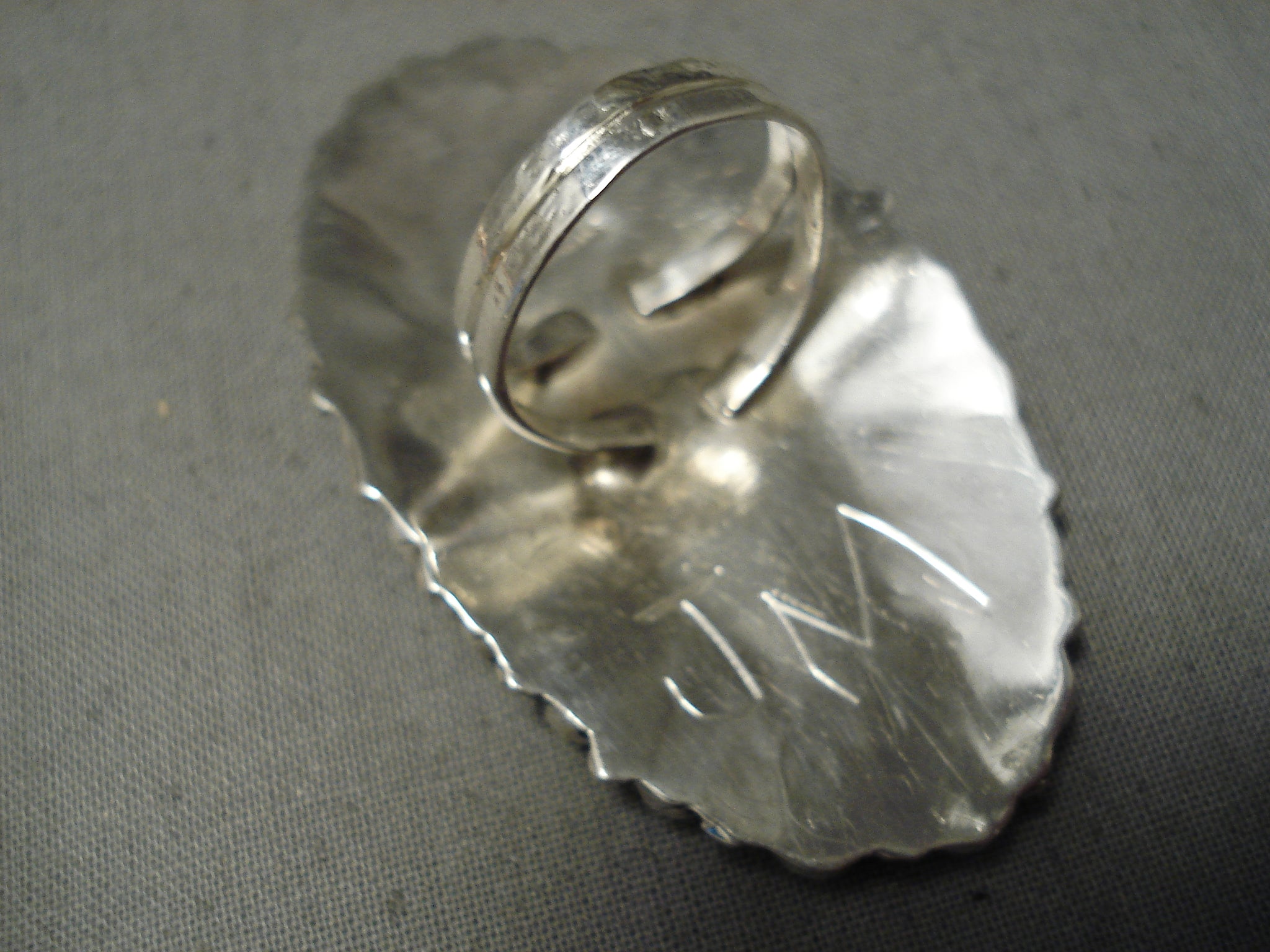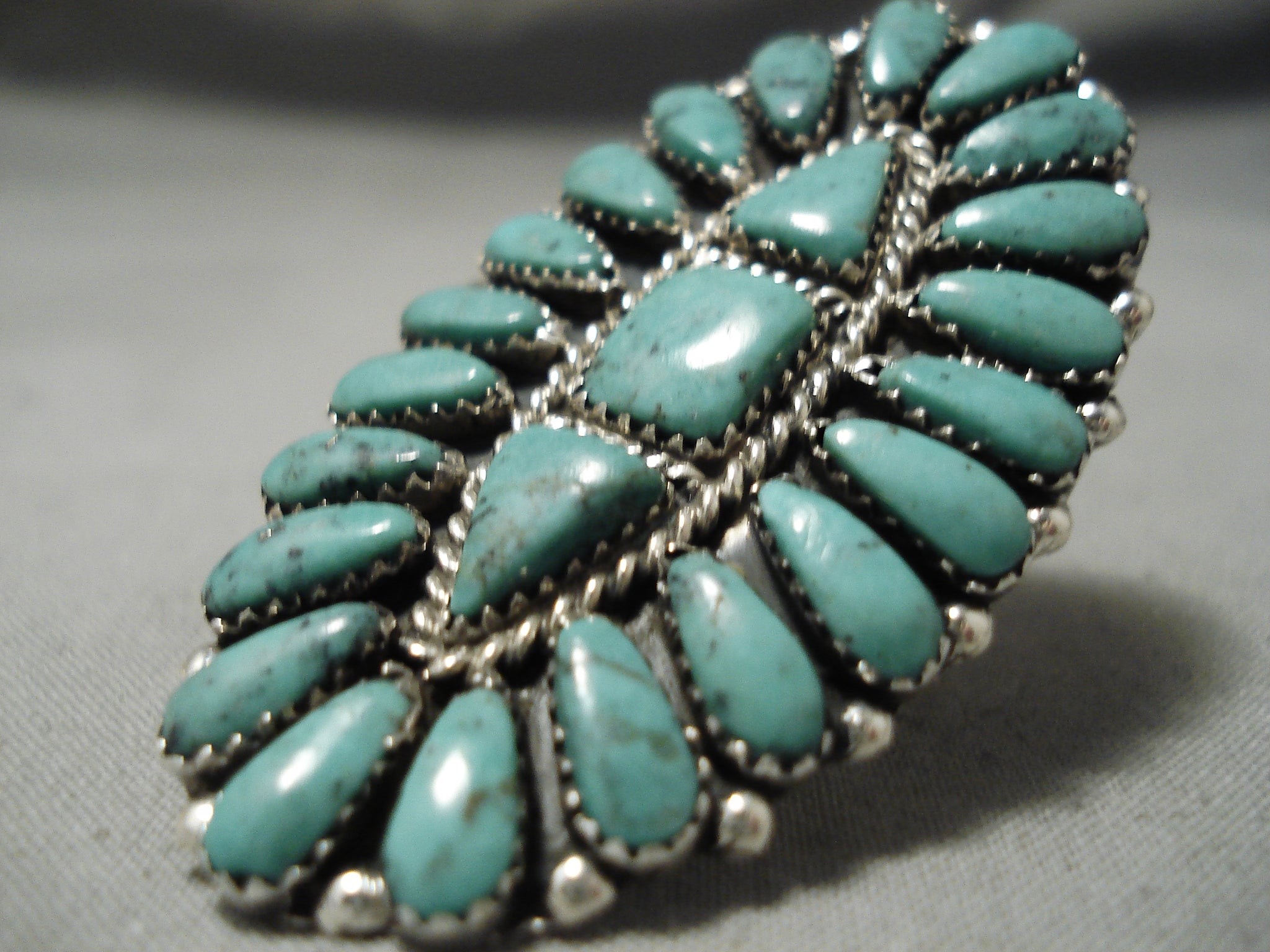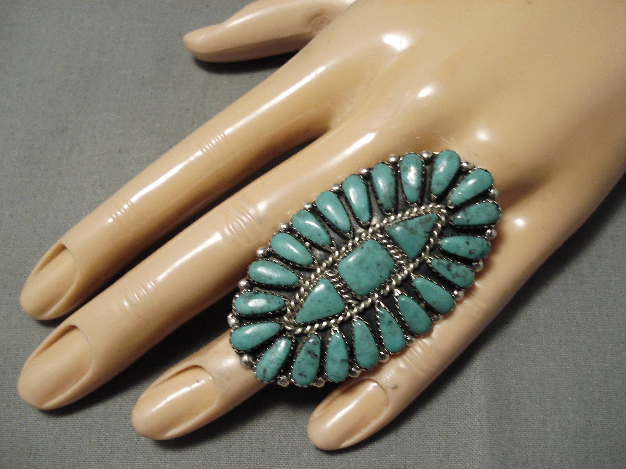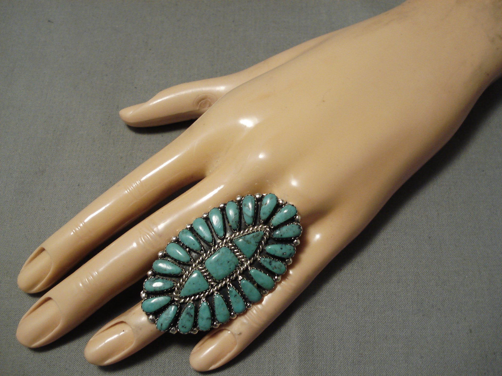 Colossal Vintage Native American Navajo Green Turquoise Sterling Silver Cluster Ring Old