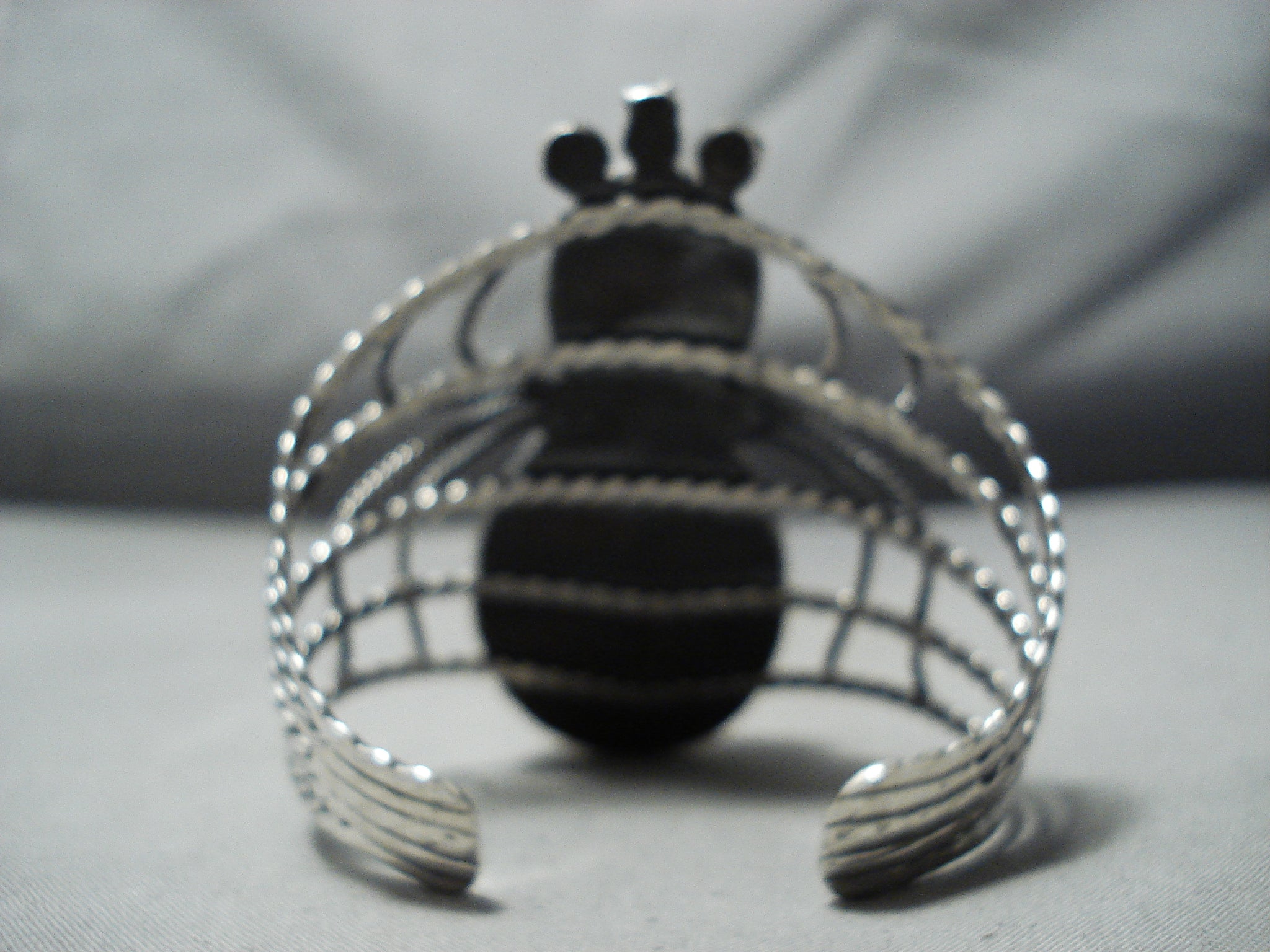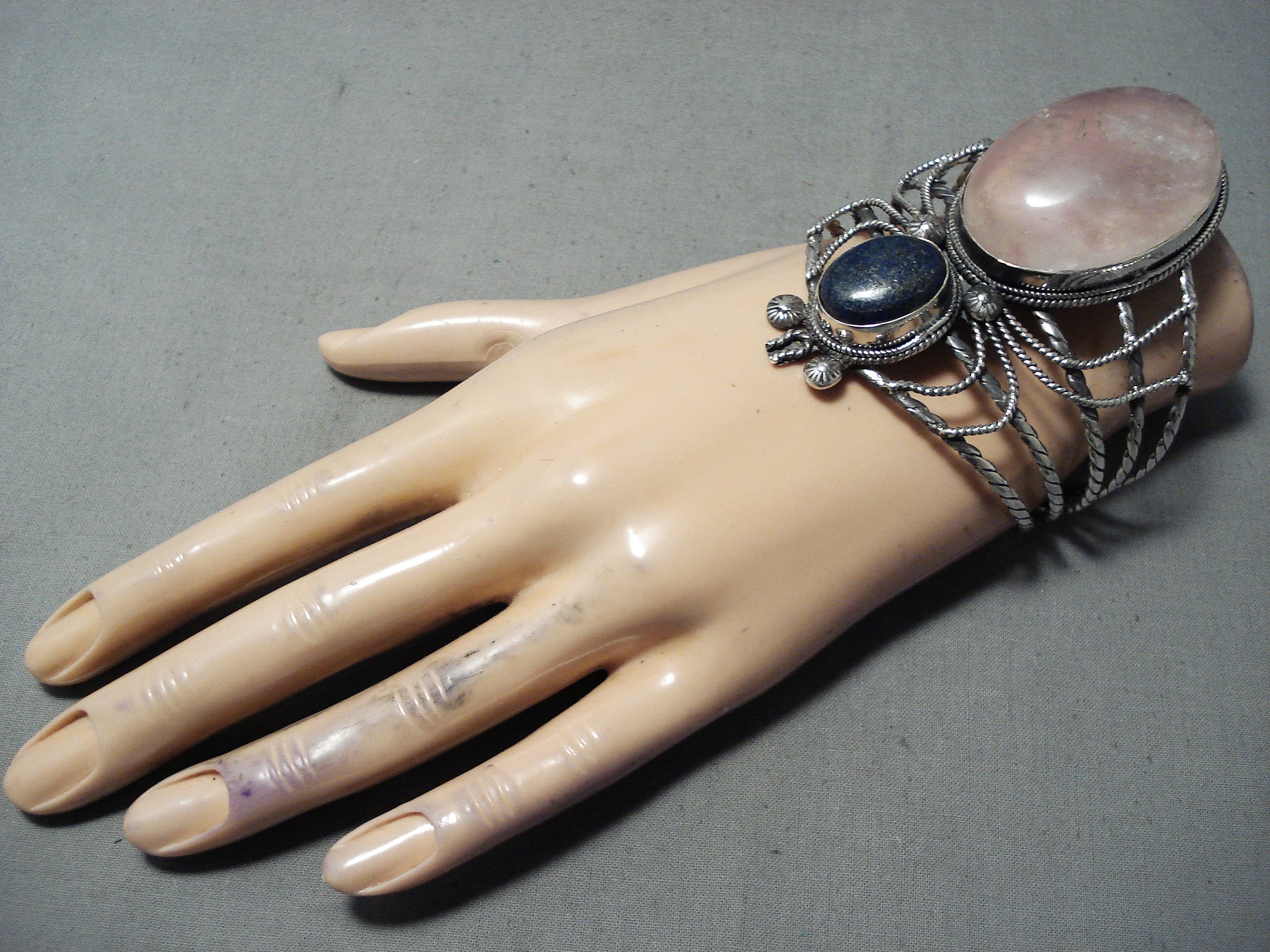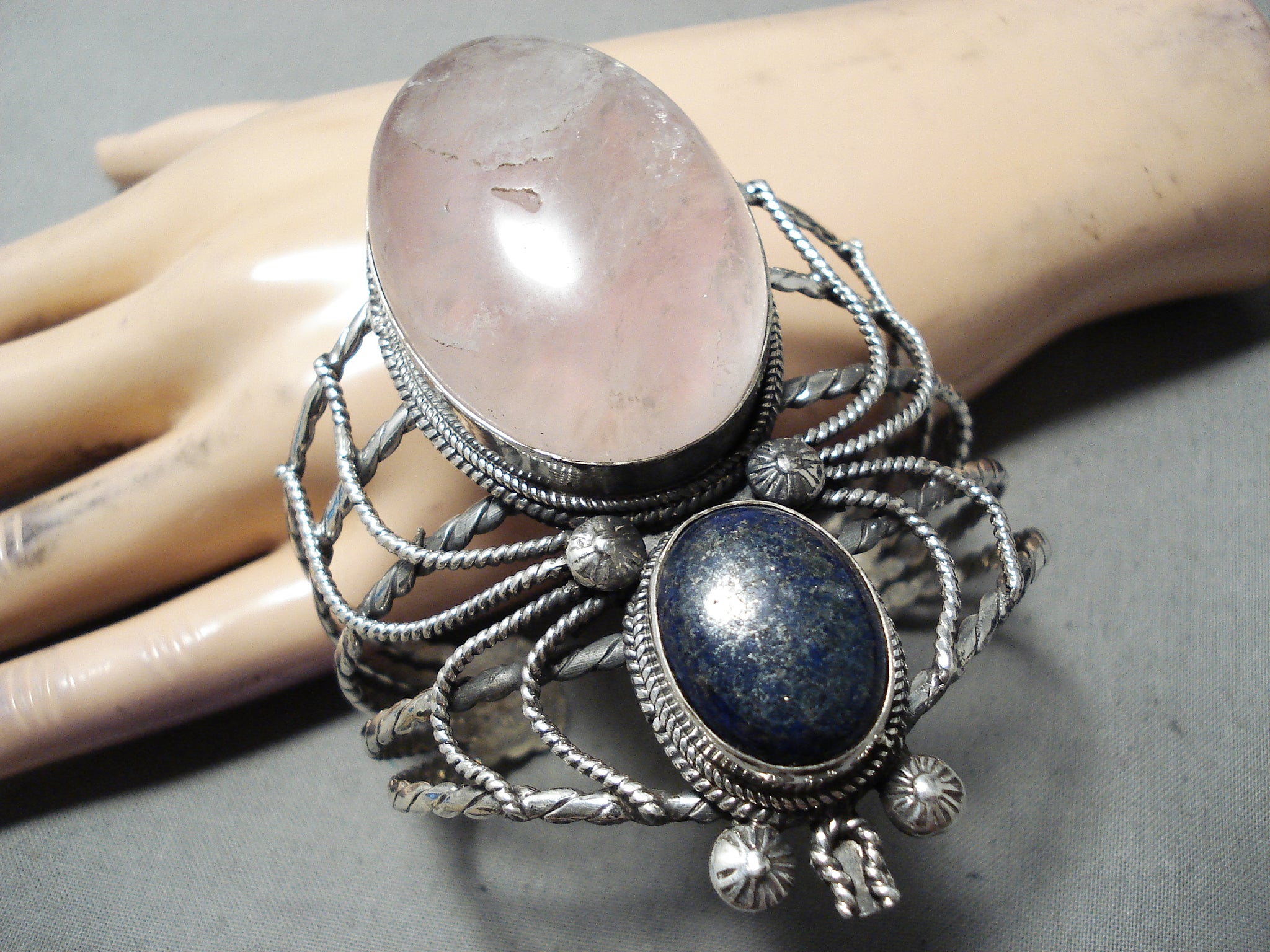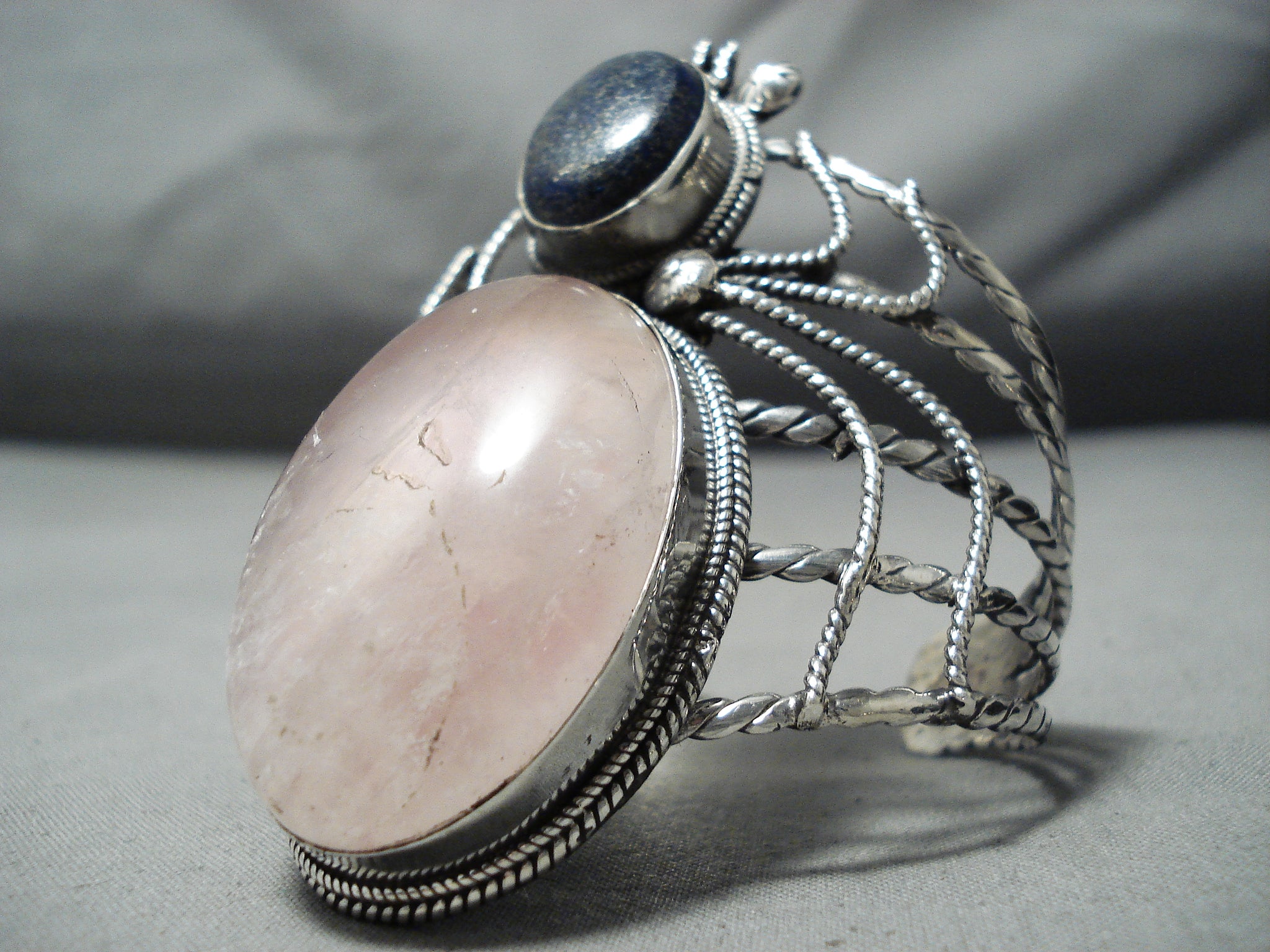 Colossal Vintage Native American Navajo Rose Quartz Lapis Bug Sterling Silver Bracelet