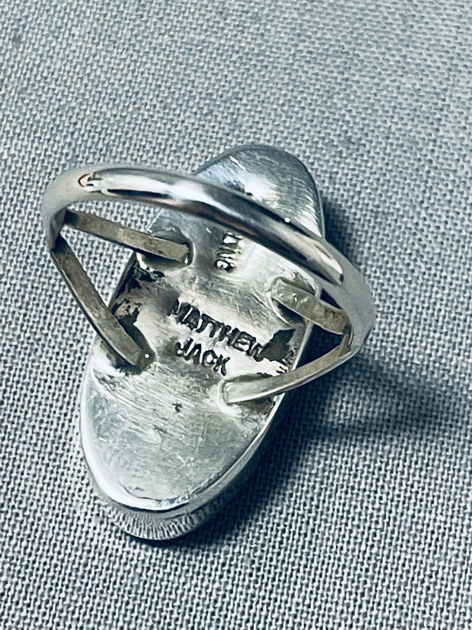 This is a fabulous Navajo inlaid sun inlay silver ring. The ring contains outstanding detailing and intricacy. The inlay consists of onyx, coral and opal. Just a beautiful silver ring. The ring face measures around 1" x 1/2". Signed by Navajo artist, Matt Jack. The ring size is around 7. Cir. 1970's+. Sterling silver, marked. Sturdy 4 grams.
